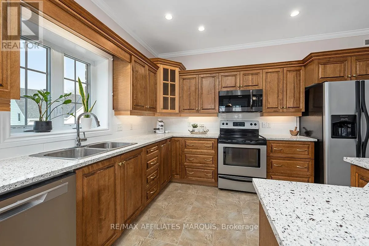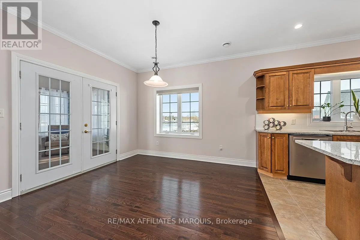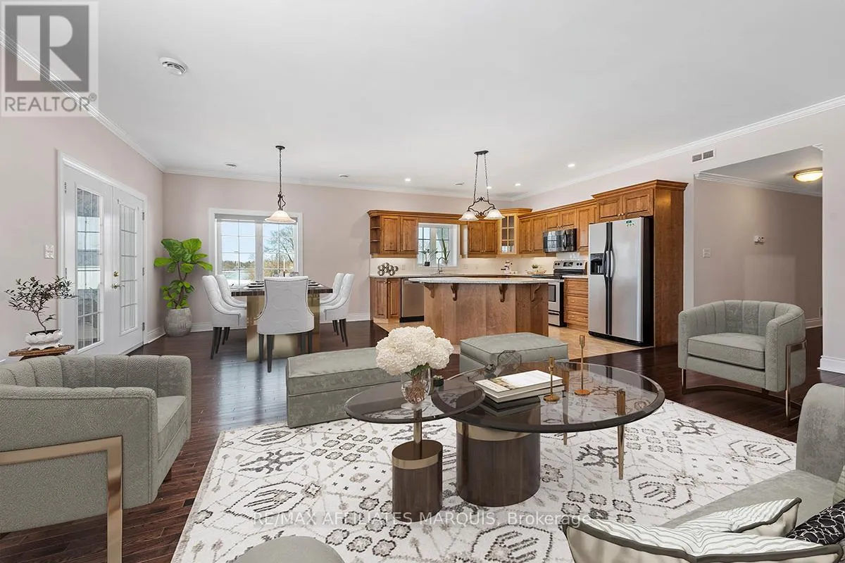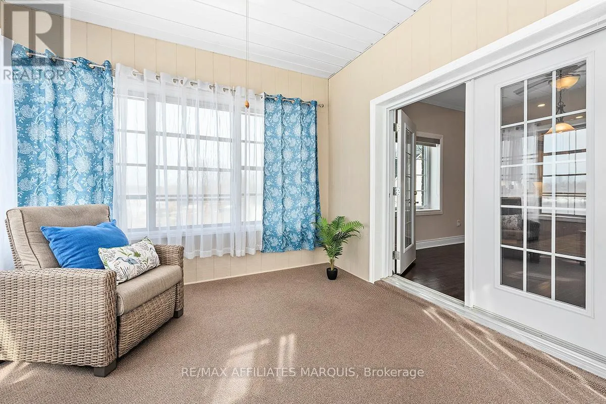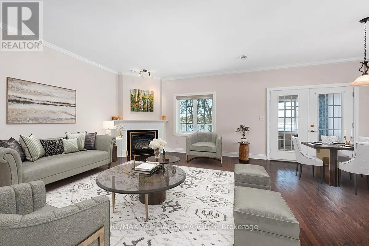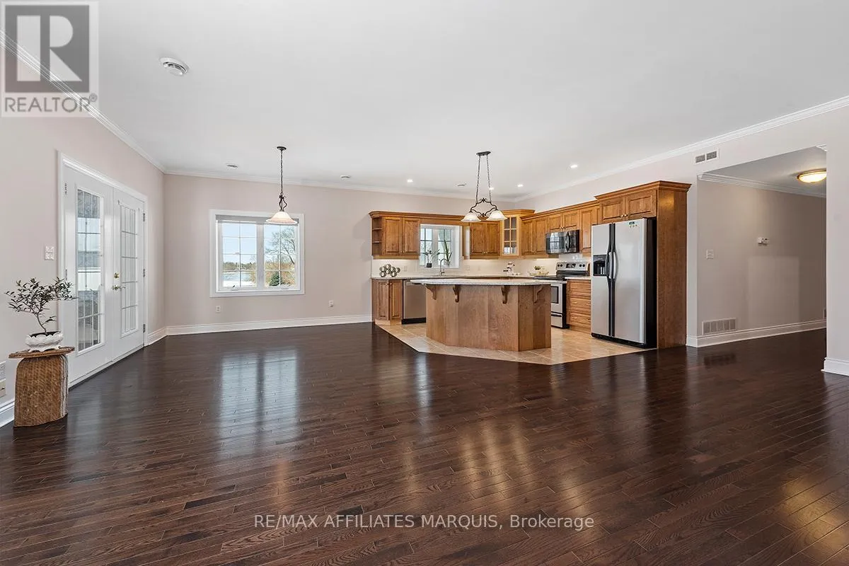Cross Streets: Albert and Old Slys. ** Directions: From Merrickville take Hwy 43 into Smiths Falls which turns into Queen street. Enjoy refined riverside living overlooking the beautiful Rideau River in the exclusive "Between the Locks" community. Set along the historic Rideau Canal (a UNESCO World Heritage waterway), this oversized executive apartment offers a rare combination of space, quality construction, and direct waterfront lifestyle. The bright, open-concept layout features high ceilings and large windows oriented toward stunning river views. A custom solid wood kitchen with generous cabinetry, pantry cupboard, quartz countertops, and a large island connects seamlessly to the living and dining areas. The living room includes a gas fireplace, while the impressive primary suite offers a walk-in closet and private ensuite. Carpet-free finishes include engineered hardwood and ceramic flooring, with in-floor heating in tiled areas. Additional features include ensuite laundry, on-demand hot water, appliances included, and a spacious 147 sq ft three-season room overlooking the river, perfect for morning coffee or evening sunsets. Built with Nudura insulated concrete form construction, the building provides excellent soundproofing, durability, and economical heating. Residents enjoy landscaped waterfront grounds with outdoor lifestyle amenities including picnic area, kayaks, garden space, and a new dock arriving Summer 2026. Directly across the river is Lower Reach Park, offering tennis courts, walking paths, and one of the best spots in town for fireworks. Parking for one vehicle included. Professional property management, foyer security lighting, and snow removal provided. Steps to parks, shops, restaurants, and the walkable downtown of Smiths Falls, with convenient access to Ottawa. Waterfront living without the high-rise apartment feel. Water included, heat and hydro are the in addition to. (id:27476)