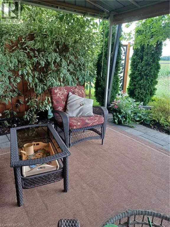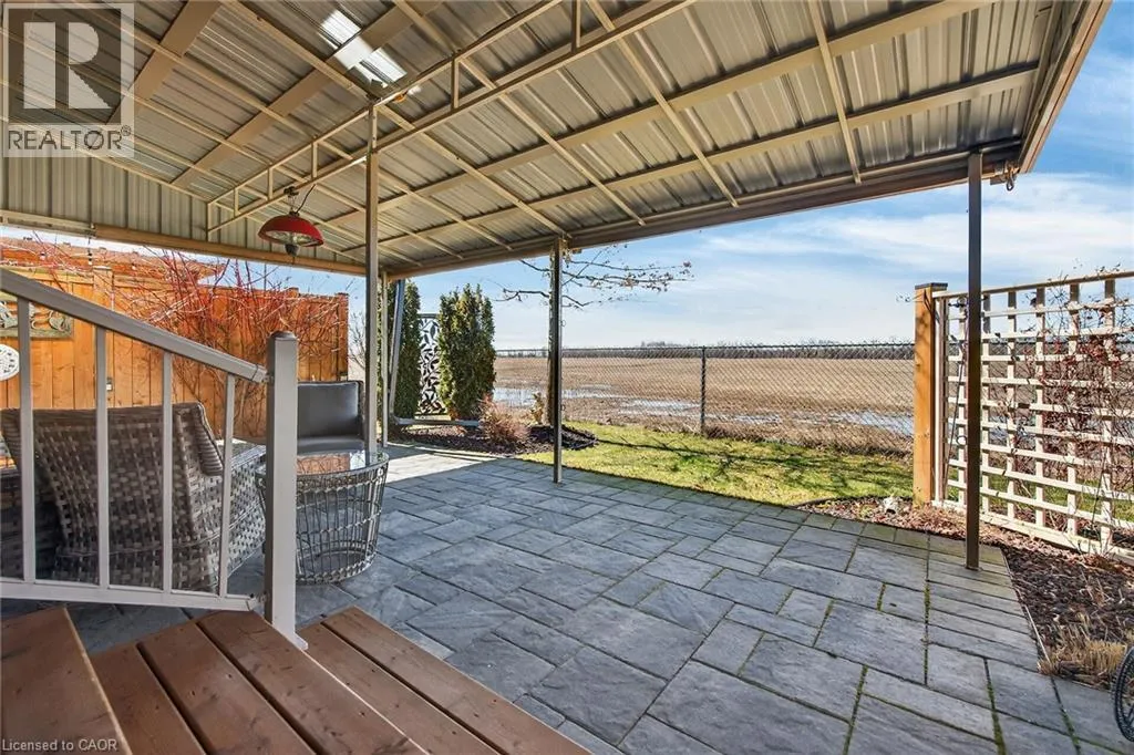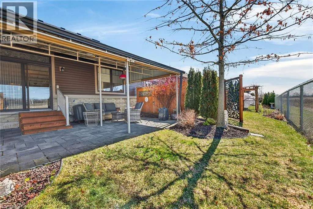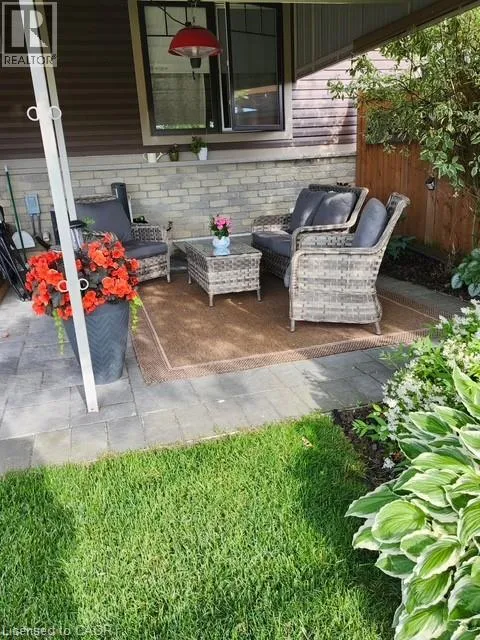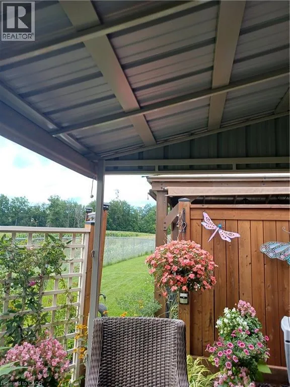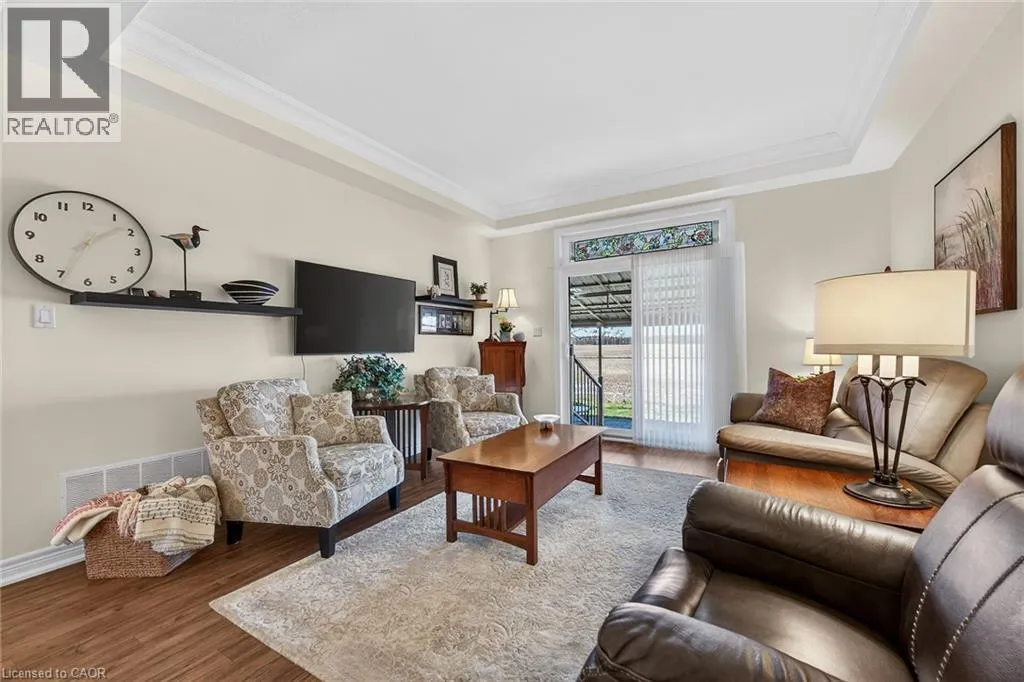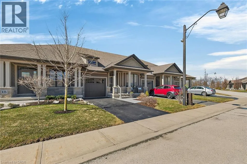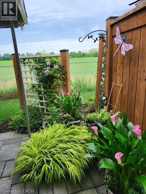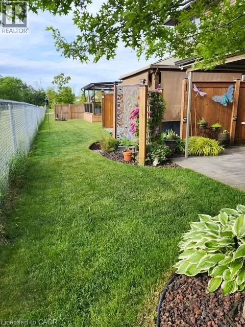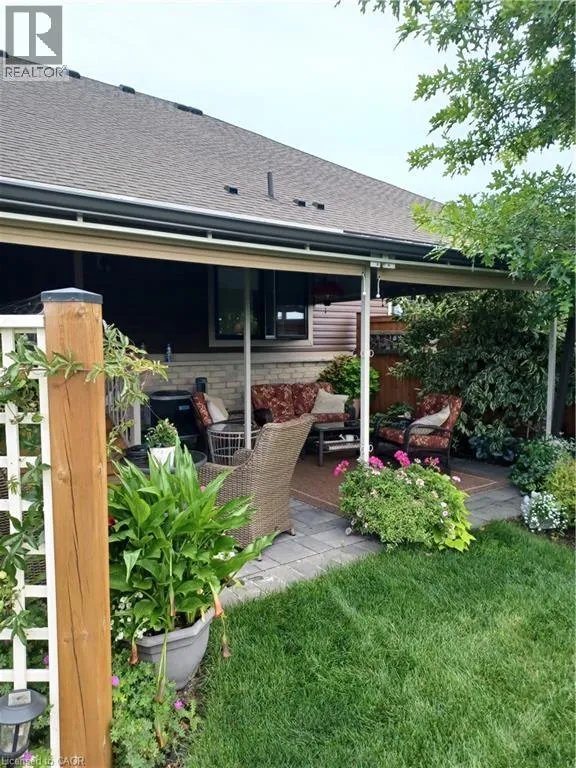 From HWY 20, south on Wade Road to Golden Acres Drive. West on Golden Acres to Oakdale Blvd. Follow Oakdale (turns into Manorwood). Right onto Forestview Court. Tucked away in a private cul-de-sac enclave in Smithville, this stunning freehold bungalow townhome features peaceful living with breathtaking panoramic sunset views year-round over open farm fields. Enjoy your own quiet outdoor retreat on the private rear patio, complete with a hard-covered gazebo, perfect for relaxing or entertaining. Inside, the home features 9-foot ceilings, and a bright, open-concept layout, enhanced by beautiful, upgraded lighting throughout. The gorgeous kitchen is a true focal point, showcasing a large island, coffee station, walk-in pantry, soft-close cabinetry, and under-cabinet lighting, ideal for both everyday living and hosting. Premium Torlys laminate flooring flows seamlessly throughout the main living areas. The living room features a coffered ceiling with patio doors to the private rear patio. With 2 bedrooms and 1.5 bathrooms, this home is thoughtfully designed for comfort and functionality. The primary suite is a true retreat, featuring a stylish 3-piece ensuite with a glass shower along with soundproof insulation between the primary bedroom and living area for added privacy. Additional highlights include main floor laundry and convenient inside entry from the single-car garage. A perfect blend of low-maintenance living, modern upgrades, and serene surroundings. This is a rare opportunity in a sought-after community. Minutes to local amenities, schools and park. Small road fee includes landscaping/maintenance/snow removal of common area as well as irrigation system and visitor parking. (id:27476)