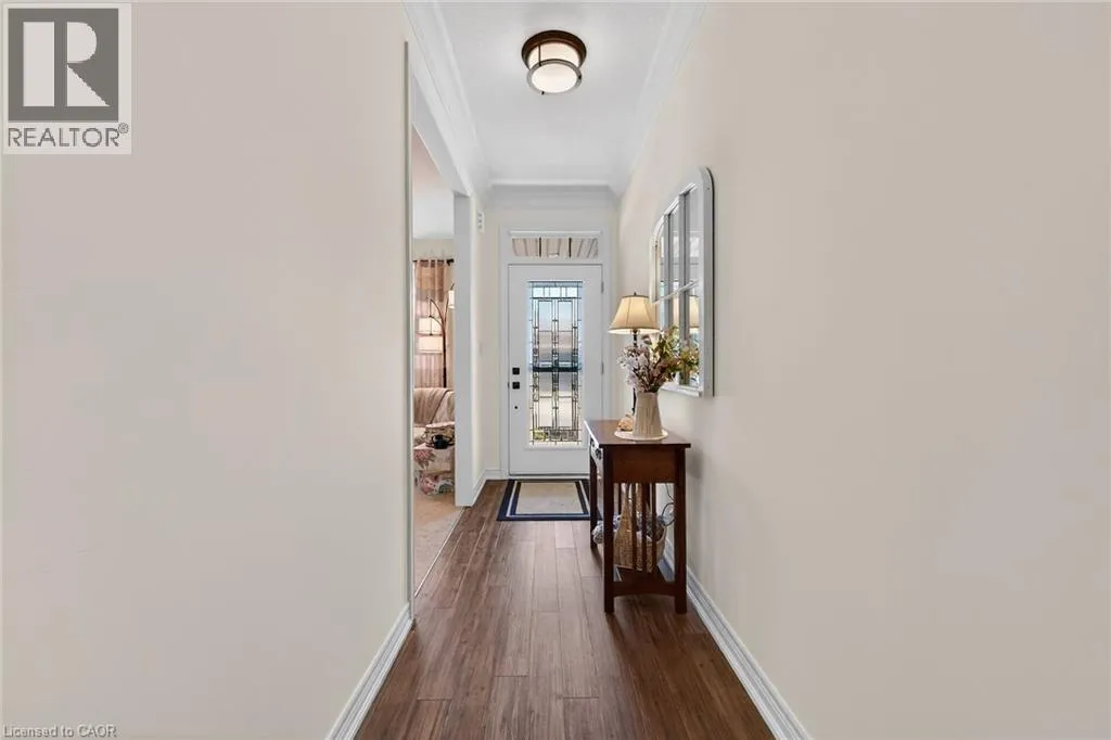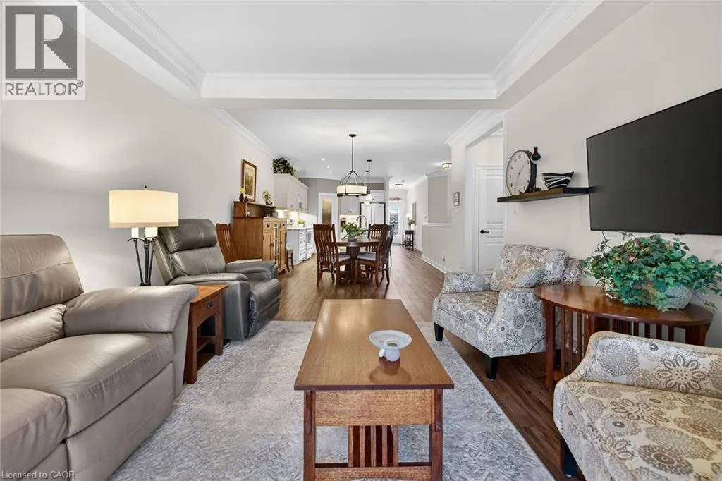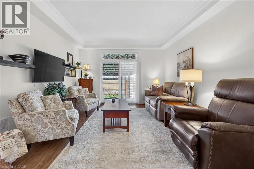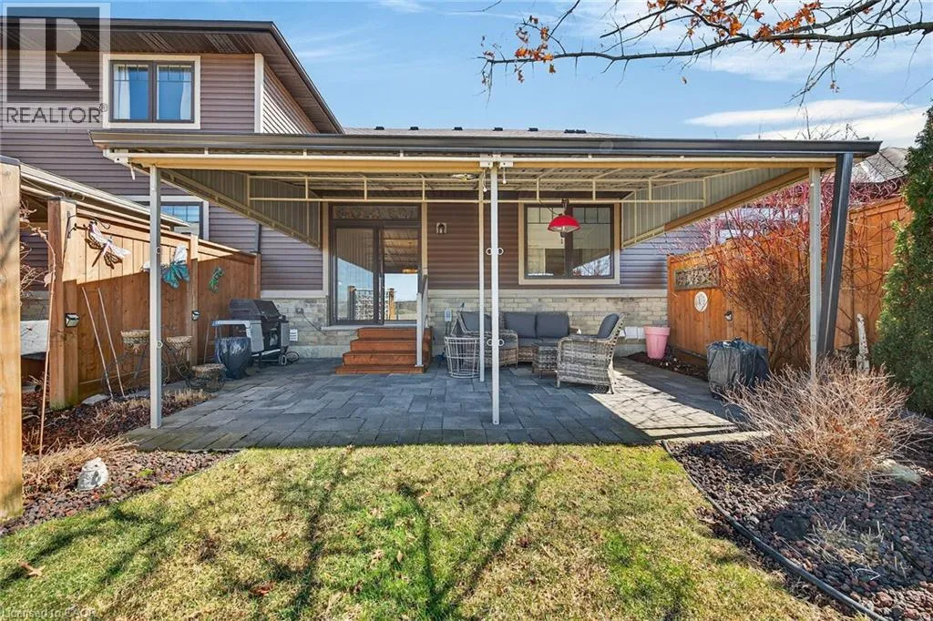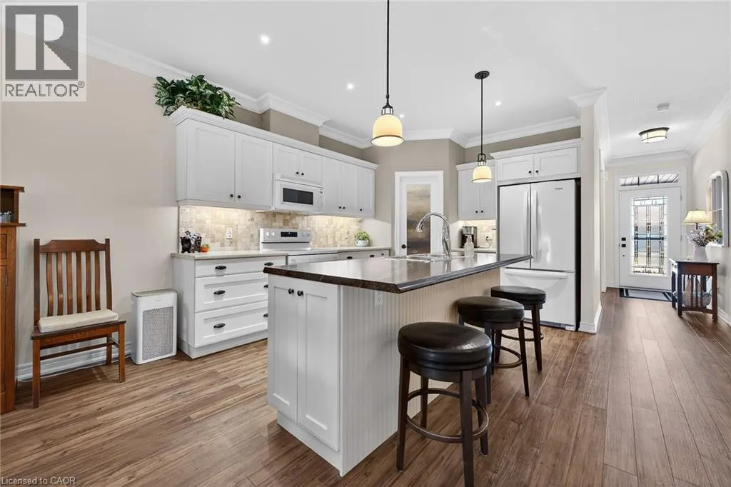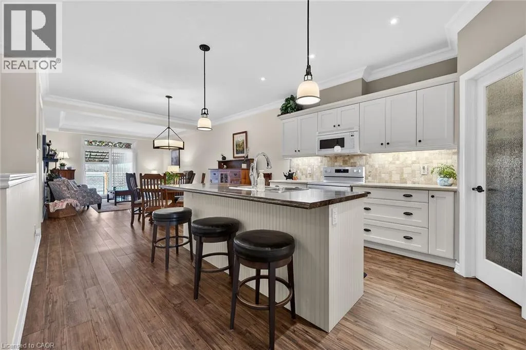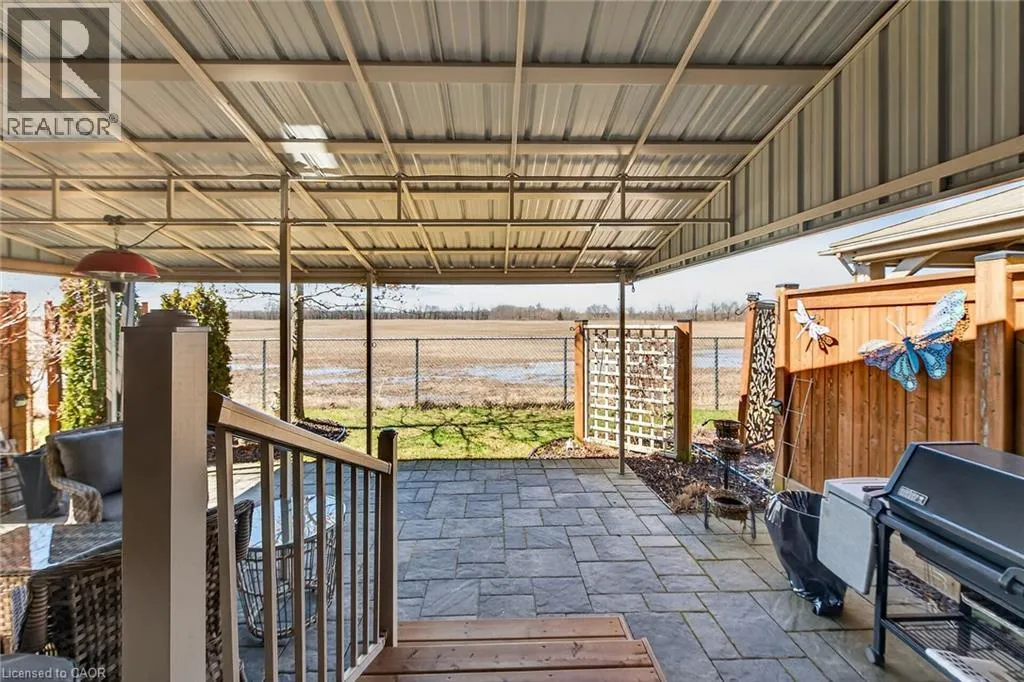 From HWY 20, south on Wade Road to Golden Acres Drive. West on Golden Acres to Oakdale Blvd. Follow Oakdale (turns into Manorwood). Right onto Forestview Court. Tucked away in a private cul-de-sac enclave in Smithville, this stunning freehold bungalow townhome features peaceful living with breathtaking panoramic sunset views year-round over open farm fields. Enjoy your own quiet outdoor retreat on the private rear patio, complete with a hard-covered gazebo, perfect for relaxing or entertaining. Inside, the home features 9-foot ceilings, and a bright, open-concept layout, enhanced by beautiful, upgraded lighting throughout. The gorgeous kitchen is a true focal point, showcasing a large island, coffee station, walk-in pantry, soft-close cabinetry, and under-cabinet lighting, ideal for both everyday living and hosting. Premium Torlys laminate flooring flows seamlessly throughout the main living areas. The living room features a coffered ceiling with patio doors to the private rear patio. With 2 bedrooms and 1.5 bathrooms, this home is thoughtfully designed for comfort and functionality. The primary suite is a true retreat, featuring a stylish 3-piece ensuite with a glass shower along with soundproof insulation between the primary bedroom and living area for added privacy. Additional highlights include main floor laundry and convenient inside entry from the single-car garage. A perfect blend of low-maintenance living, modern upgrades, and serene surroundings. This is a rare opportunity in a sought-after community. Minutes to local amenities, schools and park. Small road fee includes landscaping/maintenance/snow removal of common area as well as irrigation system and visitor parking. (id:27476)