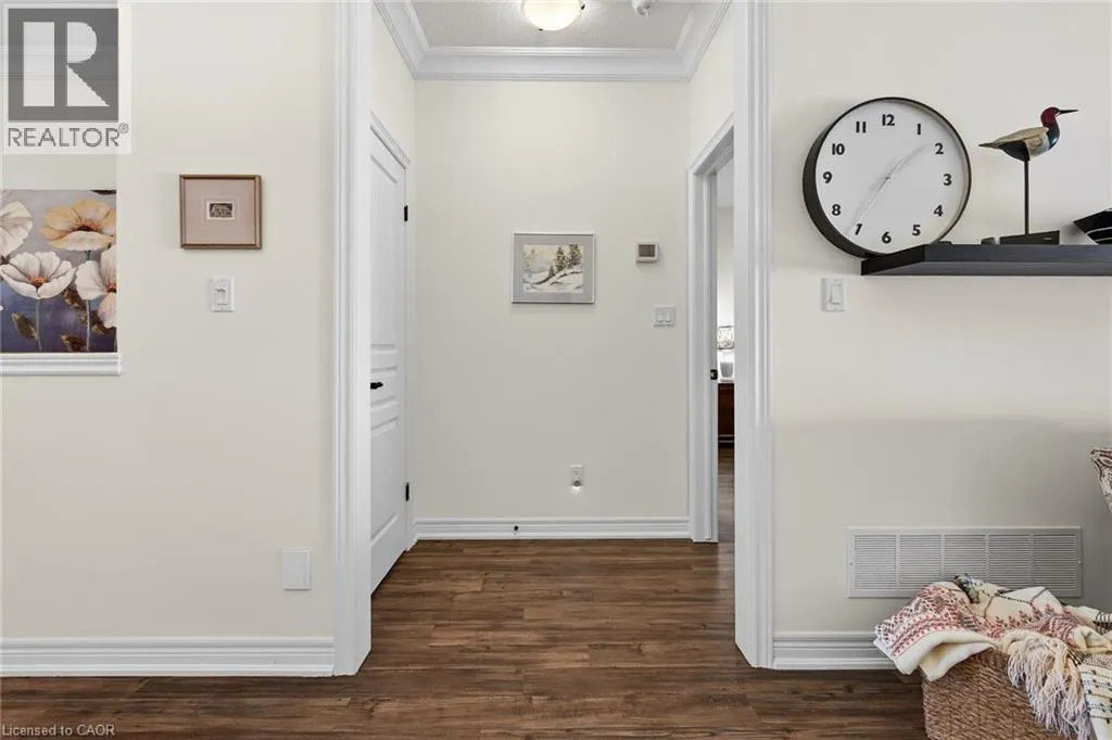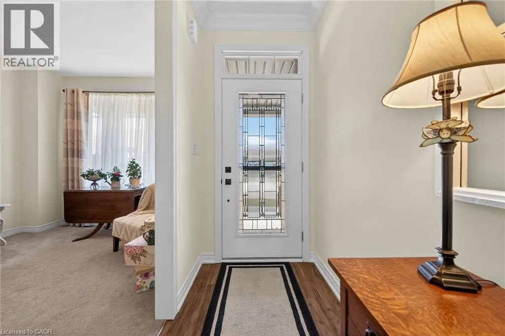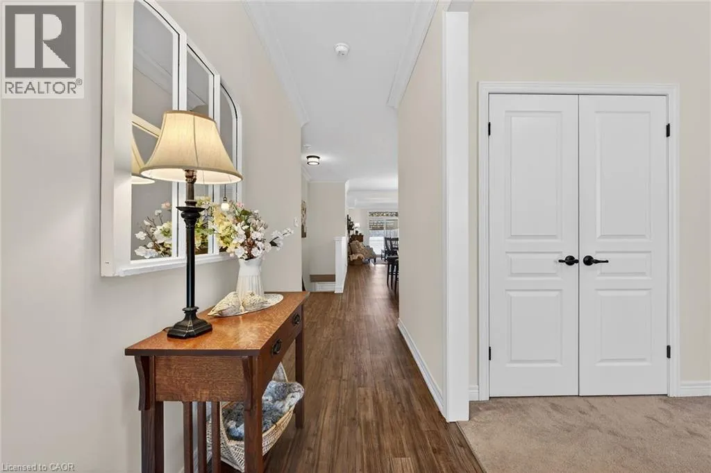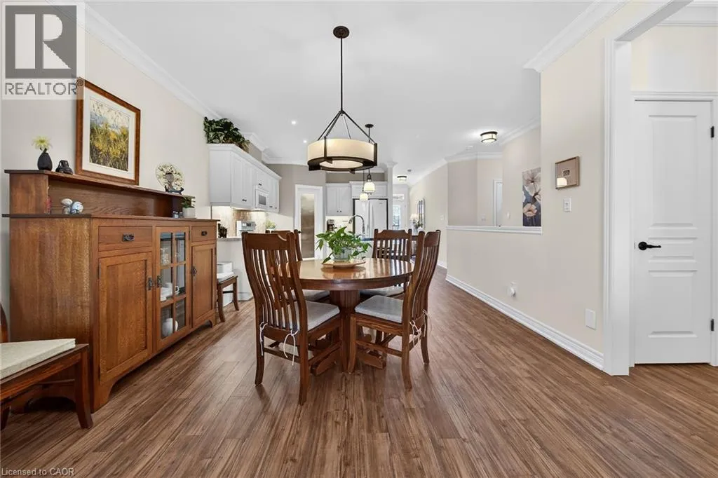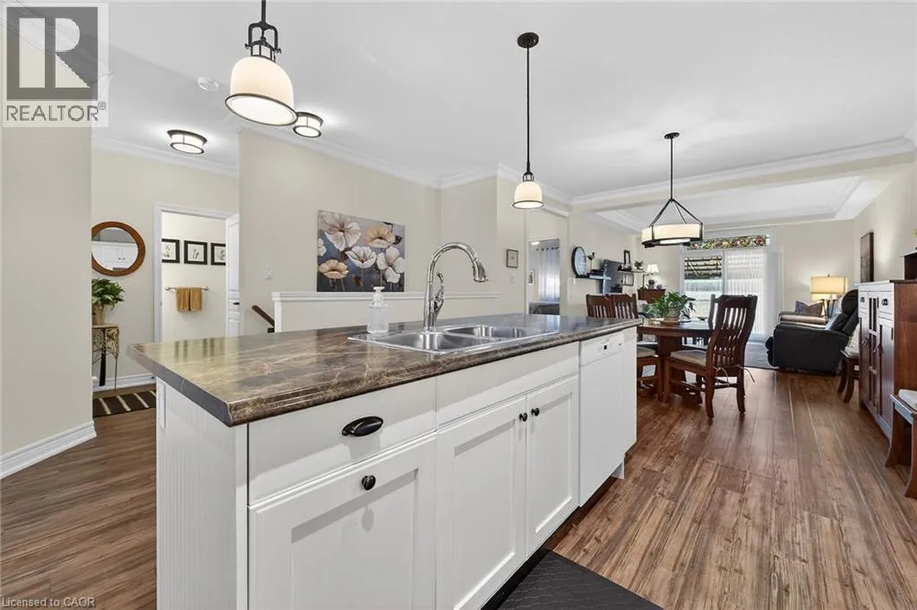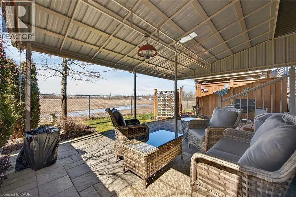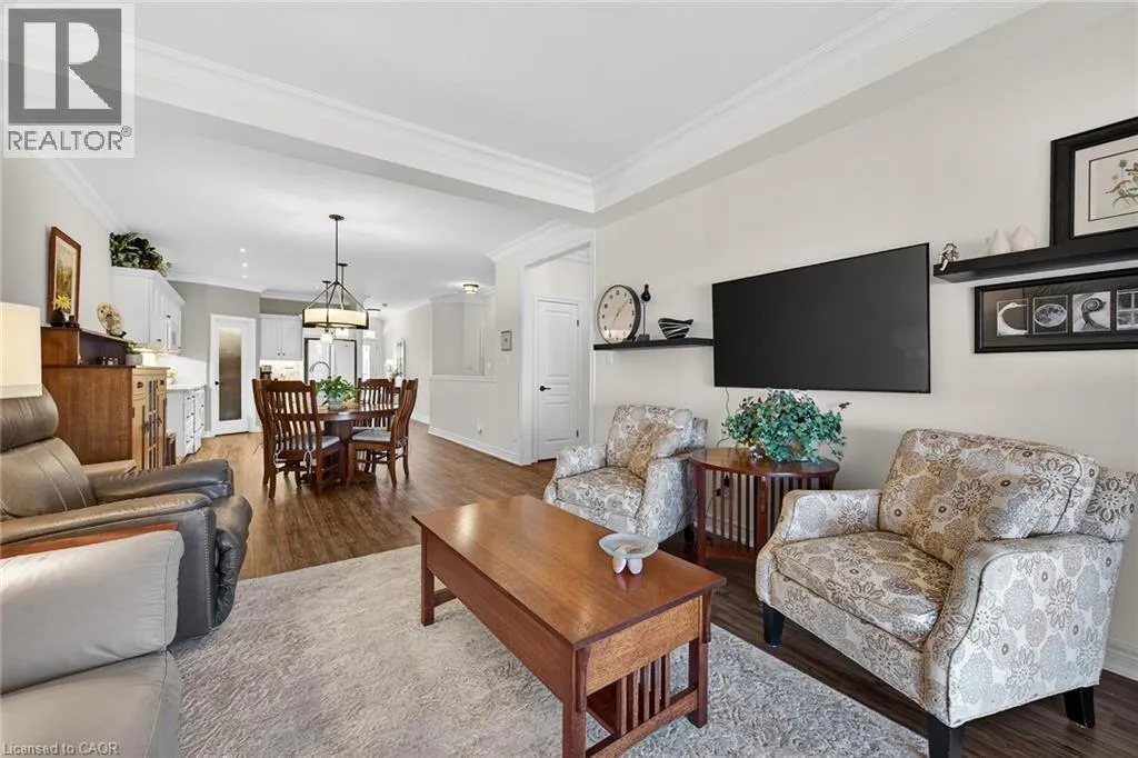 From HWY 20, south on Wade Road to Golden Acres Drive. West on Golden Acres to Oakdale Blvd. Follow Oakdale (turns into Manorwood). Right onto Forestview Court. Tucked away in a private cul-de-sac enclave in Smithville, this stunning freehold bungalow townhome features peaceful living with breathtaking panoramic sunset views year-round over open farm fields. Enjoy your own quiet outdoor retreat on the private rear patio, complete with a hard-covered gazebo, perfect for relaxing or entertaining. Inside, the home features 9-foot ceilings, and a bright, open-concept layout, enhanced by beautiful, upgraded lighting throughout. The gorgeous kitchen is a true focal point, showcasing a large island, coffee station, walk-in pantry, soft-close cabinetry, and under-cabinet lighting, ideal for both everyday living and hosting. Premium Torlys laminate flooring flows seamlessly throughout the main living areas. The living room features a coffered ceiling with patio doors to the private rear patio. With 2 bedrooms and 1.5 bathrooms, this home is thoughtfully designed for comfort and functionality. The primary suite is a true retreat, featuring a stylish 3-piece ensuite with a glass shower along with soundproof insulation between the primary bedroom and living area for added privacy. Additional highlights include main floor laundry and convenient inside entry from the single-car garage. A perfect blend of low-maintenance living, modern upgrades, and serene surroundings. This is a rare opportunity in a sought-after community. Minutes to local amenities, schools and park. Small road fee includes landscaping/maintenance/snow removal of common area as well as irrigation system and visitor parking. (id:27476)