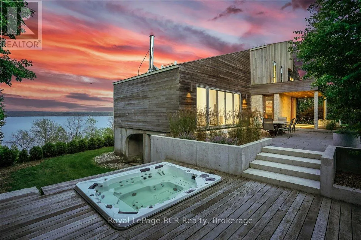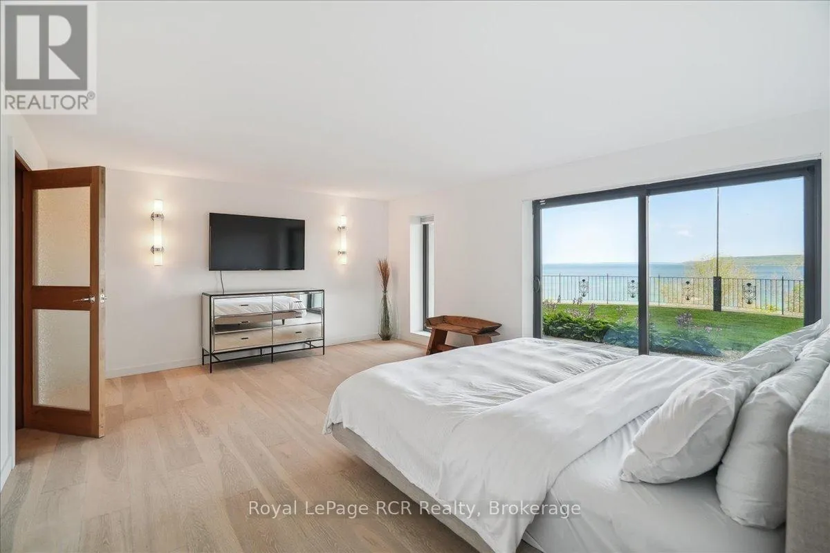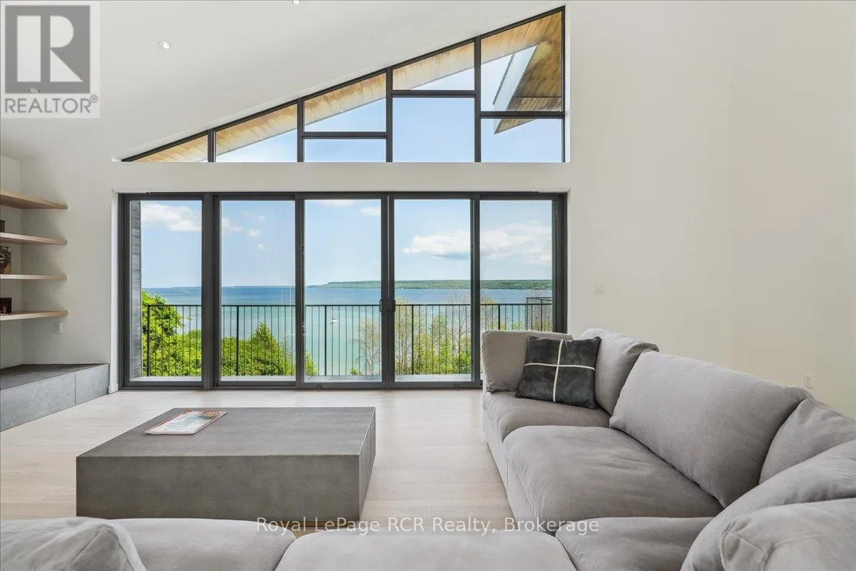 Cross Streets: Hwy 6 & Bruce Rd. 9. ** Directions: Take Hwy 6 North to Wiarton, turn right onto Bruce Rd. 9 (signs for Colpoys Bay), turn left onto Everett Rd, house will be on the right. Perched majestically above the crystalline shores of Colpoy's Bay, this architectural masterpiece defines the pinnacle of modern luxury. A true masterclass in light and form, the estate is wrapped in soaring floor-to-ceiling glass, erasing the boundary between its sophisticated interiors and the shimmering expanse of the bay. While the residence is thoughtfully nestled on the hillside to maximize its commanding panoramic views, the lifestyle extends directly to the water's edge, a gentle stroll across the coastal road leads you to your own private dock for seamless days spent on the waves. The heart of the home is a chef's sanctuary, anchored by a monumental 21-foot island and outfitted with a full suite of professional Miele appliances, a built-in espresso station, and a curated wine fridge. This culinary hub flows effortlessly into a grand dining area and a living room defined by soaring ceilings and a bespoke wood-burning fireplace, creating an atmosphere of refined warmth. Each of the six meticulously designed bedrooms is oriented to capture the morning light dancing off the water, including a primary suite that serves as a sanctuary of wellness with its spa-inspired ensuite and expansive walk-in dressing room. For those seeking versatility, the walk-out lower level offers a sophisticated footprint for an in-law suite or high-end guest accommodations with significant income potential. Outside, the 0.7-acre grounds are a botanical retreat of lush gardens, mature canopy, and multiple terraces designed for grand-scale entertaining. Whether you are hosting an alfresco gala, unwinding in the water view hot tub, or wandering down to the water to launch a kayak, the amenities are unparalleled. Complete with a three-car detached garage and RV hook-ups, this estate is a legacy retreat located just minutes from the charm of Wiarton and an easy 40-minute drive to the rugged wonders of Bruce Peninsula National Park. (id:27476)