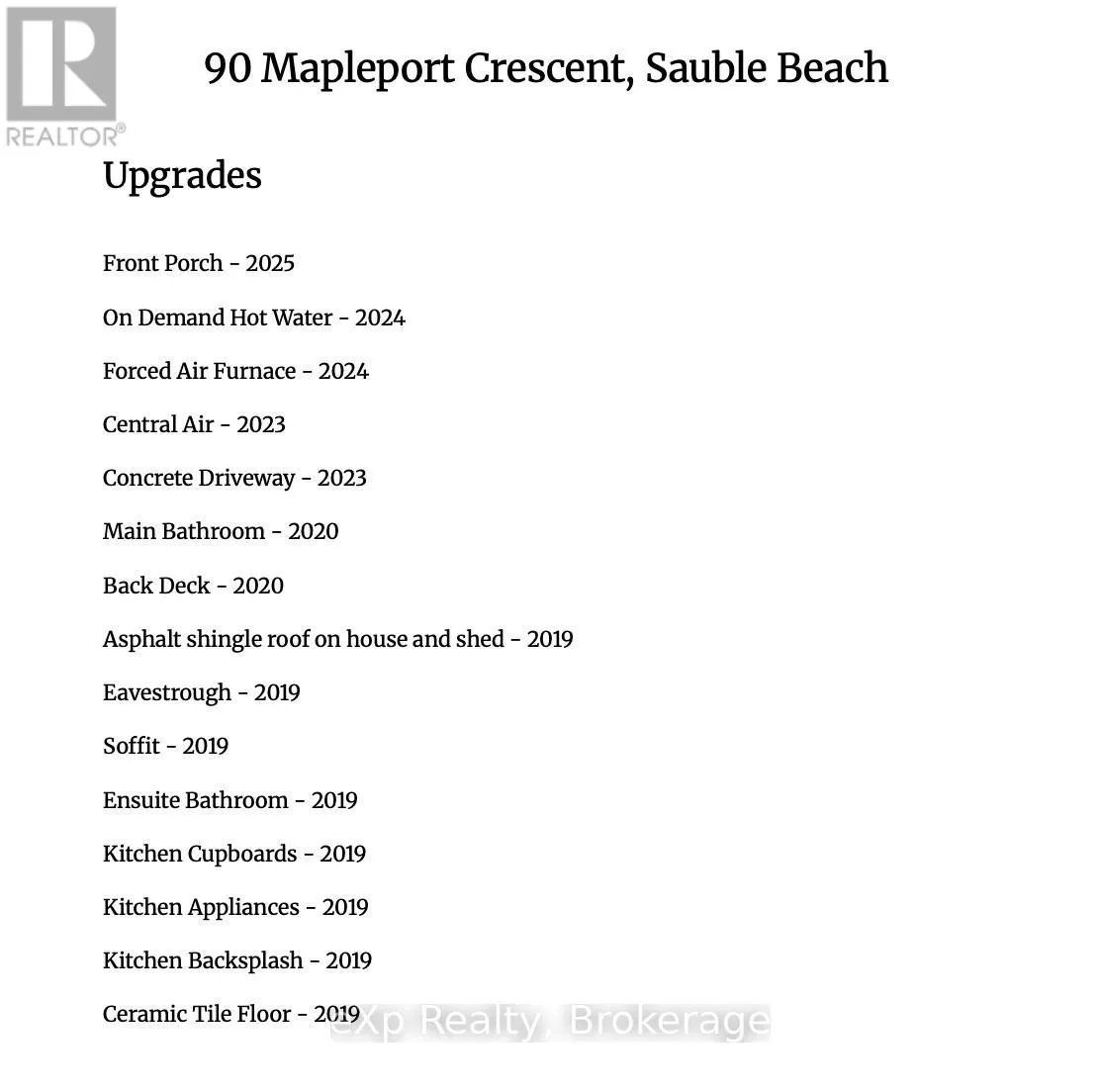 Cross Streets: Mapleport Cres. ** Directions: Heading North on Southampton Parkway, turn right on to Birch St, take the second right on to Mapleport Crescent. The property is on your left, 90 Mapleport Crescent. Location is everything and 90 Mapleport Crescent delivers. This beautifully renovated bungalow is set in the highly sought-after Huron Woods subdivision, known for its quiet, family-friendly atmosphere that remains peaceful even during peak summer months. The bright and spacious main floor living offers comfort and convenience, complemented by a heated 2-car garage, concrete driveway (2023), and a dedicated 50-amp outlet- perfect for RV hookup or EV charging. Situated on a generous 100ft x 150ft lot surrounded by mature trees, enjoy outdoor living on the large back deck, ideal for summer BBQs or morning coffee. You are just minutes away from the world-famous sands of Sauble Beach, downtown shops, local hiking trails, and community amenities. Full list of upgrades available. (id:27476)