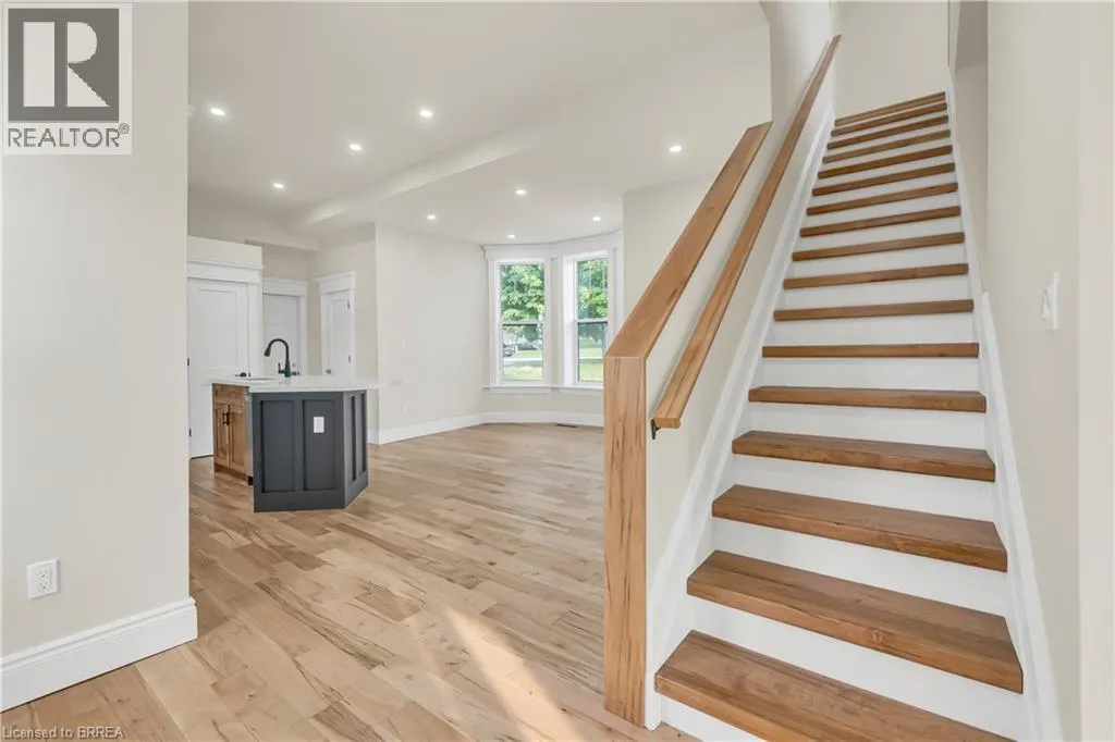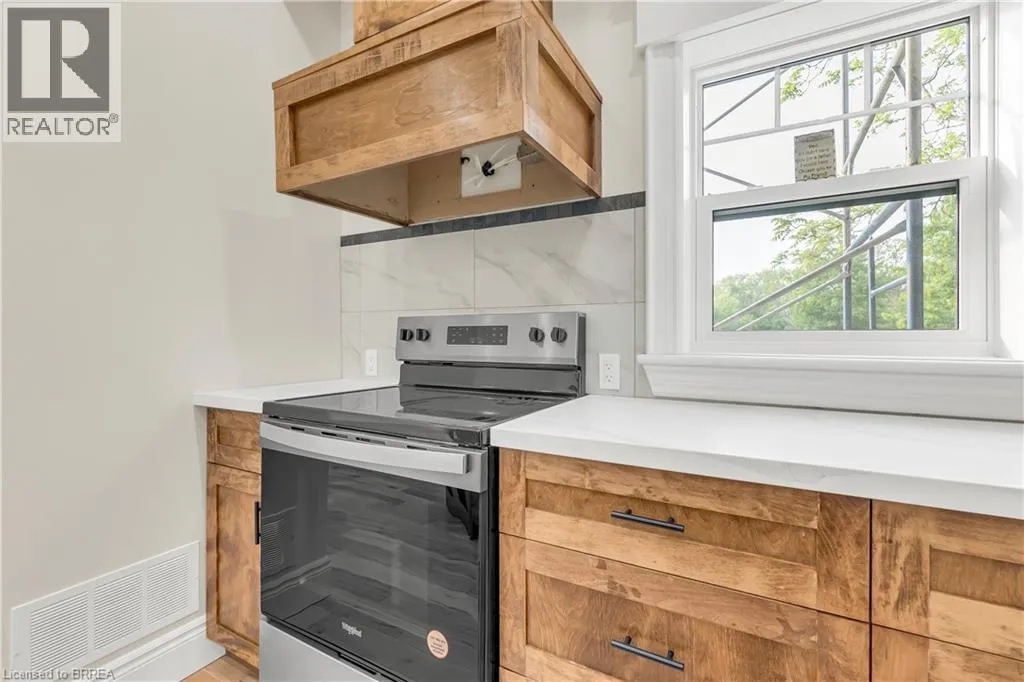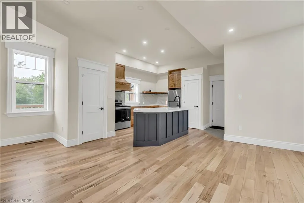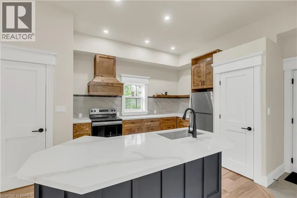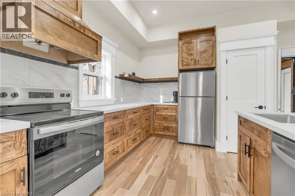 Hillcrest St W & Clinton St S Welcome to 16 Hillcrest St W in Teeswater - a beautifully updated 2-bedroom, 2-bathroom home where small-town charm meets modern comfort. Nestled on a quiet street, this home features a timeless yellow brick exterior, new limestone-silled windows, and a welcoming wraparound concrete porch. Inside, natural light pours through brand-new windows, highlighting the open-concept living and dining areas with maple hardwood floors and crisp white trim. The custom kitchen is a showstopper, complete with quartz countertops, new appliances, ample cabinetry, and workspace designed to inspire any home chef. Upstairs, the serene primary suite includes a walk-in closet and a private laundry closet, while the second bedroom offers flexible use as a guest room, office, or den. The 3-piece bath showcases a quartz vanity and spa-like finishes, complemented by a convenient main-floor powder room. The lower-level workroom - with garage door access - is ideal for hobbies or storage. Step outside to a spacious wrap-around deck overlooking a lush yard that extends to the picturesque Teeswater River. Additional features include a 2-car attached garage, updated exterior and garage doors, soffit, fascia, eaves, solid wood interior doors with Weiser hardware, and modernized electrical and plumbing systems. This move-in-ready gem blends peace, style, and practicality - your perfect escape awaits. (id:27476)