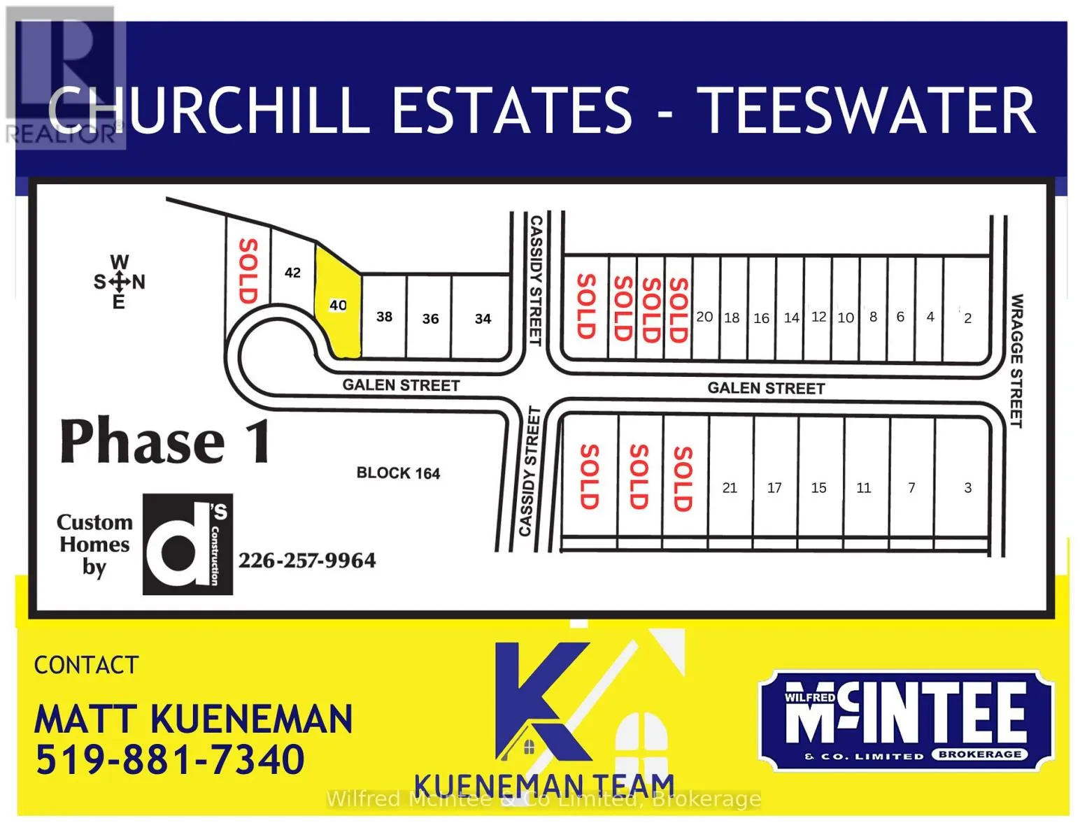 Cross Streets: Brownlee St & Hwy 4. ** Directions: 40 Galen Street Teeswater, ON. Welcome to Churchill Estates, Teeswater's newest subdivision! Were offering large serviced building lots ready for construction starting Spring 2025. You can purchase your lot and choose your own builder (some restrictions apply), or take the hassle out of the process by building with D's Construction! With D's, you can combine your lot price and build price into one simple package. D's offers custom quality built homes that come complete with a concrete driveway and a landscaping package. Take advantage of a low down payment and start your dream home this spring! Teeswater is a charming community located in Bruce County, just 25 minutes from Lake Huron and 35 minutes to Bruce Power. Call today for more details. (id:27476)