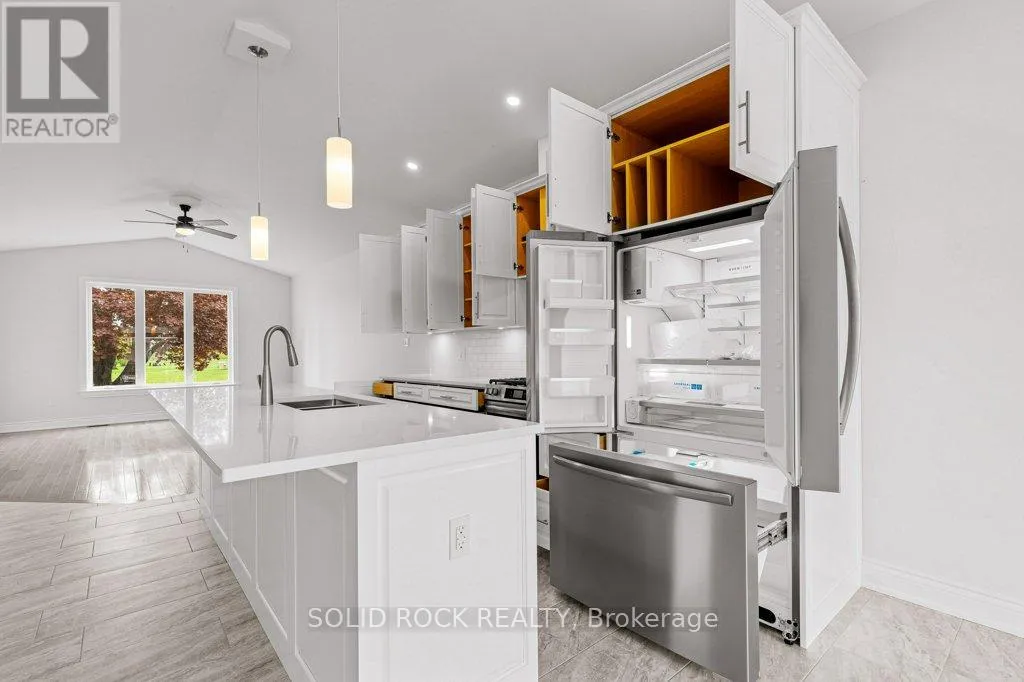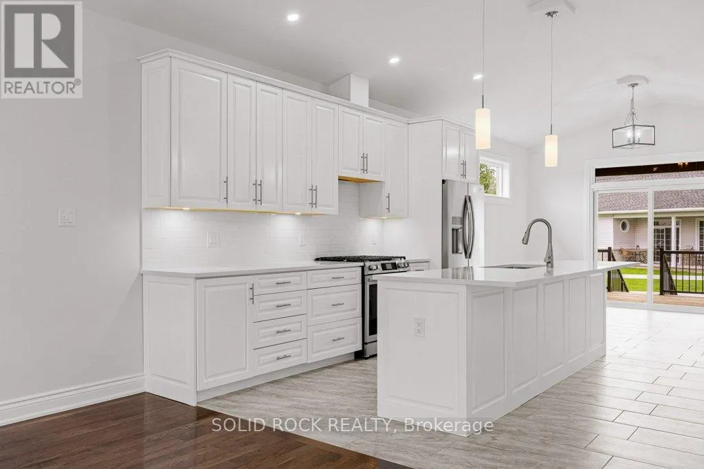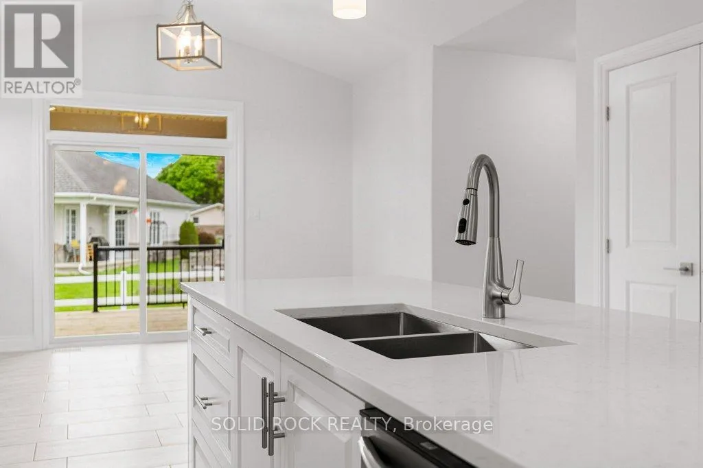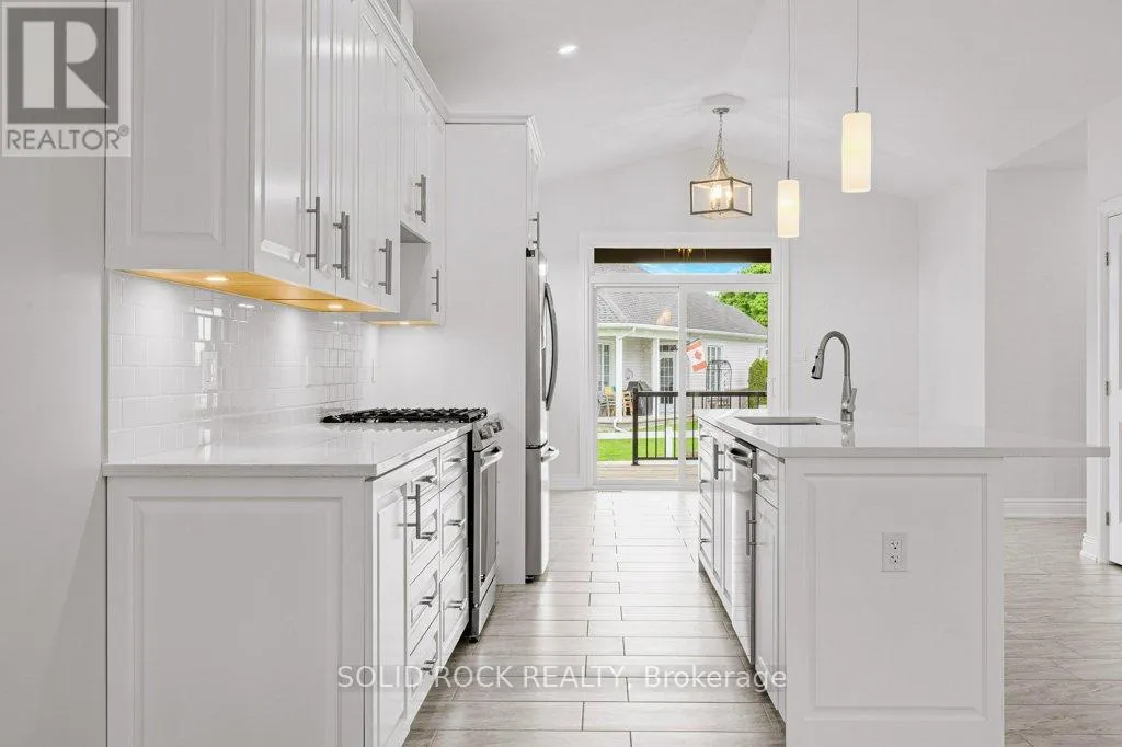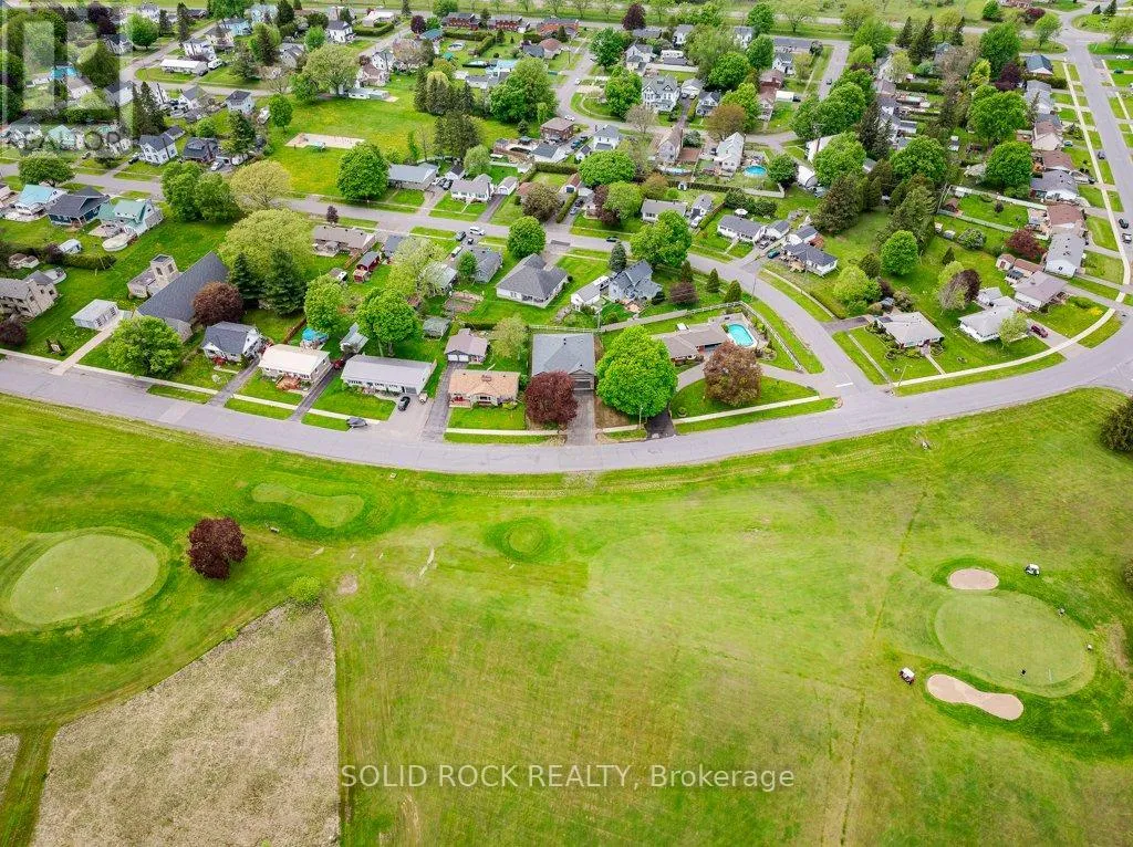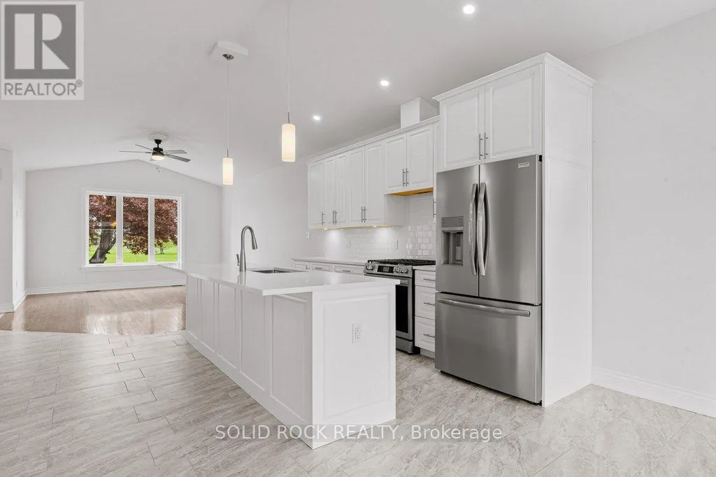 Cross Streets: Maple Avenue. ** Directions: See mapping. Incredible 44' deep grand room overlooks 18-hole waterfront golf course! 9 ft & 11 ft high main level ceilings & multitudes of big, bright windows, & energy efficiency are just a few of the hallmarks of this bungalow-This brand new never-lived-in home includes new home warranty! Tremendous curb appeal starting with the mature red-maple tree, designer roof lines & stone front complimented by James Hardie siding-After you park your car in paved drive, you can walk up to front covered veranda & catch a glimpse of an ocean-going freighter-Entering front foyer you will be impressed with lovely tile throughout foyer & kitchen/dining area & wowed by the vaulted 11 ft ceilings that extend from front to back in this magnificent grand room-Huge south-east facing window allows you to enjoy all the golfing action across the street-Custom kitchen features white shaker kitchen cabinetry with ample pull-outs, multitudes of pot drawers + full-height pantry-Kitchen is complete with centre island, Canadian-made quartz countertops, gorgeous tile backsplash, brand new Frigidaire Gallery stainless steel appliances incl d/w, microwave/hood range, gas stove & French dr refrigerator with bottom freezer-Dining area patio drs lead to 14 x 12 ft covered veranda overlooking fenced yard-Main level east wing has 9 ft ceilings & very wide tiled hallway leading to inside entrance to garage, main flr lndry & features a chic 4-pc bath, spacious 2nd bdrm & large primary bdrm with 9 ft high tray ceiling, walk-in closet & marvelous ensuite with walk-in shower-Gorgeous hrdwd in living room & both bdrms-Dnstrs you find a fully finished living space ideal for extended family/in-law suite-Every room has even more big, bright windows & tall ceilings-you would never know this is a bsmt! Main garage dr measures 16x8ft to accommodate oversized vehicles & there is an 8x7 side garage dr, ideal for golf cart or snowmobile-HST incl-Please ask us for a copy of Builder Upgrades-Walk to shopping & Tim's! Welcome home (id:27476)