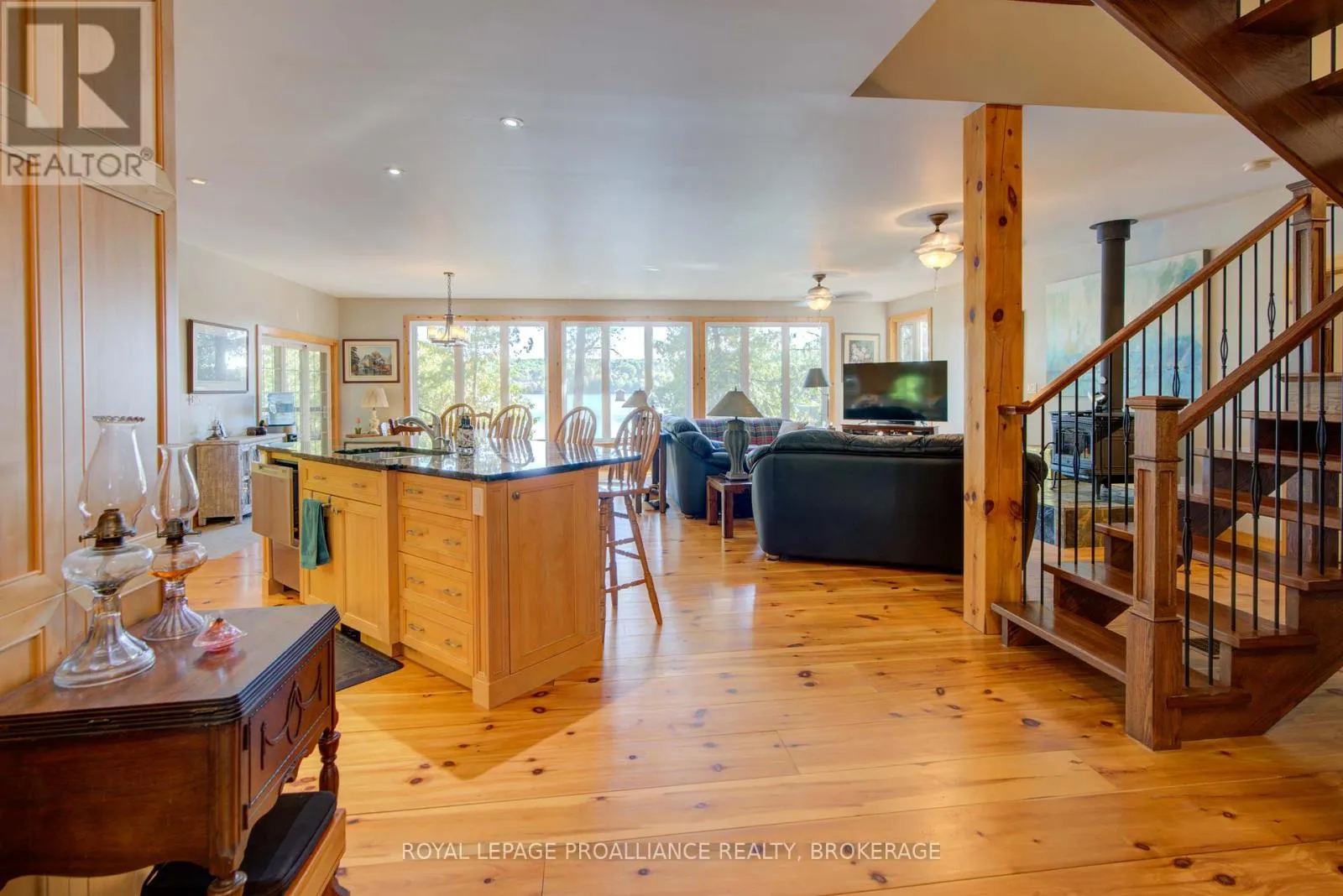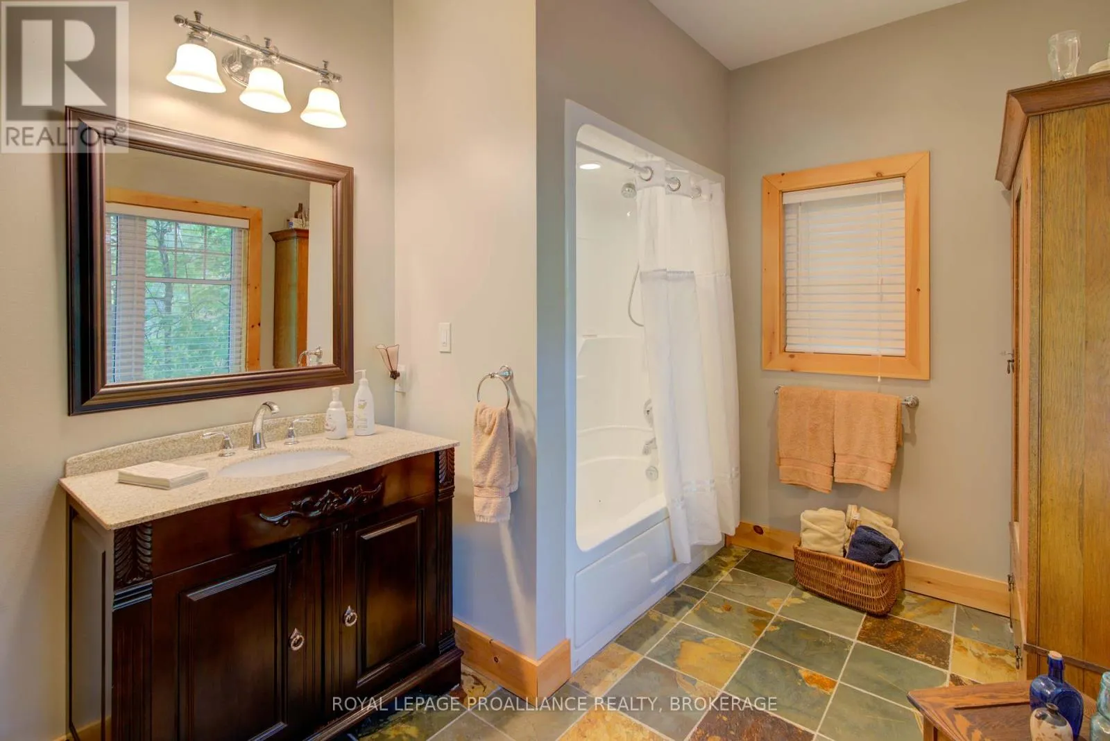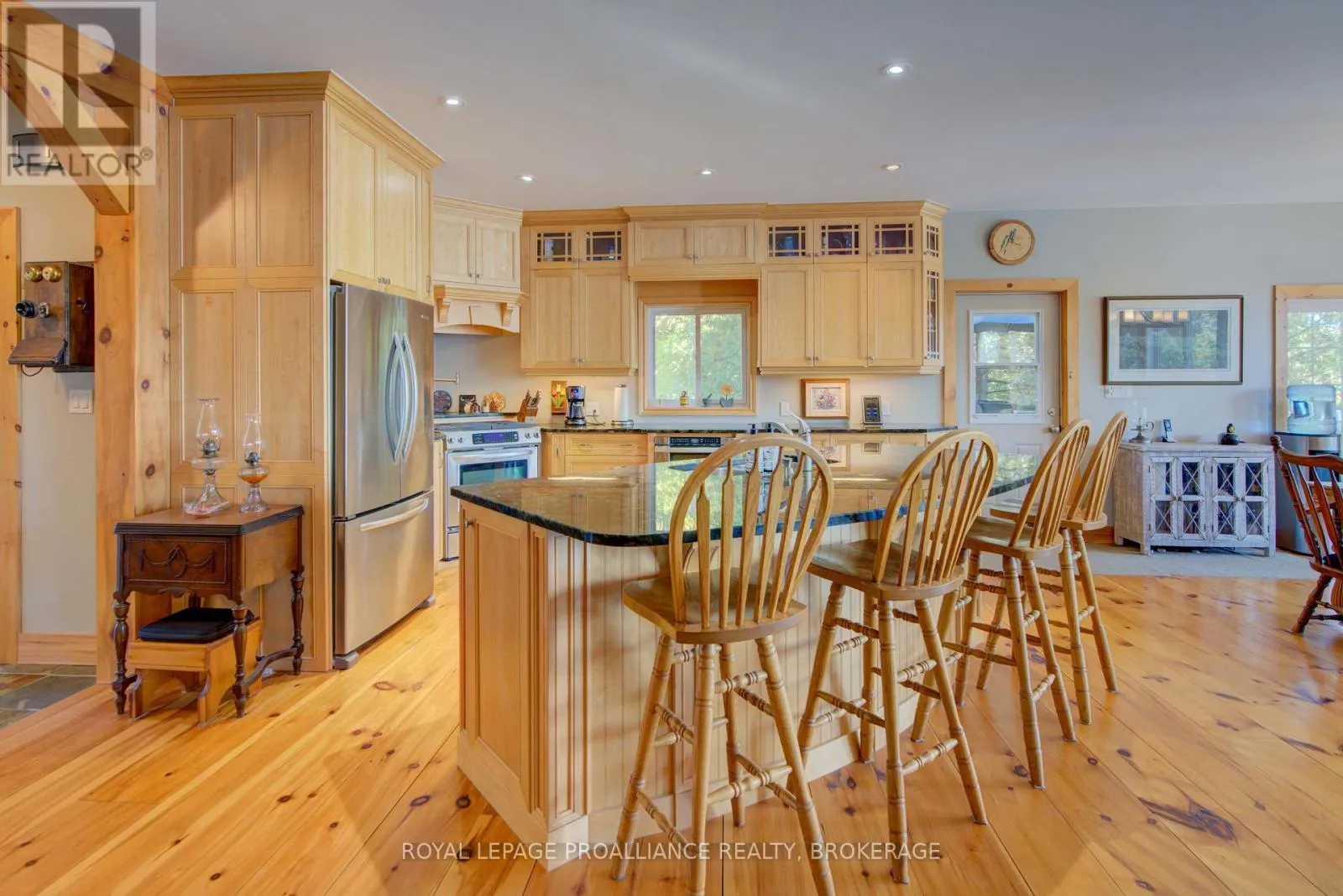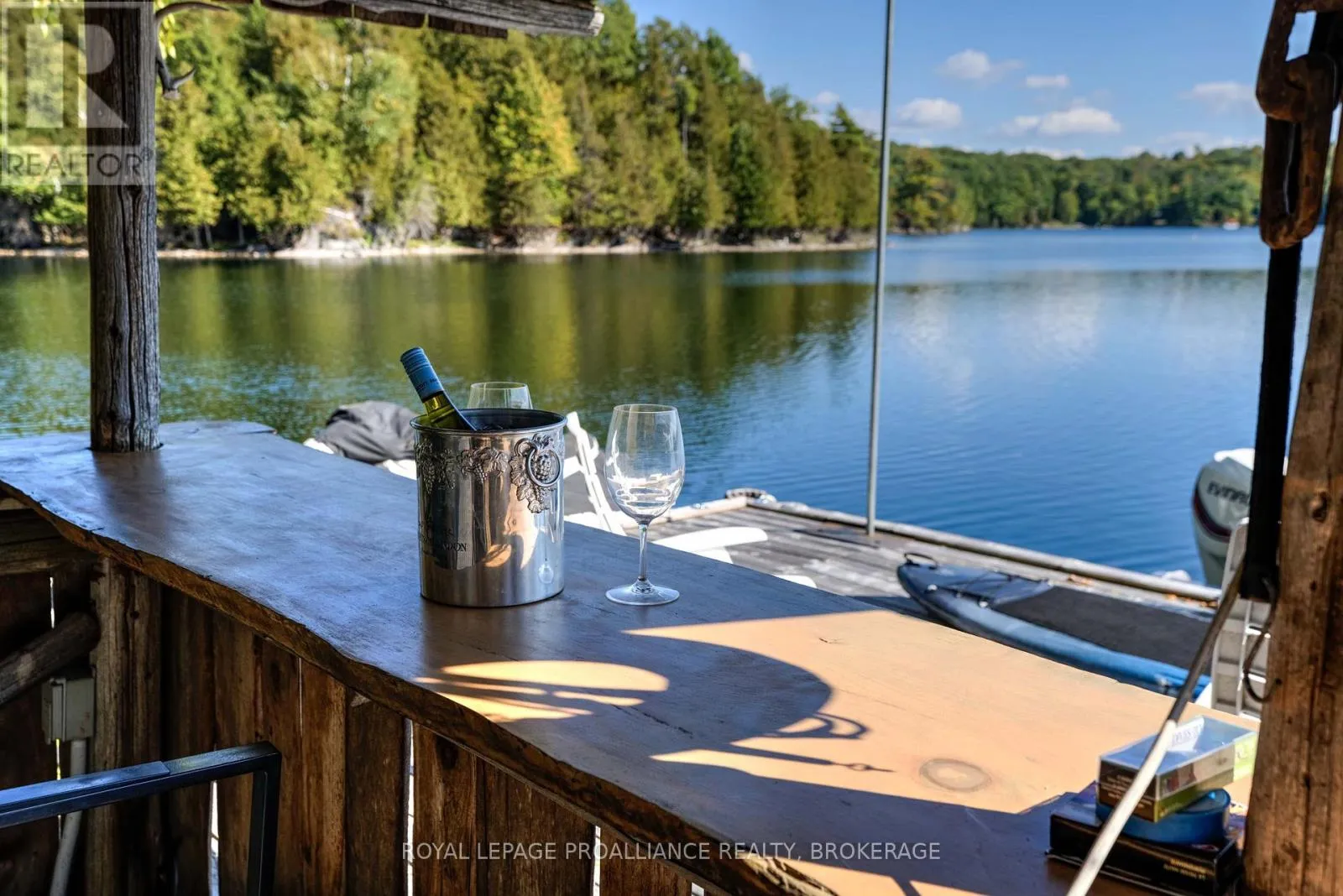 Cross Streets: Perth Road / MacComish Lane. ** Directions: Perth Road South of Westport to MacComish Lane,follow to end at #441 B. Waterfront oasis on Buck Lake! This beautiful property features 2+ acres of land and200 ft of shoreline. This gorgeous home sits close to the lake with level access to shallow water and deep water off the dock. Enjoy the large dock, covered boat slip and tiki bar - with southern exposure for sunrises and sunsets. The view is stunning looking out over the bay and the location is private & peaceful. As you enter under the timber frame porch, you immediately feel a sense of relaxation in this stunning lake house. The main floor has a large, open concept Great Room with expansive windows and access out to the deck. The custom Corelle Kitchen is a showpiece with Madagascar blue granite countertops, dbl drawer dishwasher, under-counter microwave and a pot filler above the propane stove. Enjoy cozy evenings with the warmth of the Pacific Energy wood-stove. The main floor bedroom has an attached 4-pc bath that also has access from the foyer. The office next to the foyer could be another bedroom. The bathrooms and foyer have heated slate floors while the balance of the home has wide-plank pine flooring - from trees on the property! The second level features a large bedroom at the rear, laundry area and an amazing primary bedroom with cathedral ceilings, custom cabinets, a 3-piece ensuite bath and gorgeous views over the pristine waters of the lake. The partial basement has concrete floor & spray foam walls and the home is heated by propane forced air, has 200-amp service, a lake water system with UV light, Hide-A-Hose central vacuum, HRV, electric hot water, A/C and an on-demand backup generator system. A catwalk leads from the house to extra living space above the 2-car detached garage. This space has a large family room, dining area, kitchenette along with a bedroom and a 2-piece bath. The exterior of the home and garage have vertical Timberthane wood siding with a lifetime guarantee. Stunning home located just south of Westport or 40minutes north of Kingston. (id:27476)