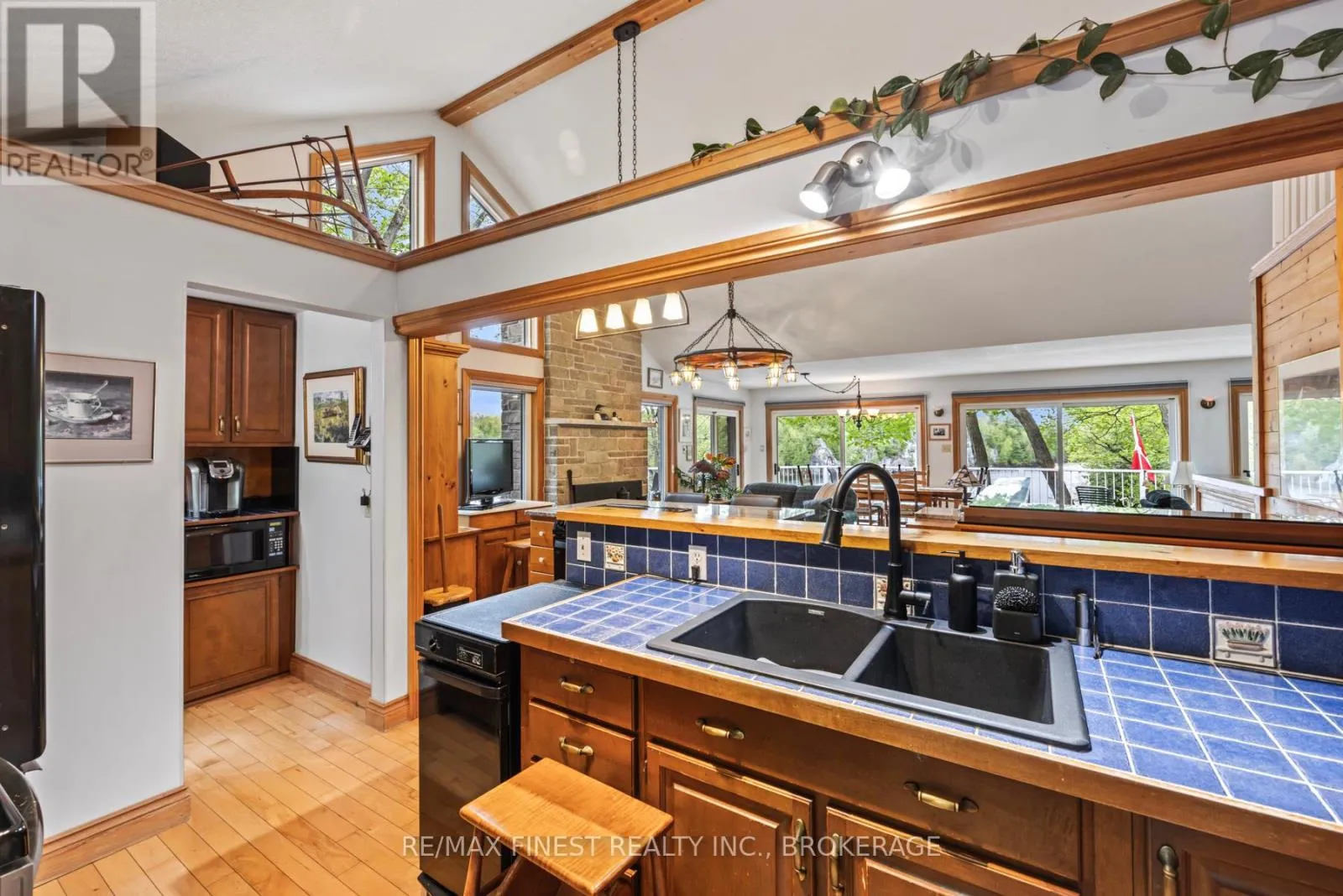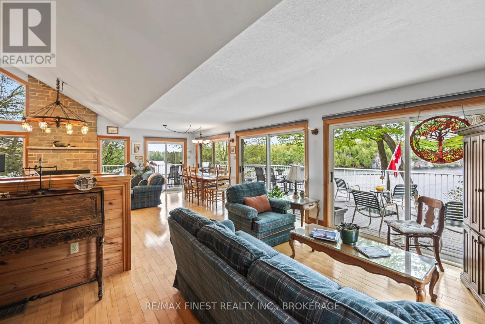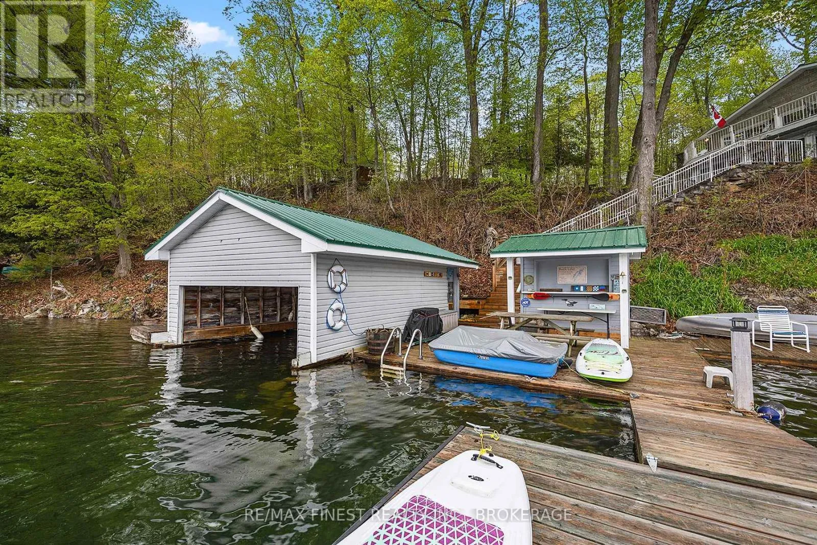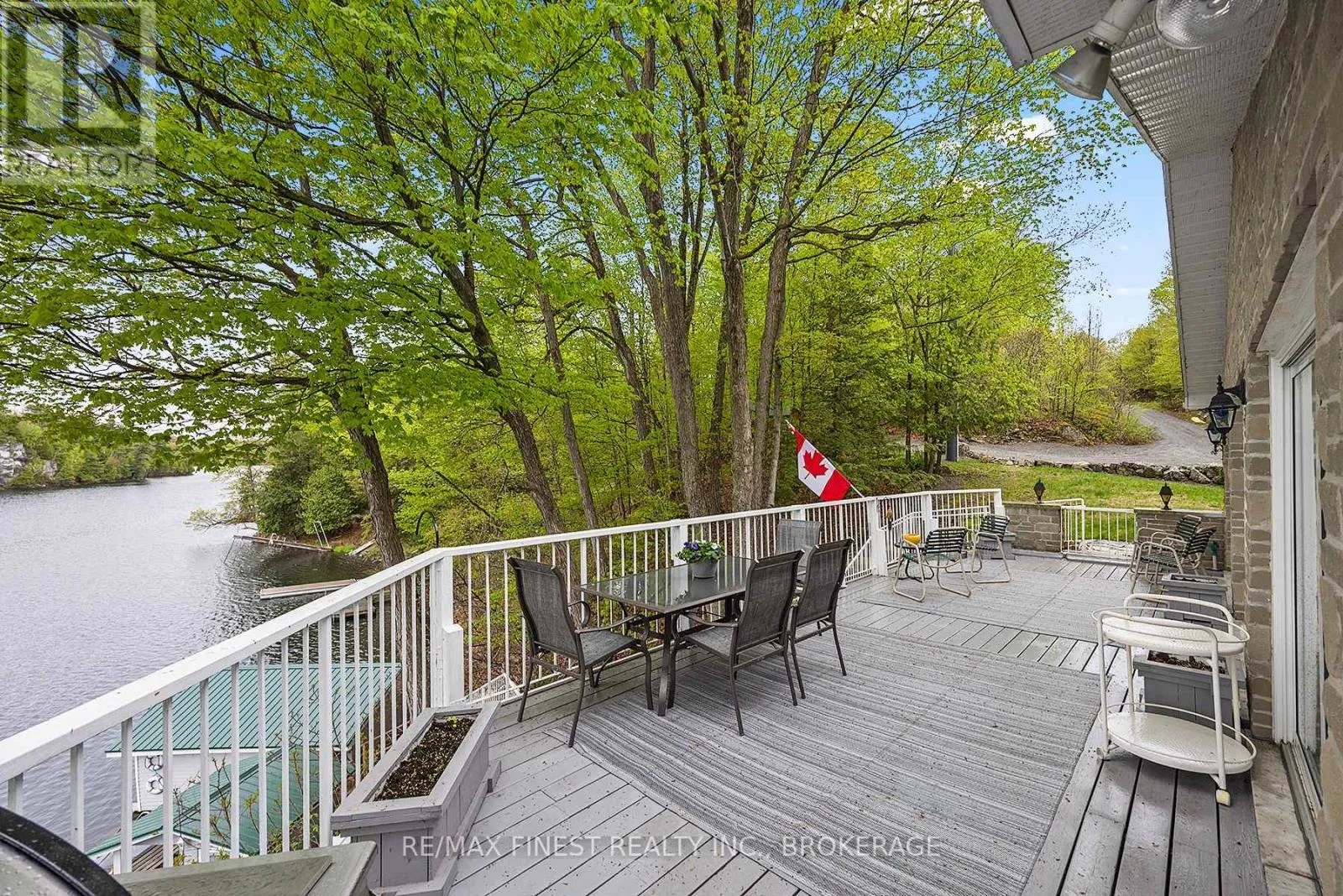 Cross Streets: Perth Road. ** Directions: Perth Road, just North of Boat Launch. Just a short drive from downtown Kingston and a quick jaunt into Westport, nestled among more than 20 varieties of mature trees, on spring fed Buck Lake and in the Canadian Shield, this prestigious stone, raised bungalow is waiting for you to call home. The main floor boasts floor to ceiling windows and patio doors to the wrap around deck and clear, 180 degree view of Crown land including exclusive direct sight of the famous local landmark, Pulpit Island with the iconic "Devil's Pulpit". The lower level, which is a walk-out, has two additional bedrooms (that could be 3), a 4-piece bathroom, laundry closet, cozy rec room with propane fireplace and like upstairs, floor to ceiling windows and patio doors so that you never lost the view. You walk out into a three season space under the deck, here you'll spend many nights playing cards/games. Just a few steps from the main house is a beautiful 4 season guest house, complete with a single/double bunk bed, toilet, sink and outdoor shower. Take the stone steps down to the crystal clear and deep shoreline, pop open the cabana and host the best dock party around! There is plenty of room on the dock for all sorts of activities and the original solid boat house is ready, waiting to house your watercraft of choice. The period style of the building's living space (2,078 sq ft) is enhanced by artful, expansive and expensive landscaping of local stone and materials; patios, pathways, limestone steps, iron railings, border rock fences, 2 large rough cut board and batten pine sheds, with steel roofs to match the main house! Upgraded Septic system, Brand new Kohler-Generator, and Bunkhouse Cabin. This is a home that needs to be seen and experienced in person! (id:27476)
