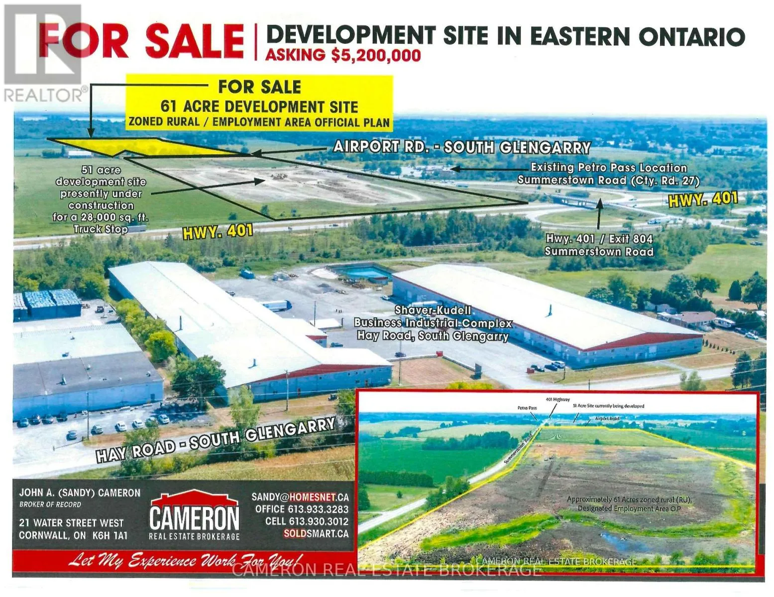 Cross Streets: County Road 27. ** Directions: South of Hwy 401 at Exit 804. DEVELOPMENT PROPERTY..+/-61 acres (vacant land /undeveloped parcel) . This site is located just off Exit 804 (Summerstown Road) in South Glengarry, Ontario less than an hours drive to the West Island of Montreal . This property is situated at the southeast corner of Summerstown Road and Airport Road, located south of the existing Petro Pass Truck Stop near Highway 401 and this +/- 61 acre site is on the opposite side of the Airport Road facing the neighbouring 51 acre site that butts on Hwy 401 at Summerstown Rd that is currently being developed and under construction at this time to construct a +/- 28,000 sq.ft state of the art Truck Stop development. Seller required 2 full business days irrevocable with any offer submitted as a listing condition. (id:27476)
