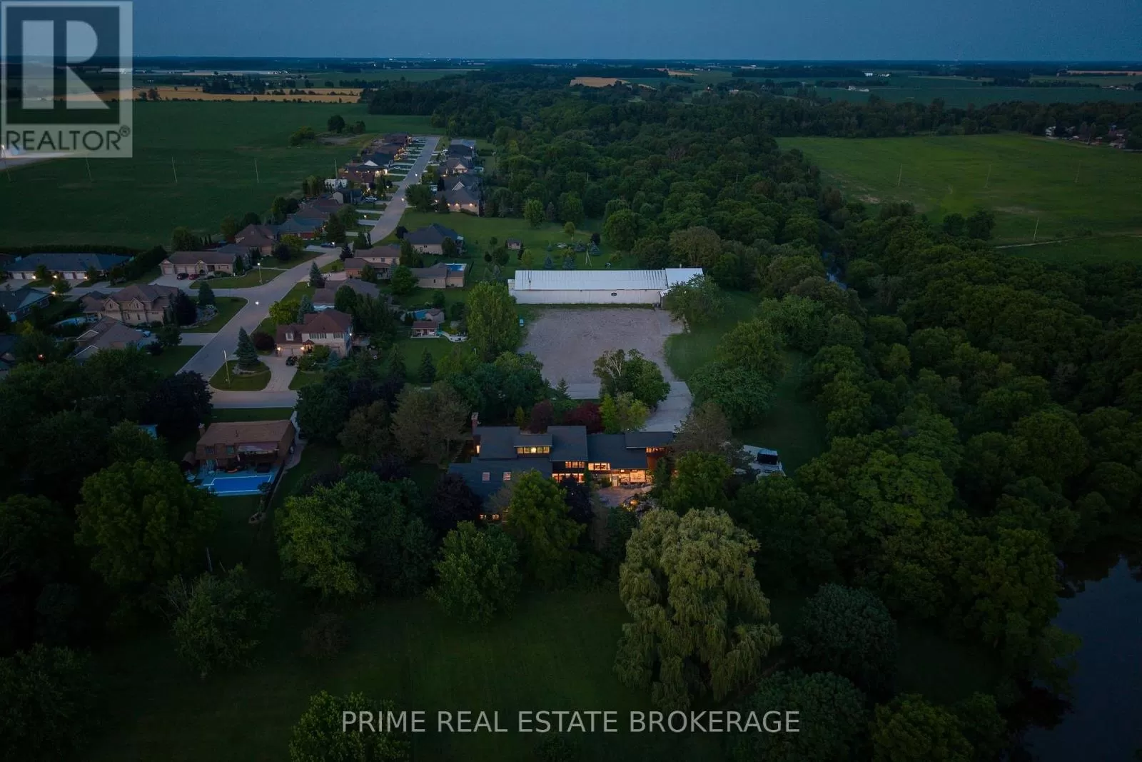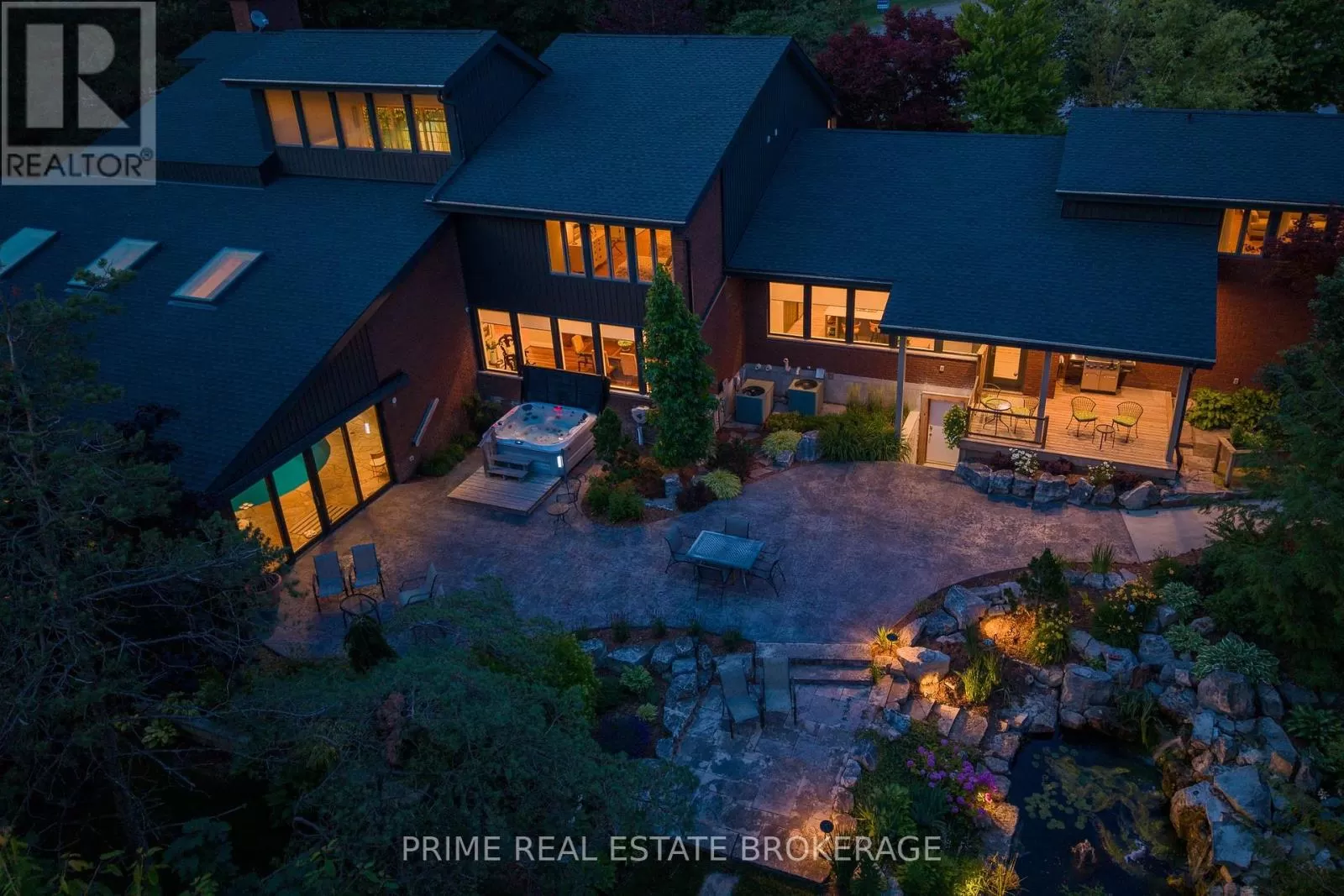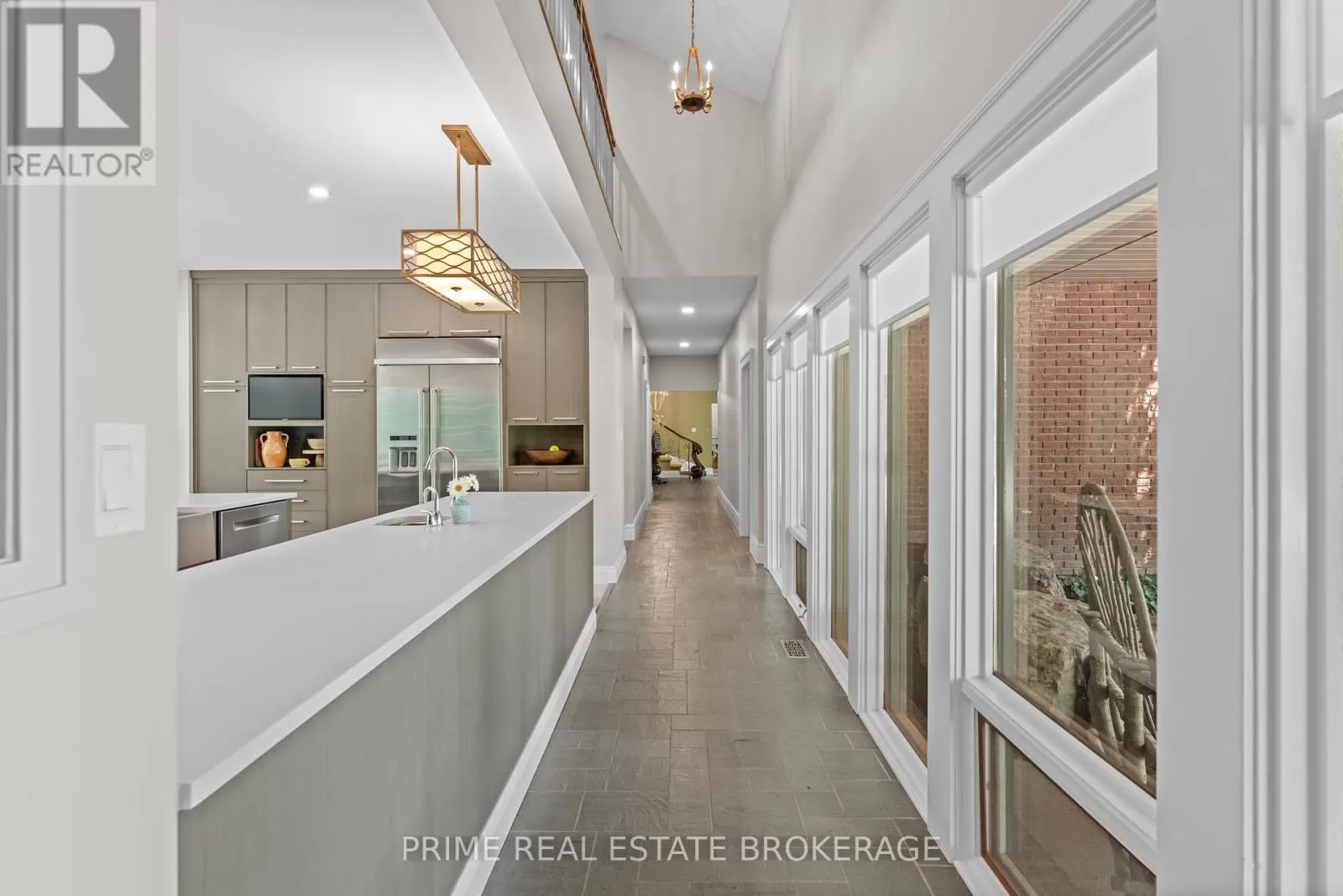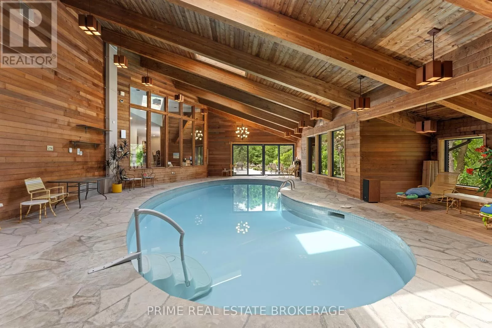 Cross Streets: Main Street South & Riverside Drive. ** Directions: Main Street South & Riverside Drive, near Hazelton Lane. Exclusive 1.18 Acre Private Estate in the Heart of Exeter. Ideally situated on a quiet dead-end street, this over 7,000 sq ft residence offers 329 feet of frontage, backing onto a large scenic ravine & surrounded by picturesque trees and landscaping, creating a natural buffer of space and privacy just minutes from downtown. Boasting custom upgrades throughout, showcasing an extraordinary blend of scale and craftsmanship. Every inch was built with intention from the wide, wheelchair-accessible hallways to the entertainment-ready living areas and pool pavilion. The expansive main floor showcases Cardinal custom cabinetry, a full butler's pantry with additional refrigeration, a walk-in closet and freezer in the rear hall, and a updated formal dining room with scenic views over manicured gardens. Upstairs, two adjoining primary suites offer walk-through closets and beautifully renovated bathrooms, while a 10x20 sq ft art studio with stained-glass windows and west exposure provides an inspiring, light-filled retreat. Other highlights include full elevator access to all three levels, a 3-car oversized heated garage with finished walls and ceiling, new skylights above the indoor pool, hot tub jacuzzi for year-round relaxation upgraded mechanical systems throughout. Professionally landscaped by Jay McKinnon, the grounds are a private oasis complete with stamped concrete patios, a roofed deck, new pond, Wi-Fi irrigation, heated concrete steps, and 10-camera security system. Close to Exeter Golf Club, the Ausable River Trail, and 20 minutes to Grand Bend beaches, dining, and marina, this is a rare opportunity to own a private, turn-key estate in one of Ontario's most tightly held communities. (id:27476)