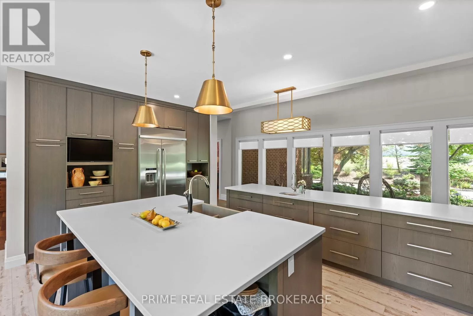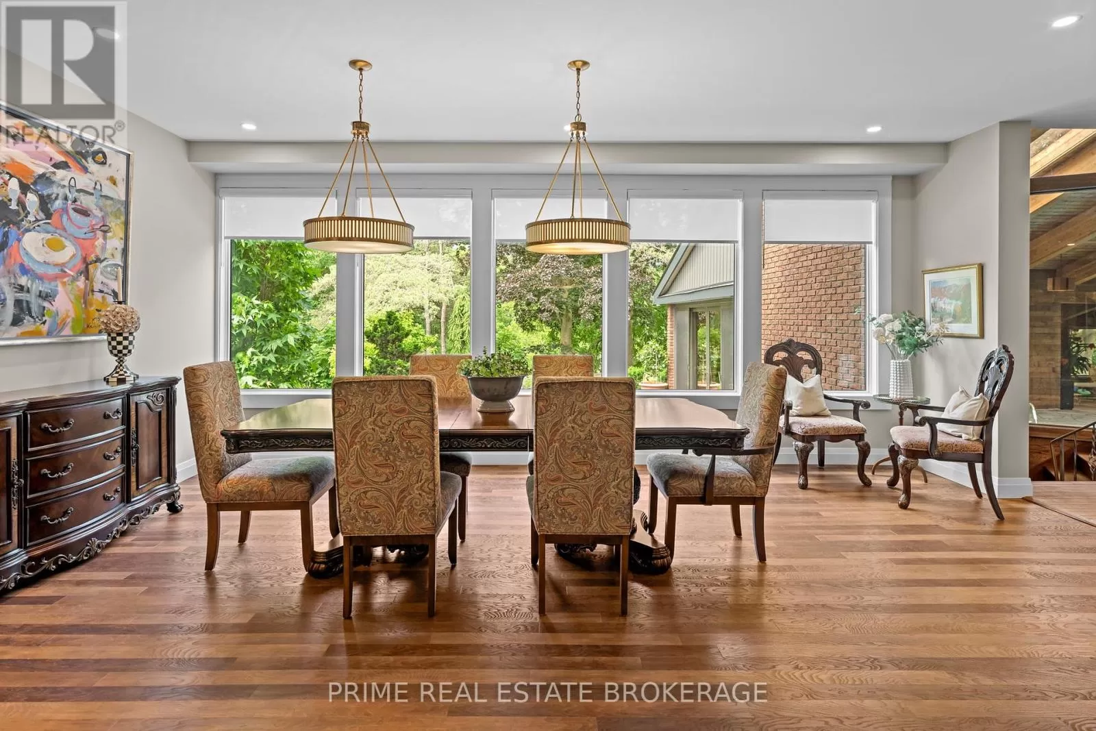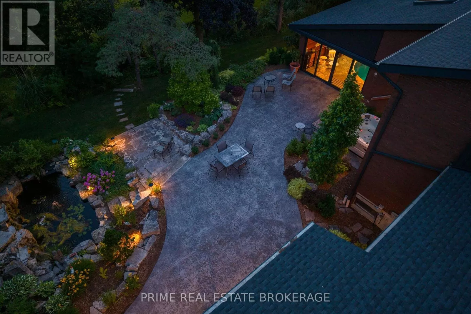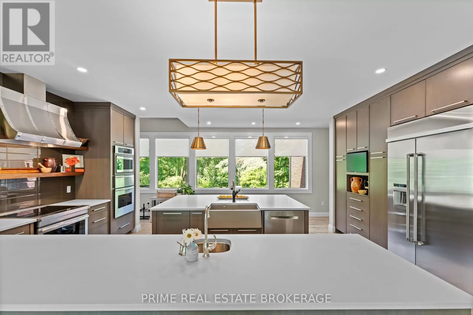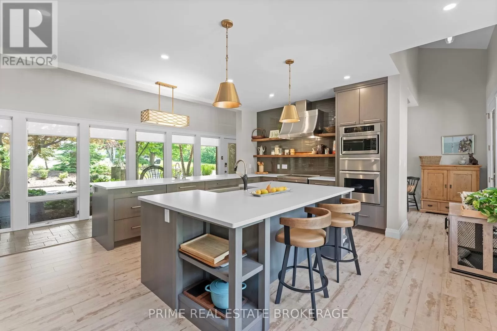 Cross Streets: Main Street South & Riverside Drive. ** Directions: Main Street South & Riverside Drive, near Hazelton Lane. Exclusive 1.18 Acre Private Estate in the Heart of Exeter. Ideally situated on a quiet dead-end street, this over 7,000 sq ft residence offers 329 feet of frontage, backing onto a large scenic ravine & surrounded by picturesque trees and landscaping, creating a natural buffer of space and privacy just minutes from downtown. Boasting custom upgrades throughout, showcasing an extraordinary blend of scale and craftsmanship. Every inch was built with intention from the wide, wheelchair-accessible hallways to the entertainment-ready living areas and pool pavilion. The expansive main floor showcases Cardinal custom cabinetry, a full butler's pantry with additional refrigeration, a walk-in closet and freezer in the rear hall, and a updated formal dining room with scenic views over manicured gardens. Upstairs, two adjoining primary suites offer walk-through closets and beautifully renovated bathrooms, while a 10x20 sq ft art studio with stained-glass windows and west exposure provides an inspiring, light-filled retreat. Other highlights include full elevator access to all three levels, a 3-car oversized heated garage with finished walls and ceiling, new skylights above the indoor pool, hot tub jacuzzi for year-round relaxation upgraded mechanical systems throughout. Professionally landscaped by Jay McKinnon, the grounds are a private oasis complete with stamped concrete patios, a roofed deck, new pond, Wi-Fi irrigation, heated concrete steps, and 10-camera security system. Close to Exeter Golf Club, the Ausable River Trail, and 20 minutes to Grand Bend beaches, dining, and marina, this is a rare opportunity to own a private, turn-key estate in one of Ontario's most tightly held communities. (id:27476)