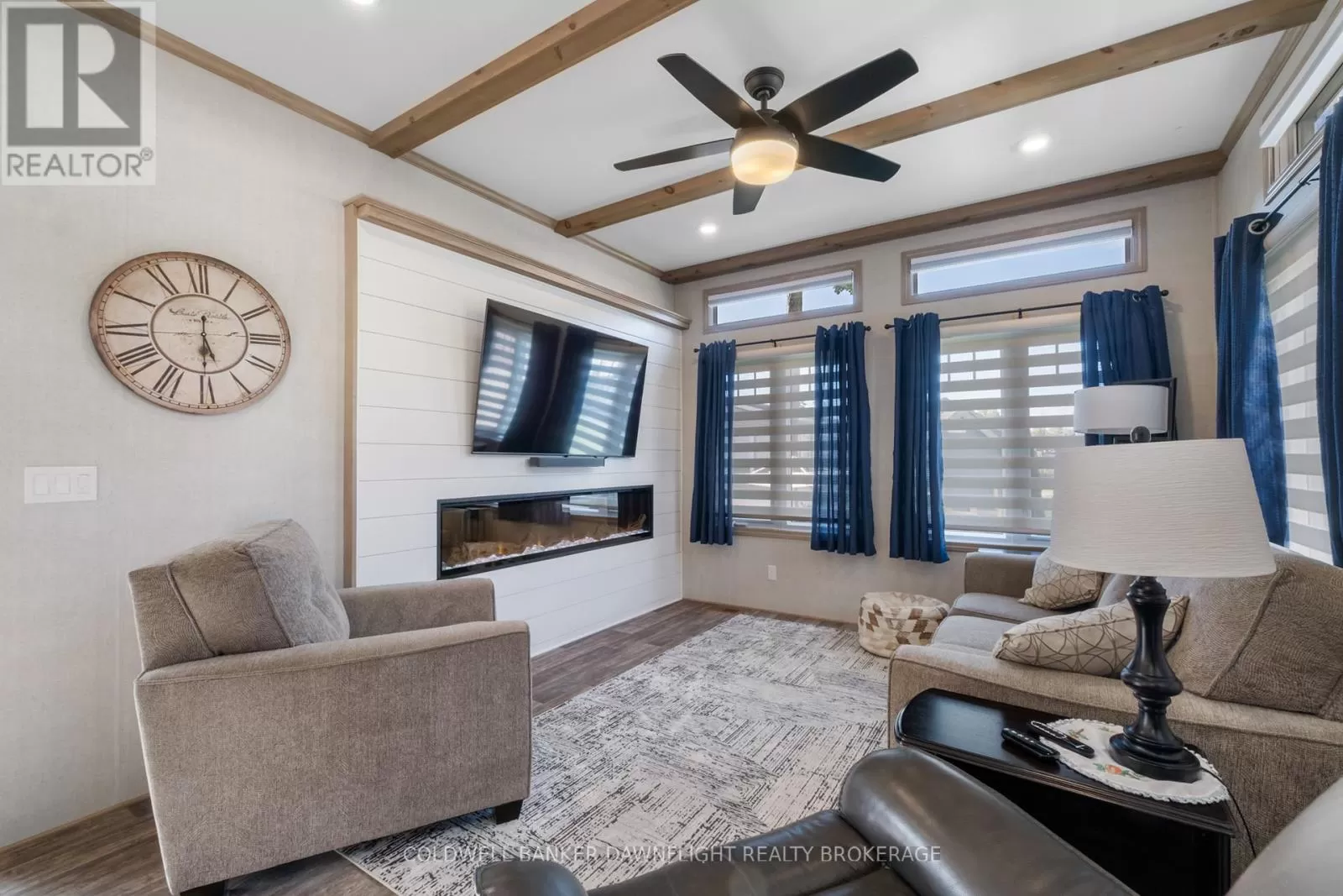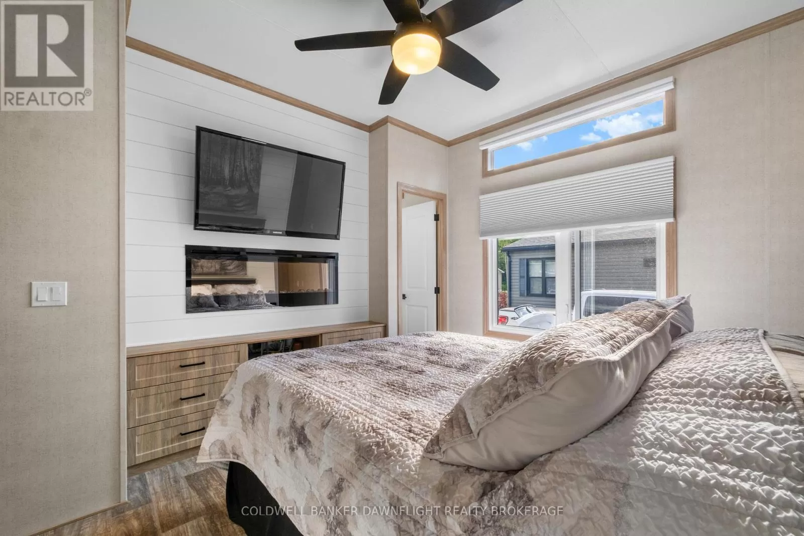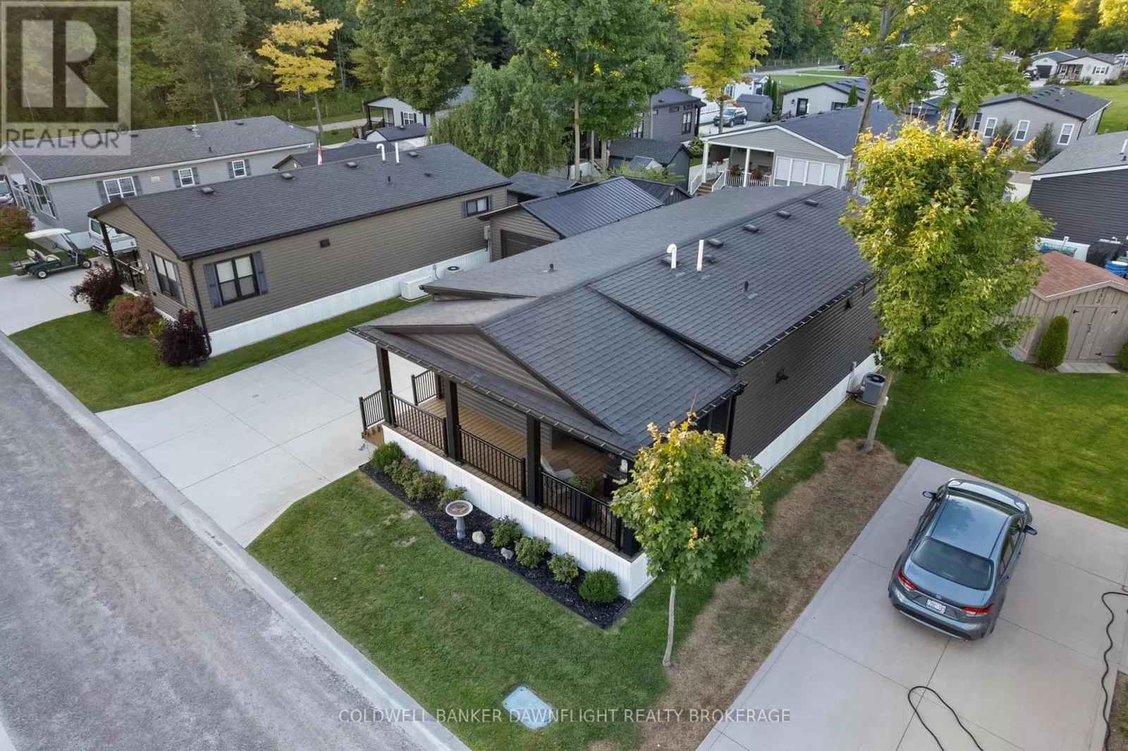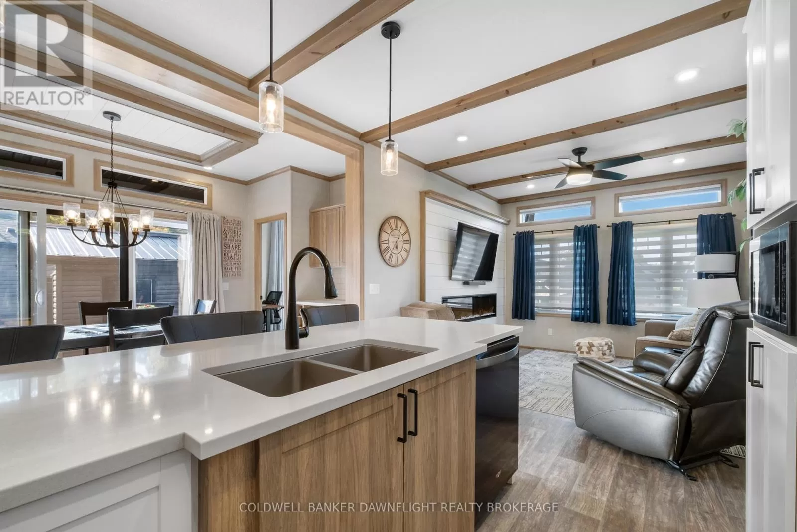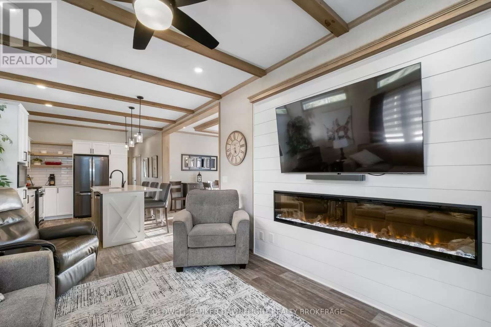 Cross Streets: Hwy 83 - Dashwood Road. ** Directions: Take Dashwood Road (Hwy 83) west from Dashwood to 36501 Dashwood Road. Welcome to Birchbark Estates, where this beautifully maintained Northlander home, built in 2019, offers 1,012 sq. ft. of comfortable living just minutes from Grand Bend and the shores of Lake Huron. The open-concept main floor features a bright white kitchen with quartz countertops, a spacious island with seating for four, and a welcoming living room complete with an electric fireplace and shiplap surround. The home includes two bedrooms, highlighted by a primary suite with a walk-in closet with built-ins, a second electric fireplace with matching shiplap detail, and a private 4-piece ensuite with a walk-in shower and double vanity. A second full bath and a well-appointed laundry room with built-ins add convenience. Outdoor living is enhanced by a large covered front porch, perfect for entertaining, along with a 10x10 garden shed and an insulated 12x18 garage. Residents enjoy a monthly fee of $445, which covers road maintenance, snow removal, garbage, water, and sewer. An additional parking area is available for trailers, campers, and boats. The community also offers optional access to an indoor pool and fitness facility. Additional features include a forced-air gas furnace, central air, and even the option to drive battery-powered golf carts throughout the neighbourhood. (id:27476)