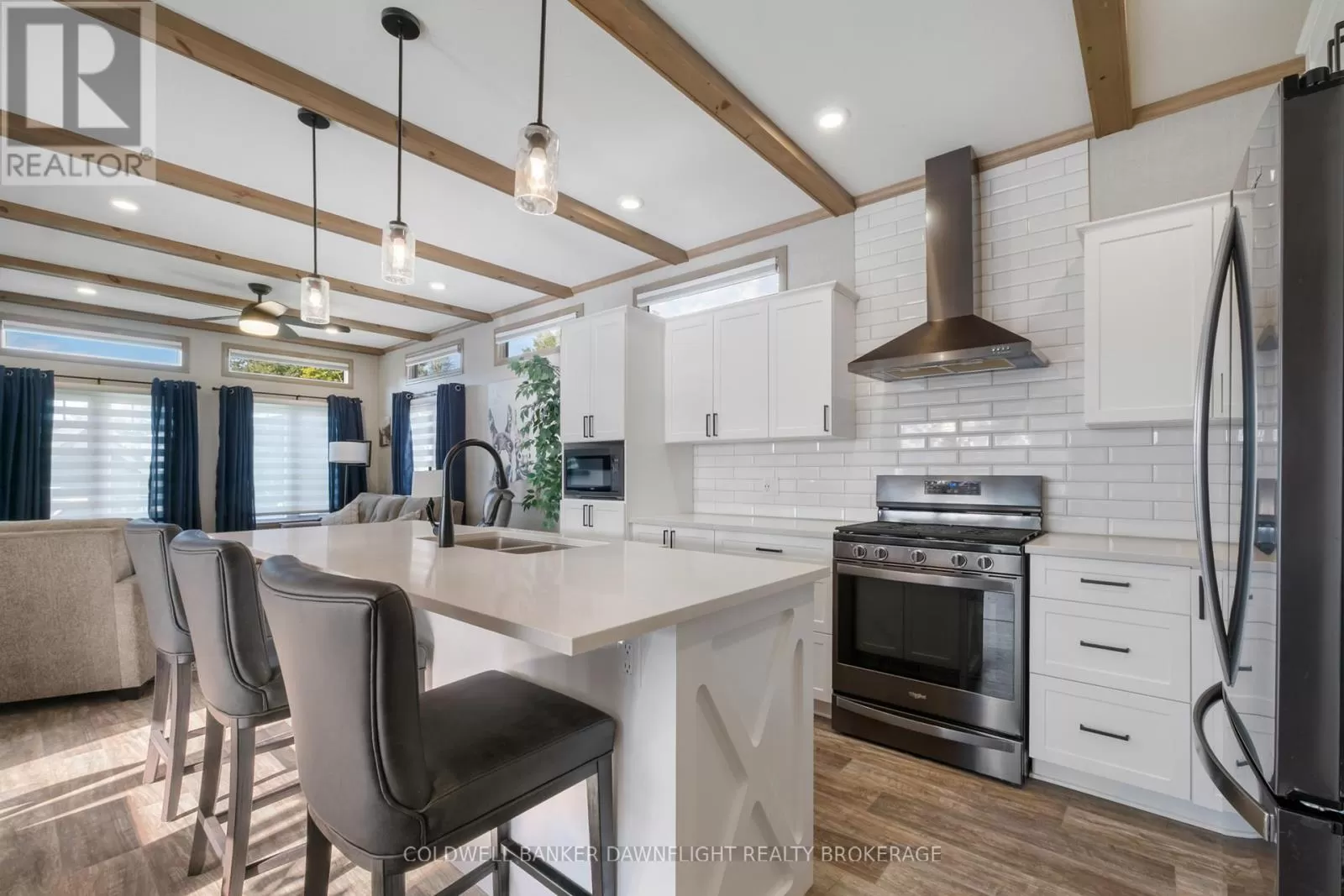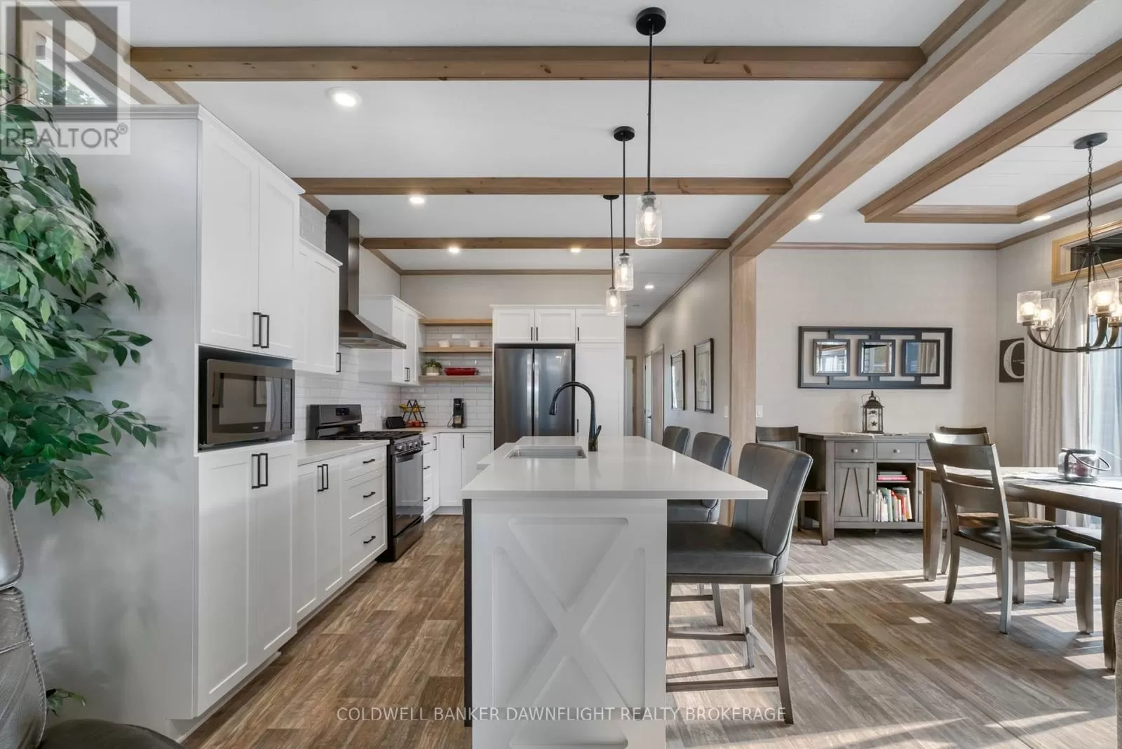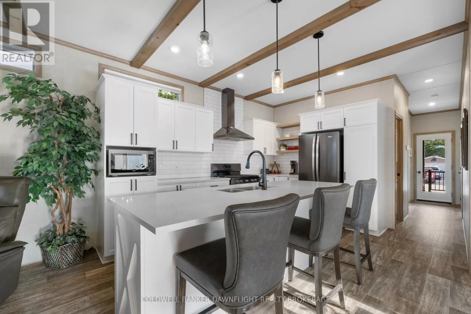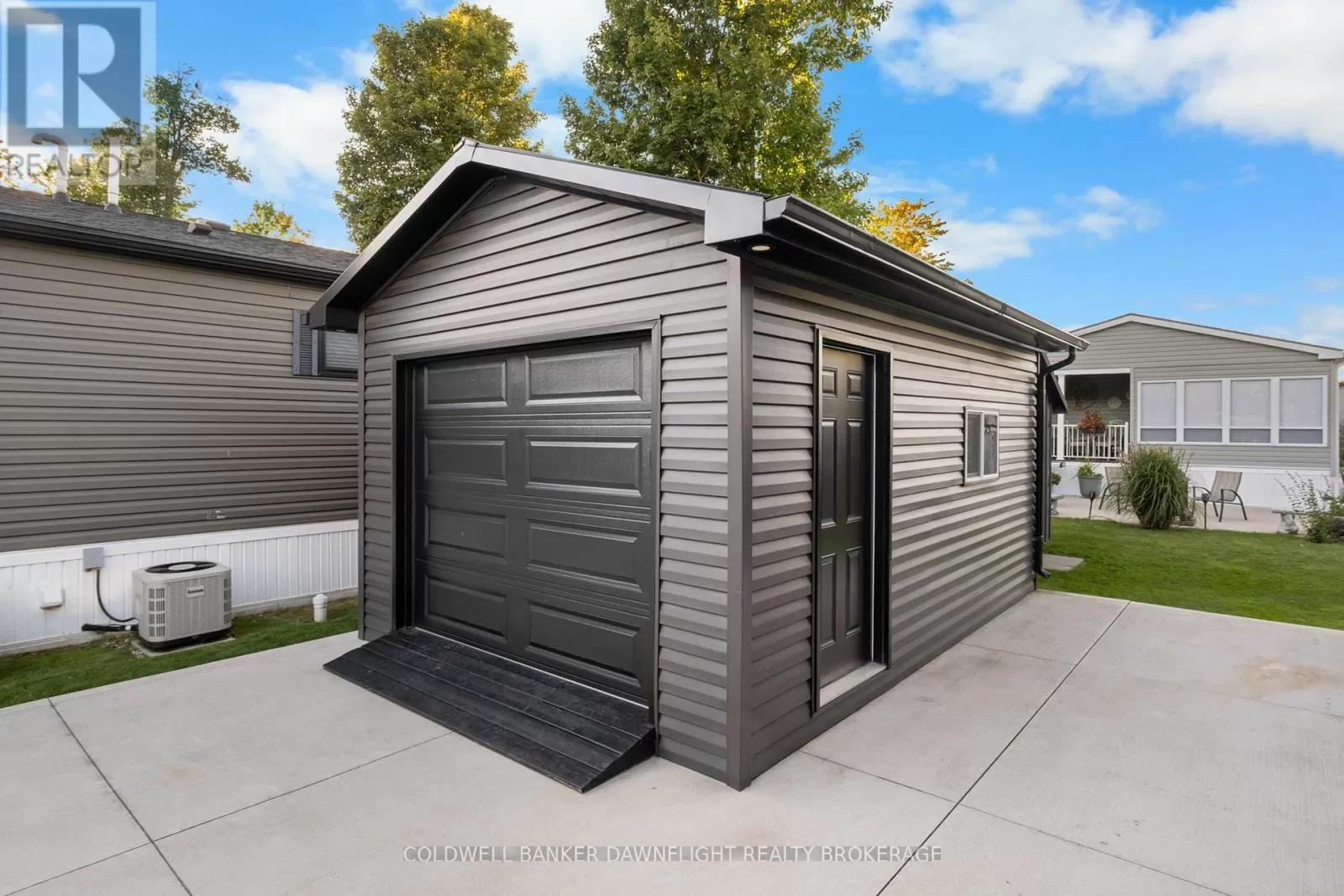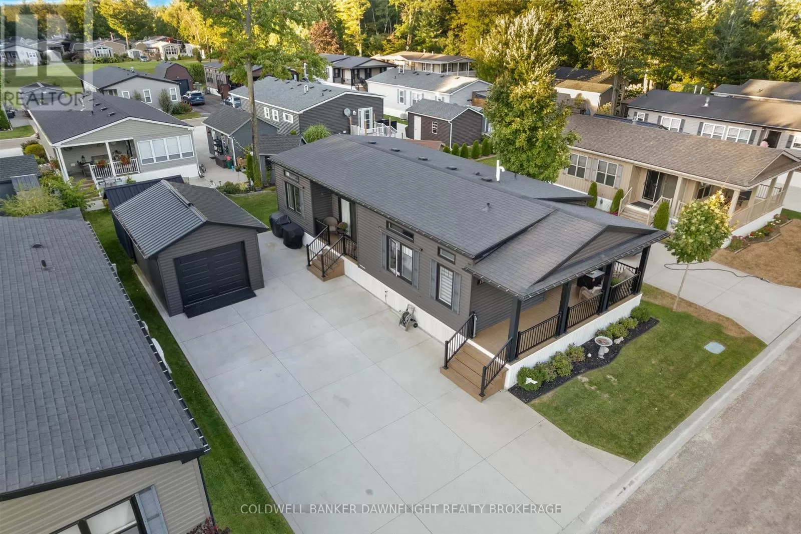 Cross Streets: Hwy 83 - Dashwood Road. ** Directions: Take Dashwood Road (Hwy 83) west from Dashwood to 36501 Dashwood Road. Welcome to Birchbark Estates, where this beautifully maintained Northlander home, built in 2019, offers 1,012 sq. ft. of comfortable living just minutes from Grand Bend and the shores of Lake Huron. The open-concept main floor features a bright white kitchen with quartz countertops, a spacious island with seating for four, and a welcoming living room complete with an electric fireplace and shiplap surround. The home includes two bedrooms, highlighted by a primary suite with a walk-in closet with built-ins, a second electric fireplace with matching shiplap detail, and a private 4-piece ensuite with a walk-in shower and double vanity. A second full bath and a well-appointed laundry room with built-ins add convenience. Outdoor living is enhanced by a large covered front porch, perfect for entertaining, along with a 10x10 garden shed and an insulated 12x18 garage. Residents enjoy a monthly fee of $445, which covers road maintenance, snow removal, garbage, water, and sewer. An additional parking area is available for trailers, campers, and boats. The community also offers optional access to an indoor pool and fitness facility. Additional features include a forced-air gas furnace, central air, and even the option to drive battery-powered golf carts throughout the neighbourhood. (id:27476)