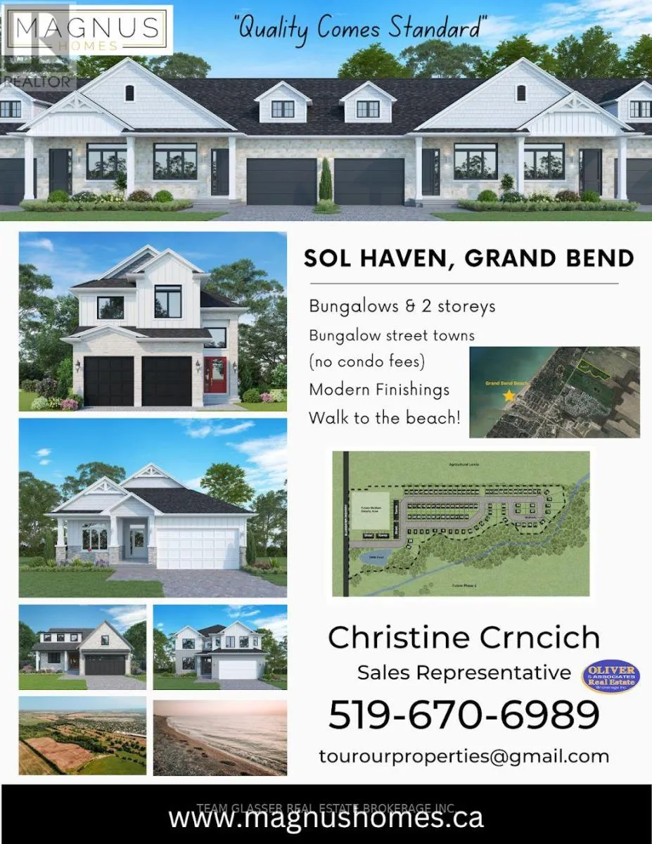 Cross Streets: A Few min North East of Main Grand Bend Lights - Highway #21 and Highway #81 (Main street Grand Bend at Bluewater Highway) Turn in to SOL on Dearing Drive. ** Directions: A Few min North East of Main Grand Bend Lights - Highway #21 and Highway #81 (Main street Grand Bend at Bluewater Highway) Turn in to SOL on Dearing Drive. To BE BUILT! Tasteful Elegance.This Bungaloft is Magnus Home's PLUM Model. This home is priced with a Premium Lot #75 that is Pie-shaped and backs on to the wooded ravine area OR (save $135,000 Premium) It could sit nicely on a 49 ft standard lot in the New SOL HAVEN sub-division in Grand Bend. 2215 Square Foot Model has a MAIN FLOOR PRIMARY with a large stunning ensuite and walk in closet! It is a Bungaloft with two bedrooms, a four-piece bath and a sitting area upstairs overlooking the cozy great room. Great for hosting guests or family. The 3 bed, 2.5 bath Plum features a loft-style second-storey. The main-floor also has a front office space, main floor laundry and powder room plus a cozy, window filled great room with soaring 18 ft High Ceilings. Large windows in the Basement is left untouched with possibilities open for you future plans and side door access for In-Law set-up. Magnus Homes has more styles to choose from including bungalows, two-story models and Many larger Premium lots, backing onto trees like this one, ravine and trails to design your custom Home. Start to build your Home with Magnus Homes for Late summer '26. Great Beach community with country feel - Close to the Golf course, restaurants, walk to the grocery store and the beach for Healthy living! The Pinery has Wooded trails & Plenty of community activities close-by. We'd love to help you Build the home you hope for - Note: Listing agent is related to the Builder/Seller. We're looking forward to a Spring start! Grand Bend - Sol Haven. Meet with Magnus today. Where Quality comes Standard & Never miss a Sunset! **Photos are other Magnus Homes beautiful Models**Ask us about near Net Zero possibilities for your new home!** Open House Bungalow Sat/Sun 2-4@ 4 Sullivan Street (and the Towns at 22 Dearing Dr) Come and see this new community. Turn right onto hwy 21 heading north from the Grand Bend Main st. Watch for Yellow Flags for Sol Haven on your right. (id:27476)
