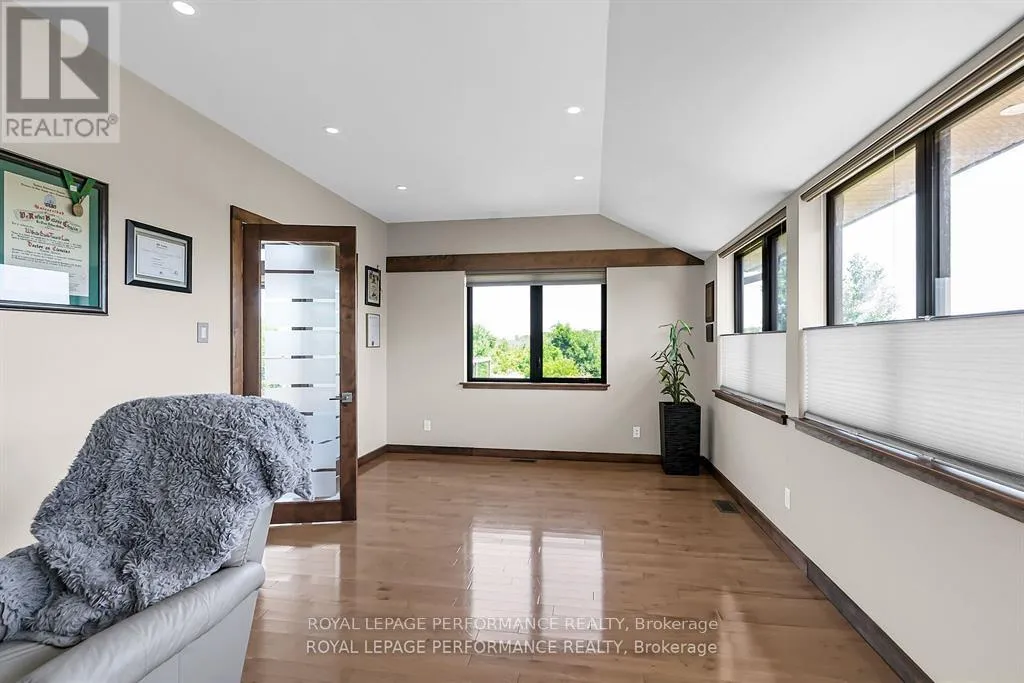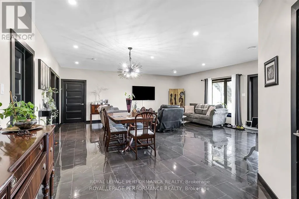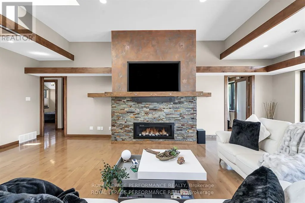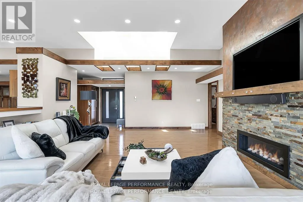 From Highway 2 East of Long Sault, go North onto Fickes Road. Turn left onto Forest Hill Road. Turn right onto George Patrick Drive. The property is on the right side of the road. Modern and elegant 3+2 bedroom home with walkout situated in the prestigious Arrowhead Estates. A world of sophisticated design awaits you in this meticulously crafted modern home. The open-concept living area seamlessly flows into a gourmet kitchen. It features solid walnut cabinetry, stainless steel appliances, pantry and quartz countertops. An abundance of LED and natural lighting accentuate the clean lines and minimalist aesthetic. The ledge stone fireplace is the centrepiece of the spacious living room. The primary suite, complete with a spa-like ensuite bath, tiled shower and walk-in closet. The 2nd and 3rd bedrooms with ample closet space. Gaze at the morning sunrise from the large resin deck with glass railings. A perfect space for entertaining or relaxing. Finished walkout with in law suite potential, boasts a heated flooring, functional kitchen and breakfast bar, family room with gleaming tile, 3pc bathroom, 4th and 5th bedroom, fitness room and laundry. Other notables: Power skylights, solid wood doors and trims, ICF construction, hot water on demand, 3 car garage with heated floor and room for toys, landscaped. With over 5000 sq feet of finished living space, the possibilities are endless. *Some photos have been virtually staged. (id:27476)