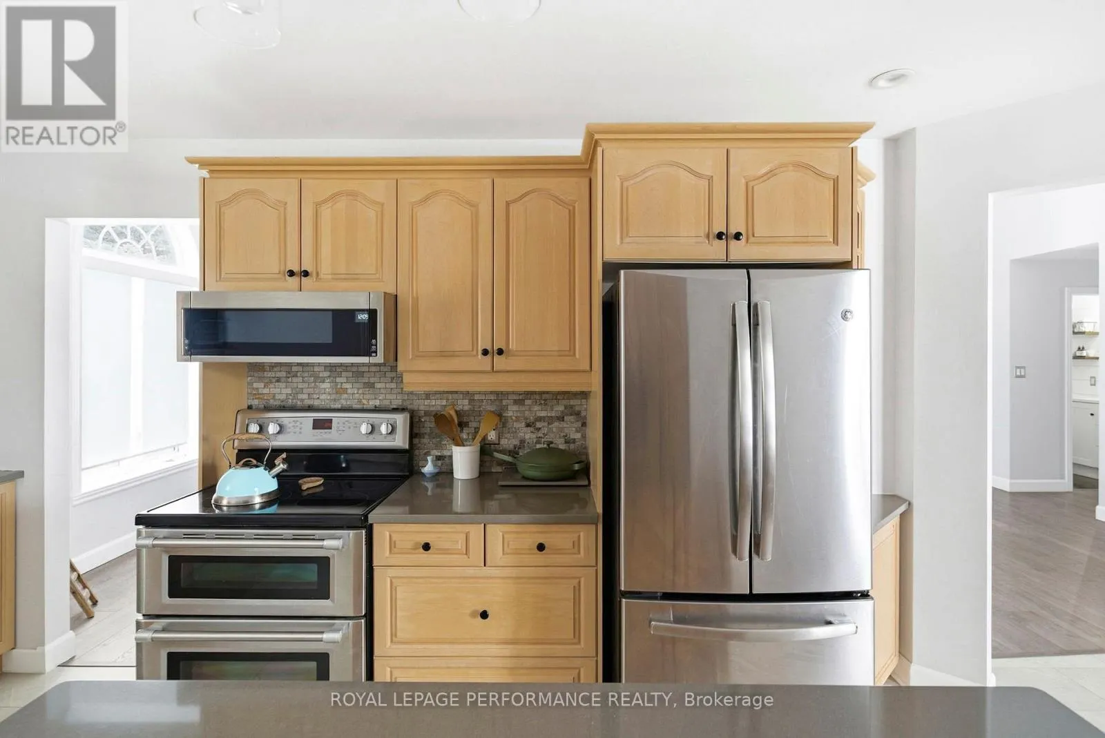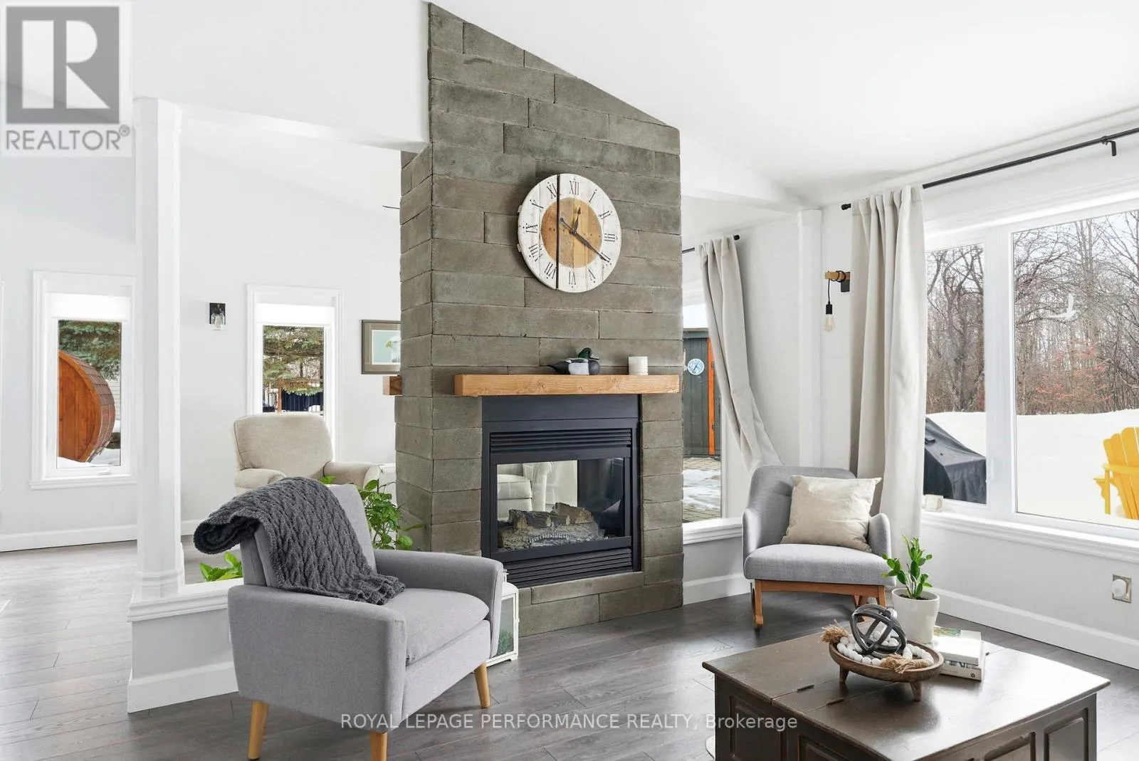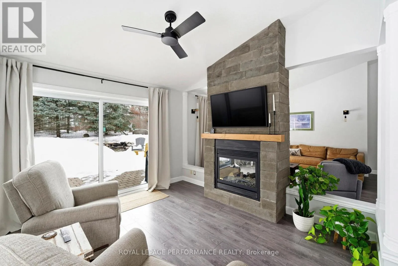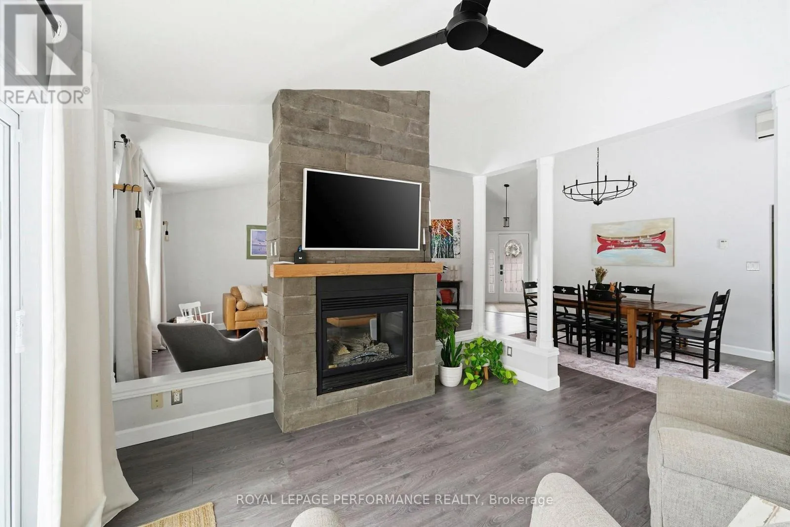 Cross Streets: Barry St. and Barnhart Dr. ** Directions: From County Rd 36. North on Barnhart Dr. to the Corner of Barnhart Dr. and Barry St. This uniquely designed and stylish 3-bedroom home with garage sits proudly on a rare double lot and delivers effortless one-level living. Built slab-on-grade, it's ideal for buyers seeking a low-maintenance, mobility-friendly lifestyle without compromising on design or comfort. Step inside to a spacious, light-filled open concept layout where the living and dining areas soar with vaulted ceilings. Radiant heated floors keep things cozy, while a striking two-sided gas fireplace with a modern stone surround adds warmth and flair. The custom eat-in kitchen (2015) is both functional and refined, featuring quartz countertops, centre island, backsplash, and stainless steel appliances. The primary bedroom offers a private retreat with a 3-piece ensuite highlighted by a charming clawfoot soaker tub. Two additional well-sized bedrooms provide flexibility for family, guests, or a home office. A 3-piece guest bathroom with shower completes the interior. Outside, the backyard is designed for entertaining and relaxing, complete with a large interlocking patio, stonewall garden, fire pit, and storage shed. Additional highlights include a dedicated laundry room, central air conditioning, Generac generator, ICF Blue Max construction, tankless hot water heater (2022), washer and dryer (2023), roof shingles (2015), and extensive updates to paint, trim, and flooring. Other notables: Garage door 2025, light fixtures, washroom vanity, garden / storage shed refurbished Gutter guards, landscaped gardens, and an interlocked driveway round out the package. Ideally located close to recreation and everyday amenities, this home blends modern comfort, smart upgrades, and standout design-an exceptional opportunity on a truly impressive lot. Parks of the St. Lawrence, golf, schools, church and other amenities nearby. 10 min to Cornwall. Allow 24 hour irrevocable on offers. (id:27476)