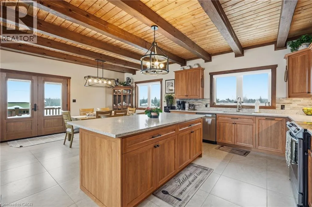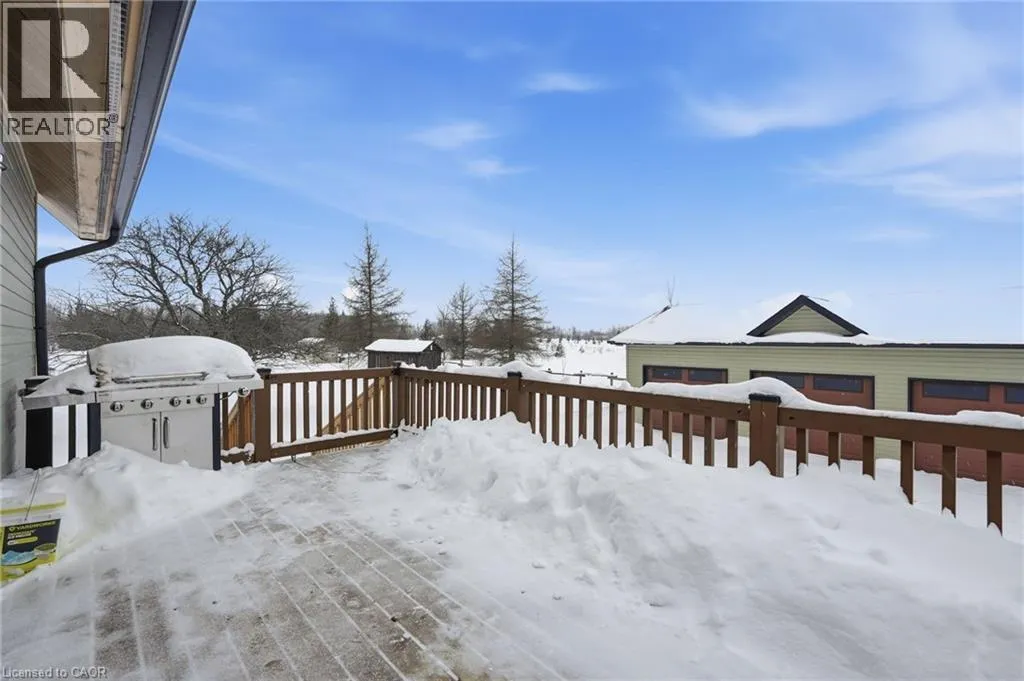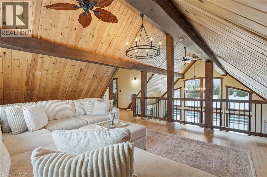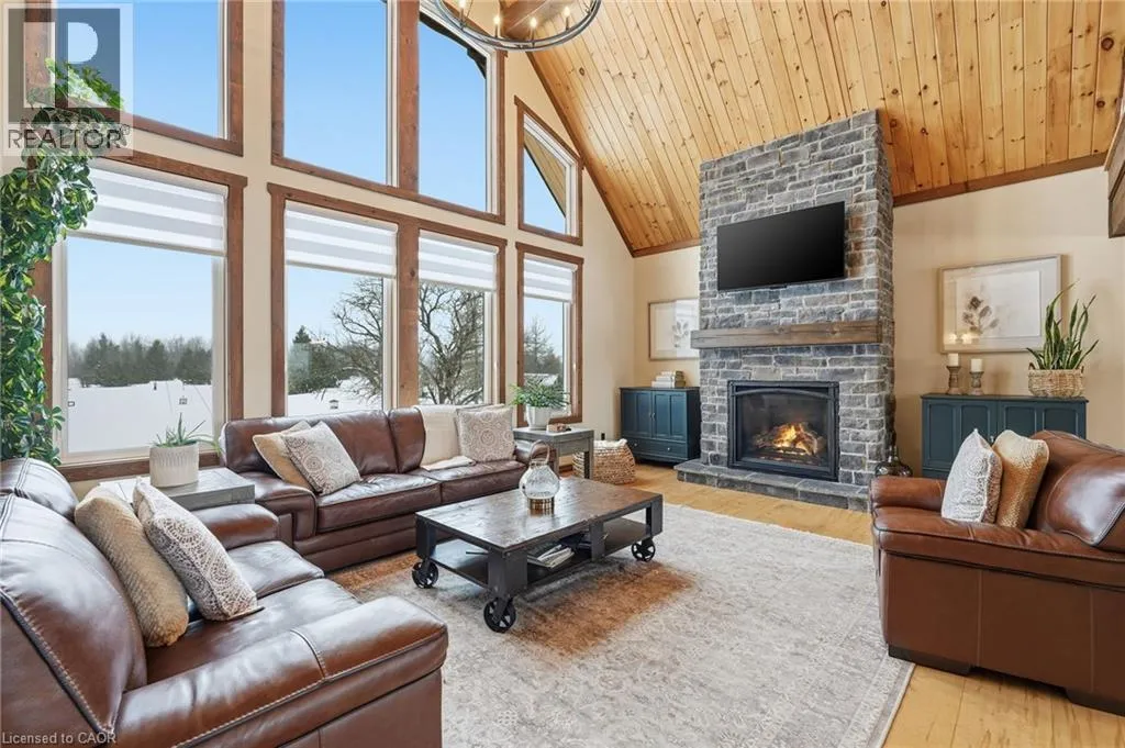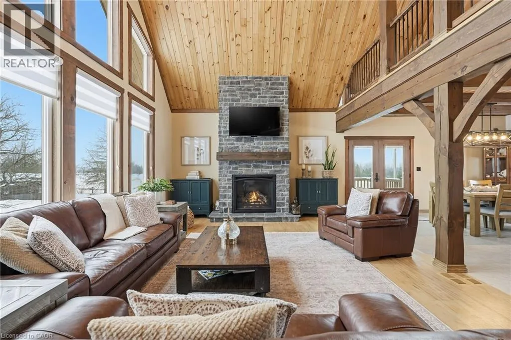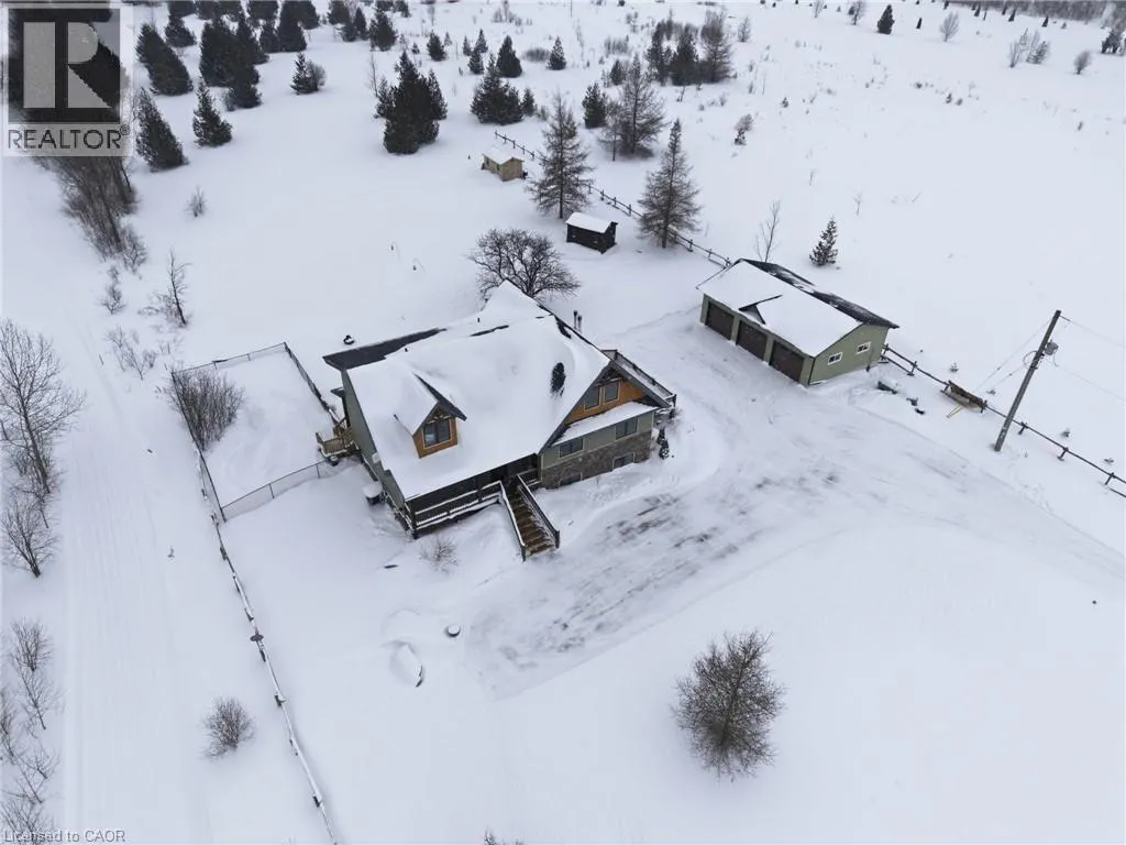 Take Southgate Sideroad 49 to Southgate Rd 12, South Side. Welcome to this truly special 3-bedroom, 3-bathroom timber-framed home, perfectly set on a beautifully landscaped almost 5.5-acre lot just a hop, skip, and a jump from Mount Forest. The heart of the home is the spectacular great room, featuring vaulted ceilings, a floor-to-ceiling stone fireplace, and a stunning wall of windows that frames peaceful views of the surrounding nature. A spacious loft overlooks the great room, offering flexible space for a home office, reading nook, or guest area. The large, open-concept kitchen flows seamlessly into the great roomâideal for entertaining or everyday living. The main-floor primary bedroom provides comfort and convenience, while the finished lower level impresses with high ceilings, large windows, heated floors, and an additional stone fireplace, creating a warm and inviting retreat. Outside, the property truly shines with a picturesque pond, mature landscaping, and endless room to enjoy the outdoors. Car enthusiasts, hobbyists, or tradespeople will love the massive 24â x 36â detached garage/workshop. This is country living at its best. Donât be TOO LATE*! *REG TM. RSA. (id:27476)