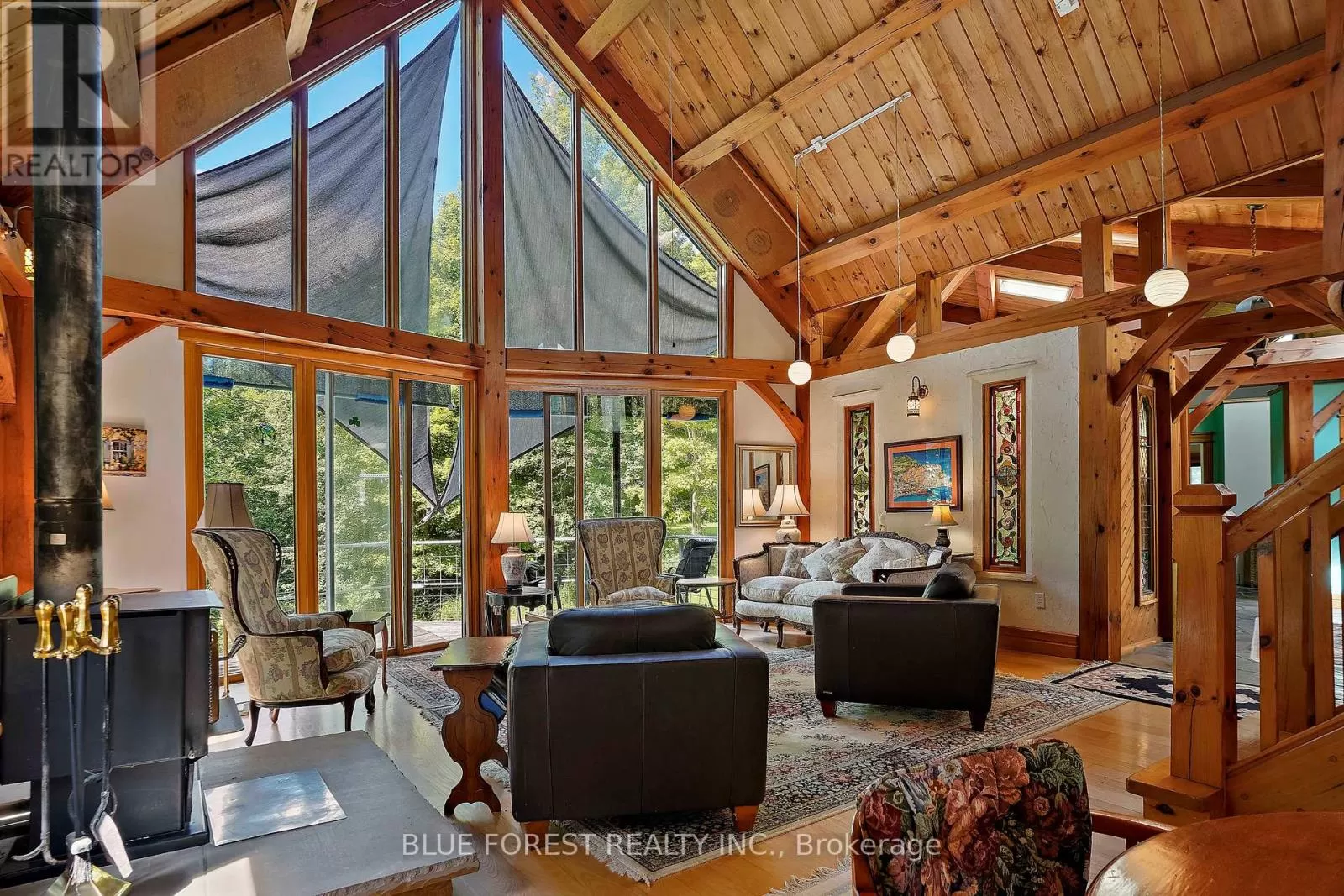 Cross Streets: Iona Road. ** Directions: From 401 - Head North on Iona Road... Head East on First Line. Timber frame Chalet on 93 Acres with Thames River Frontage! Incredible opportunity to own a custom Timber frame Chalet built by the founder of Pineridge Log and Timber frame. (Builders of Cow Bell Brewery in Blyth) Situated on 93 acres with 1000 feet of frontage on the Thames River, this picturesque property offers the perfect blend of natural beauty, privacy, and modern comfort just 3 minutes to Hwy 401 and 20 minutes to London. The home features 3 bedrooms, 2 bathrooms (Cheater Ensuite to Master), Fully finished Walk-Out basement and an attached 2-car garage, all set against a backdrop of 50 workable acres, hardwood forest, and a 1 km private walking trail. Premium features include a shake-style metal roof with a 75-year warranty (installed 2005) and Site sourced 3/4 ash hardwood flooring in the living and dining rooms. The gourmet kitchen includes a walk-in pantry and a dishwasher (2022), overlooking the terrace with a retractable Komoka awning (2020). Oversized 8' Pella patio doors, windows, and skylights fill the space with natural light. Stay cozy year-round with a wood stove as well as a heat-pump furnace with A/C (2023), multi-zoned solar-heated floors (kitchen, foyer, 2 baths, lower bedrooms, and hallway), and 2 owned water heaters. Additional highlights include 200-amp electrical service, exterior roll-up blinds on patio doors, Front and Rear decks, and Antique stained glass accents and fixtures, all in a home that combines energy efficiency with timeless craftsmanship. Whether you're looking for a peaceful retreat, productive farmland, or an outdoor lifestyle property with river access, this one-of-a-kind estate delivers. (id:27476)