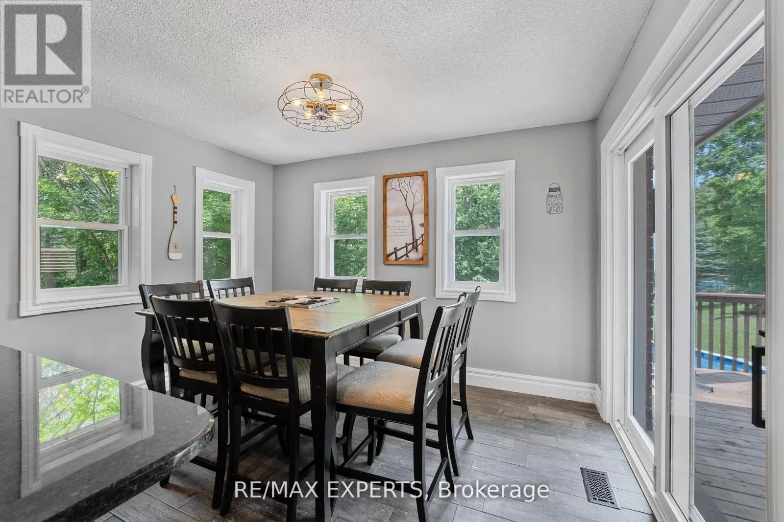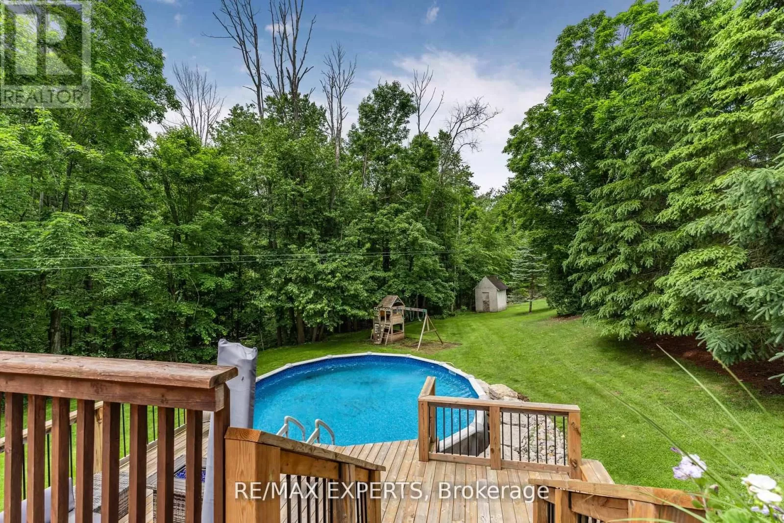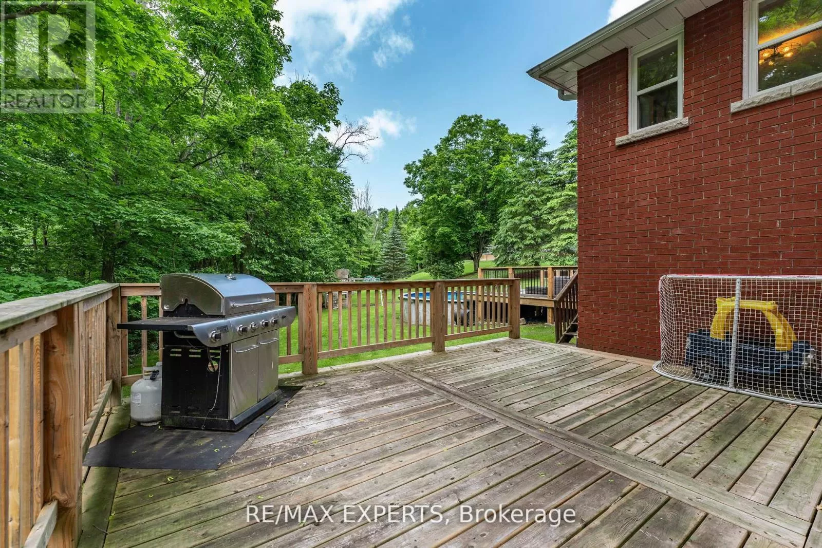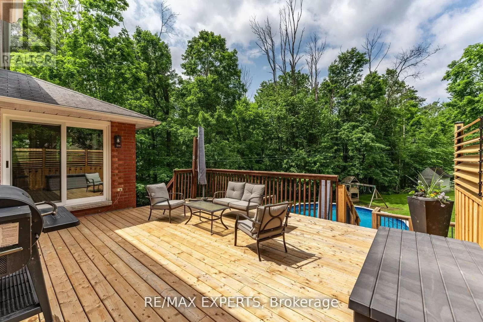 Moonstone/Scarlett Line Jump on in to your own private backyard pool surrounded by green space, complete with a full custom wraparound deck and entertaining area! This incredible home is situated on one of the best lots in the entire neighborhood. Backing and siding onto the Simcoe County Forest, you and your family are surrounded by peace, quiet and tranquility. Enjoy spending time with your family and friends entertaining in your sprawling and private back and front yard, complete with an above ground pool and integrated deck with gas fireplace and seating area, and children's playground. Step inside to a large well laid out floor plan, with a main floor office space, formal dining room, eat in kitchen with breakfast area overlooking the backyard, and sunken living room with walkout to your private deck. Upstairs you're greeted with 4 large bedrooms, the primary suite having a full 5 piece ensuite bath. Each bedroom has a generous sized closet and window that allows lots of natural light. The roof has 2 skylights installed for even more natural light to enter the home. The basement is completely finished, with a walkout, a kitchen, and a separate bedroom for income potential, or an in-law suite. Garage complete with workshop area for the man of the house! This home truly checks all the boxes. This is the home you can enjoy with your entire family and friends. Imagine all the memories you can make with your family running around and playing on this property. See Wildlife from your home. Deer can be seen from your bedroom windows! Neighbours nearby sell fresh eggs, meats, fruits vegetables and flowers, from farm to table! Total above ground square footage is 2546 plus the finished walkout basement. (id:27476)