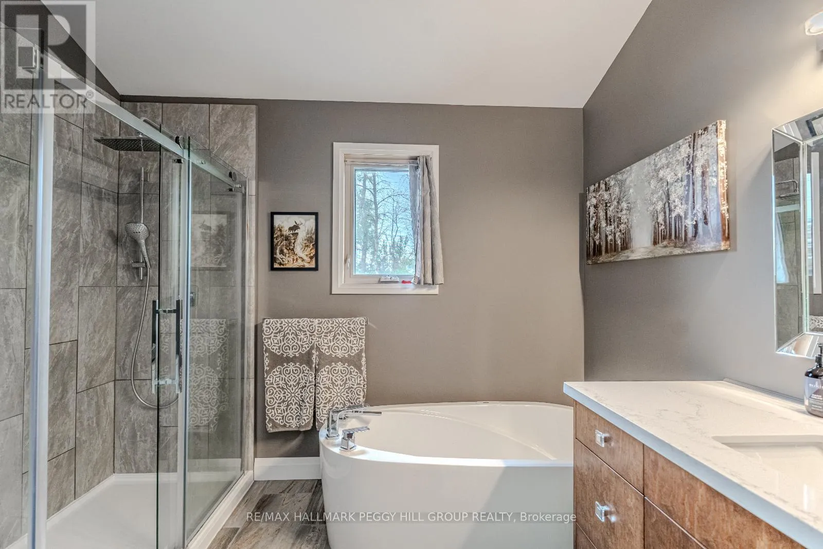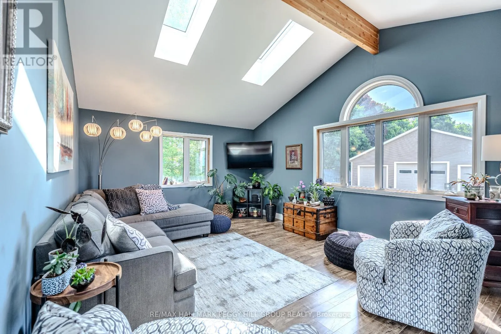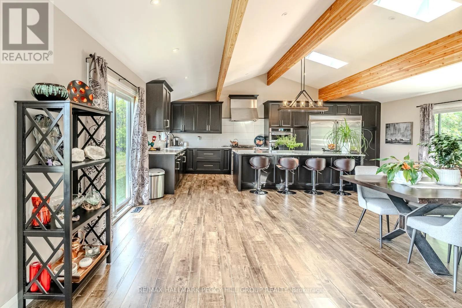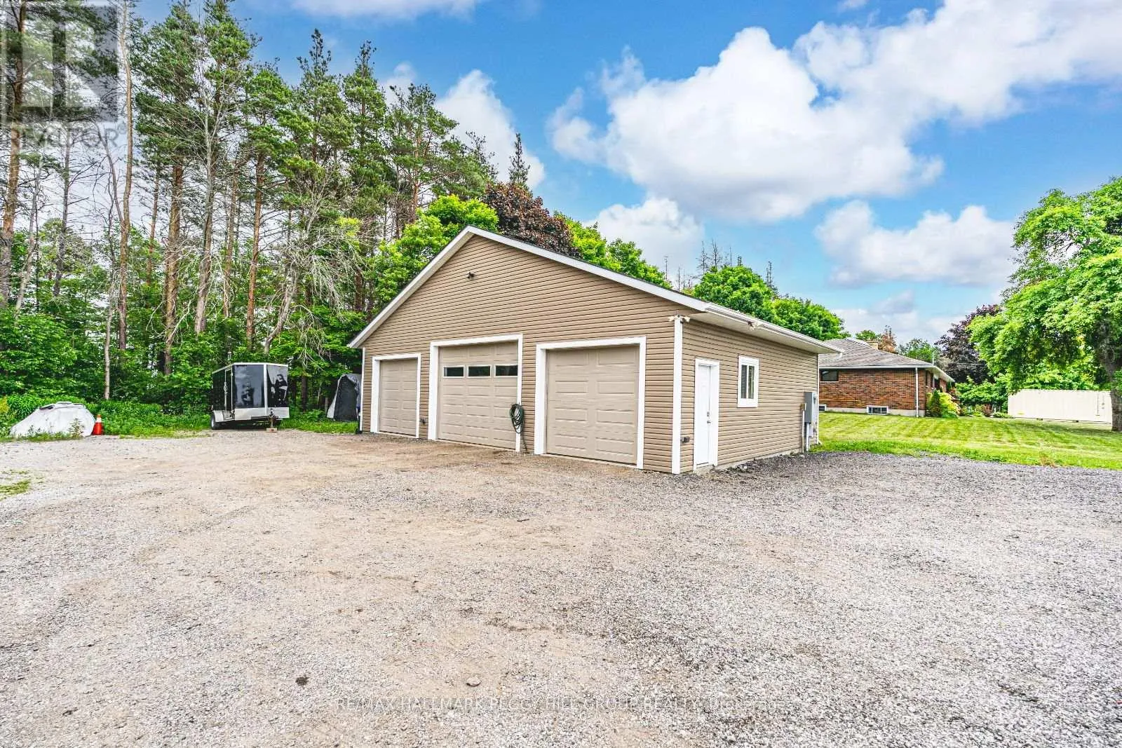 Cross Streets: County Rd 27/County Rd 6. ** Directions: Queen St/Simcoe County Rd 27/Turn left onto County Rd 6 S. BOLD ARCHITECTURE, LUXURY UPGRADES, A HEATED 3-BAY SHOP, & SEPARATE 200 AMP SERVICE TO BOTH THE HOUSE & THE SHOP ON OVER HALF AN ACRE OF COUNTRY LIVING! Step into this 2019 Linwood home offering over 3,300 sq ft of finished living space on a beautifully landscaped half-acre lot, just minutes from downtown Elmvale. Enjoy an unmatched lifestyle close to Wasaga Beach, the Elmvale Jungle Zoo, Tiny Marsh, parks, schools, a library, an arena, and beloved community events like the Maple Syrup Festival and Fall Fair. This property is designed to impress, with a striking A-frame roofline, oversized triple-pane windows, double-door entry, manicured gardens, a stone patio, gazebo, and full landscape lighting with built-in irrigation. The heated and insulated detached shop with 3 garage doors, a commercial-grade Liftmaster opener, and dedicated 200 amp service is a dream for hobbyists and professionals alike. Inside, vaulted ceilings with exposed Douglas Fir beams, floor-to-ceiling windows, skylights, and designer LED lighting create an unforgettable interior. The modern kitchen boasts quartz counters, dark shaker cabinets, tile backsplash, an under-mount sink, island seating, and premium Jennair appliances, opening to a stylish dining space with wide patio doors, and a breathtaking living room. A skylit family room and two main floor bedrooms served by a 4-piece bath elevate everyday comfort, while a custom maple staircase with an engineered steel mono stringer leads to a loft-style primary suite with a custom walk-in closet and an ensuite with an air jet tub and imported Italian glass shower. The partially finished basement adds a rec room, bedroom, full bath, and a utility room with a tankless water heater, softener, UV system, and 4-filter water treatment. With a Generac and blown-in insulation for added efficiency, every detail is thoughtfully crafted to create an extraordinary lifestyle, and a truly rare opportunity to live and entertain in style! (id:27476)