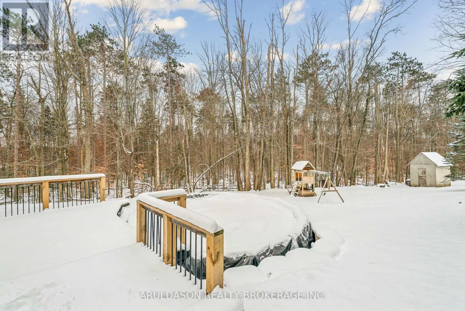 Moonstone/Scarlett Line Dive into your own private backyard oasis featuring a sparkling above-ground pool, lush green surroundings, and a fully customized wraparound deck designed for hosting and relaxation. This remarkable property sits on one of the most desirable lots in the entire community, with both the rear and side of the home bordering the serene Simcoe County Forest-offering unmatched privacy, calm, and natural beauty.The expansive front and back yards provide endless space for gatherings with family and friends, complete with an integrated deck, gas fireplace lounge area, and a dedicated children's play space.Inside, the home presents a spacious and functional layout. The main floor includes a bright office, a formal dining room, an eat-in kitchen with a breakfast area overlooking the yard, and a cozy sunken living room that opens directly onto your private deck. Upstairs, you'll find four generously sized bedrooms, including a primary suite with a full 5-piece ensuite. Every bedroom offers ample closet space and large windows that fill the rooms with natural light. Two skylights on the roof further elevate the brightness of the home.The fully finished walkout basement features its own kitchen and separate bedroom-ideal for multigenerational living, guests, or income potential. The garage includes a dedicated workshop area, perfect for hobbyists.This home truly offers everything: space, comfort, nature, and endless opportunity for family enjoyment. Picture your children running freely across the property, wildlife sightings right from your windows-including deer-and a warm, friendly community where neighbors sell fresh eggs, meats, produce, and flowers straight from their farms.Total above-ground living space is 2,546 sq ft, plus the finished walkout basement. (id:27476)