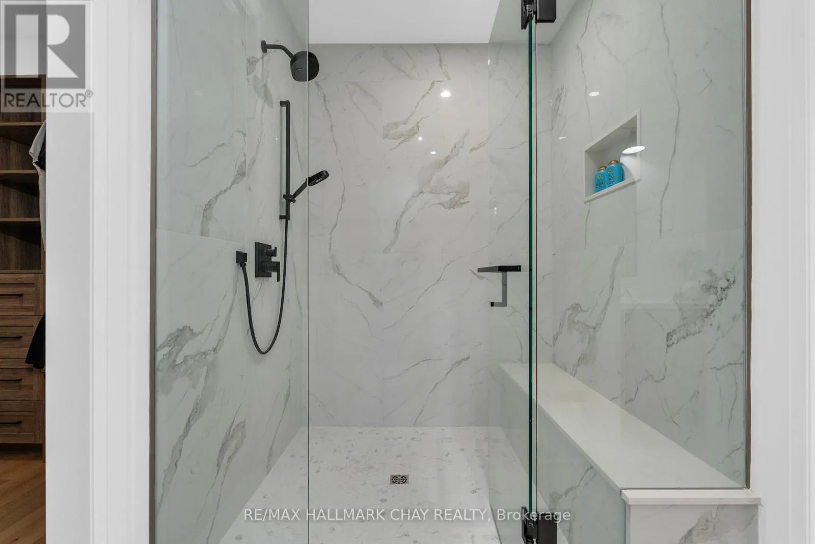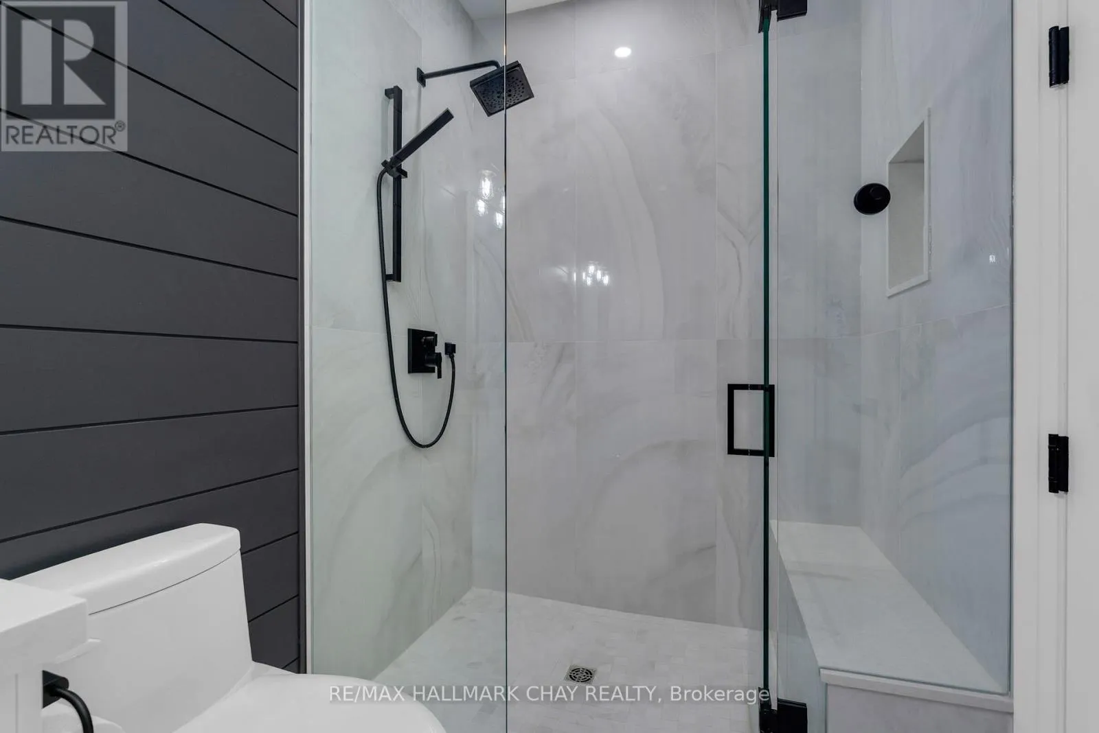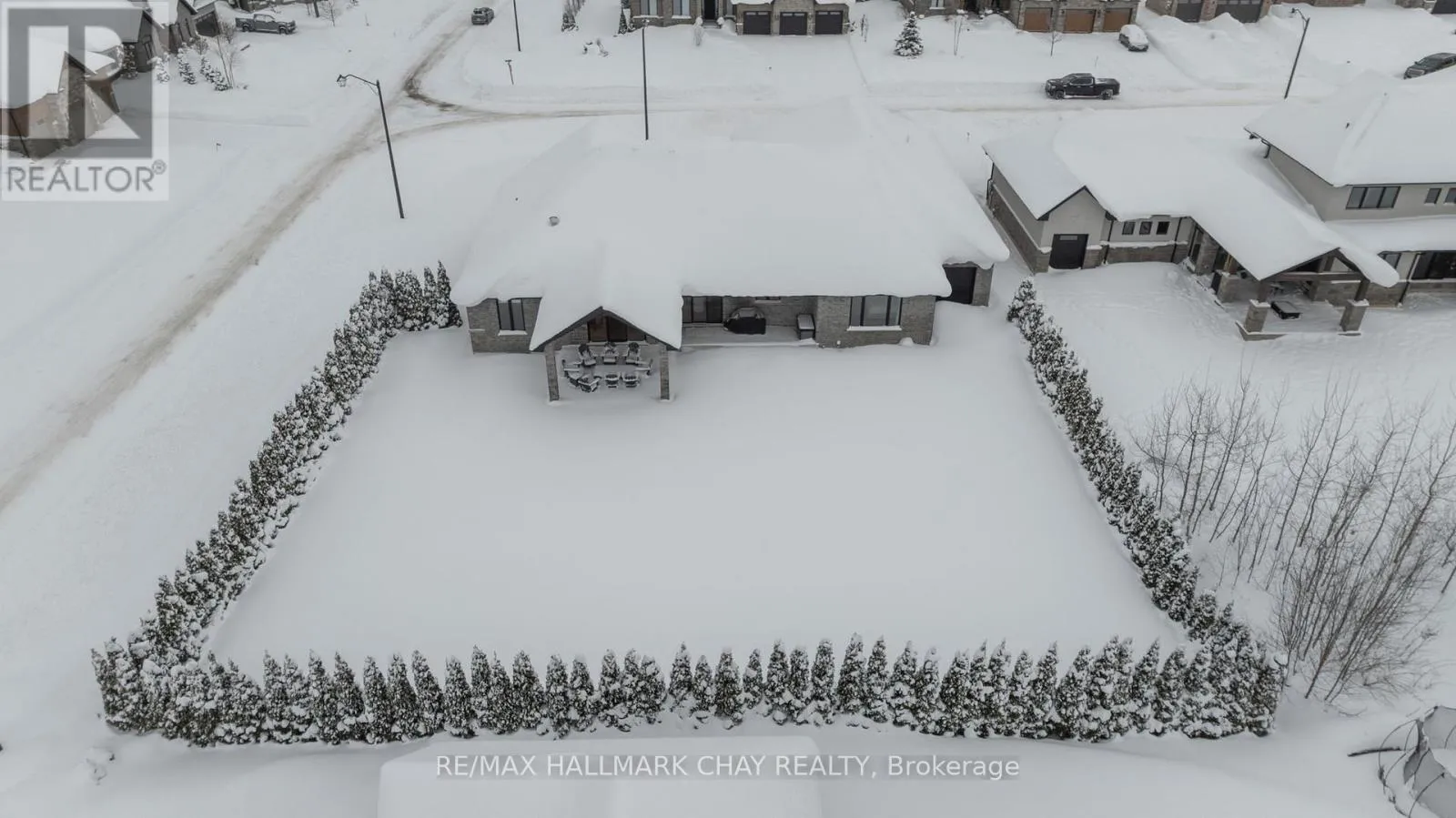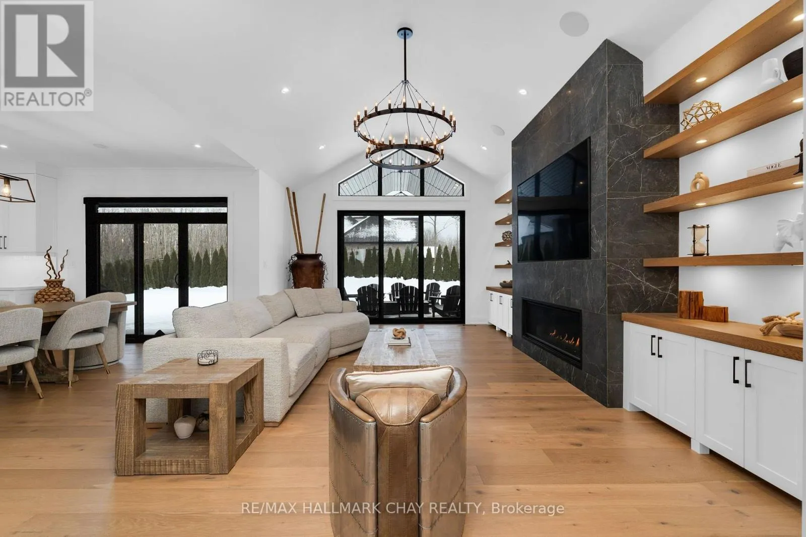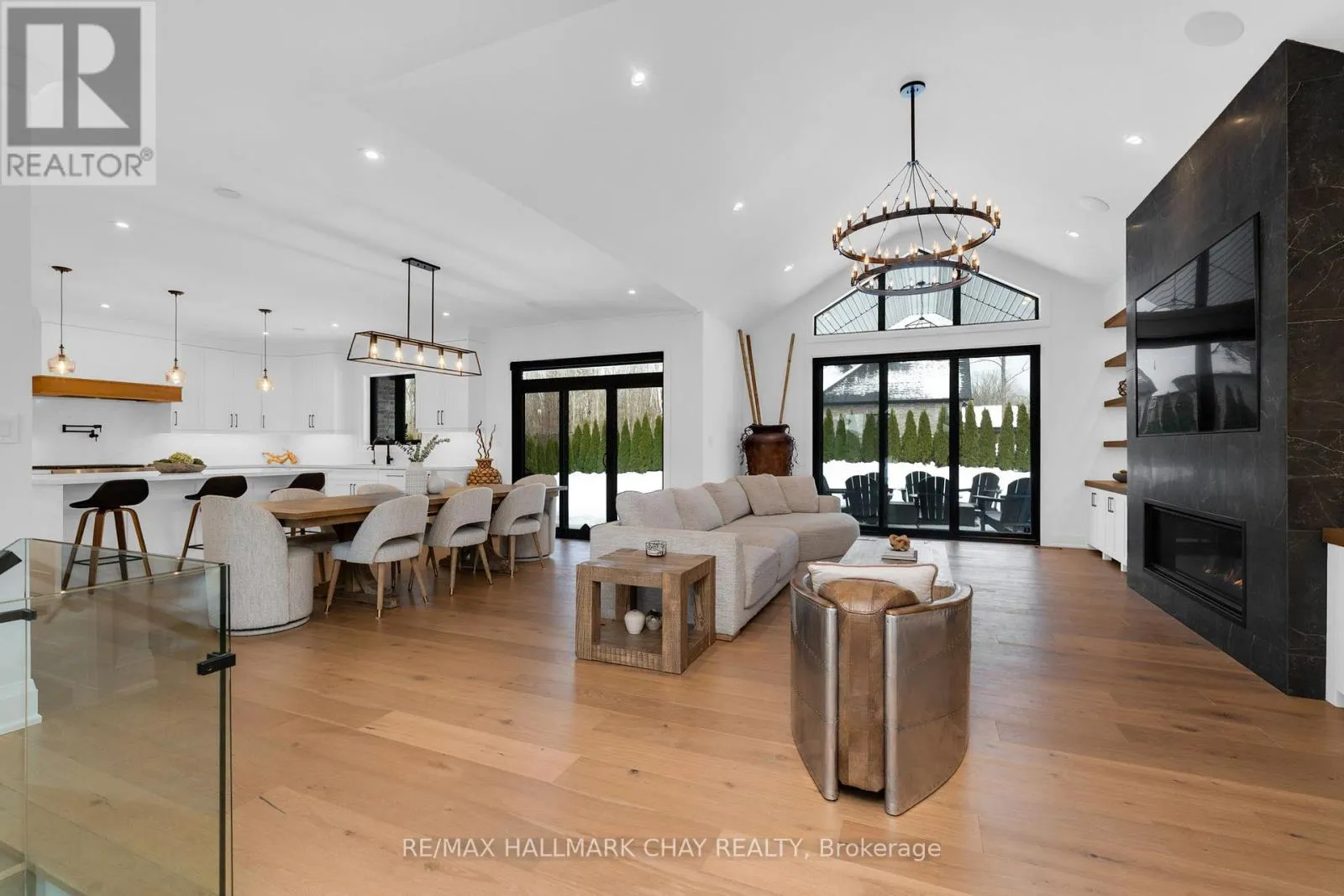 Cross Streets: Wilson to Seadon. ** Directions: Byers to Glenna to Morrison. PRESENTING luxury, lifestyle, privacy, and an exquisite location-all embodied in this stunning custom executive residence in Springwater's prestigious, family centric Cameron Estates. Set on a premium half acre corner lot, this exceptional bungalow offers 5,700+ sq.ft. of finished living space and an oversized 133'x187' private backyard framed by mature cedars and one of the community's largest reclaimed greenspaces. With over $550K in recent updates/upgrades, this home delivers an elevated living experience inside & out. The main level showcases a designer Chef's kitchen with expansive prep space, oversized island with integrated beverage centre, premium Jenn Air 6 burner + griddle range, dual ovens, Dacor fridge/freezer, and walk in pantry with prep sink. Great room impresses with a striking 63" floor to ceiling gas fireplace, vaulted ceilings, and wall to wall views of the private rear yard. Additional main floor features include a dedicated home office, guest 2 pc bath, spacious laundry/mudroom, and three generous bedrooms-each with its own ensuite and walk in closet. The full, finished lower level doubles the living space and continues the home's refined neutral palette. Purpose built for relaxation and entertainment, this level features a spa inspired steam room, home gym with heated padded flooring, guest suite, custom four queen designer bunk room, rec room with linear fireplace and built ins, games room, home bar, office, soundproof gaming room, and additional 2 pc bath. Energy efficient water heated flooring runs throughout. Smart home conveniences include whole home audio (14 zones, 7 Sonos amps, 37 speakers), remote electric blinds, 7 camera security system, wall mounted TVs, and Bell Fibre internet. Car enthusiasts will appreciate the oversized 1,600+ sqft heated 5 vehicle garage, complete with epoxy floors, storage, EV ready wiring, built in audio/TV, pressure washer system, direct basement access with mud room, and rear garage door to the backyard. (id:27476)