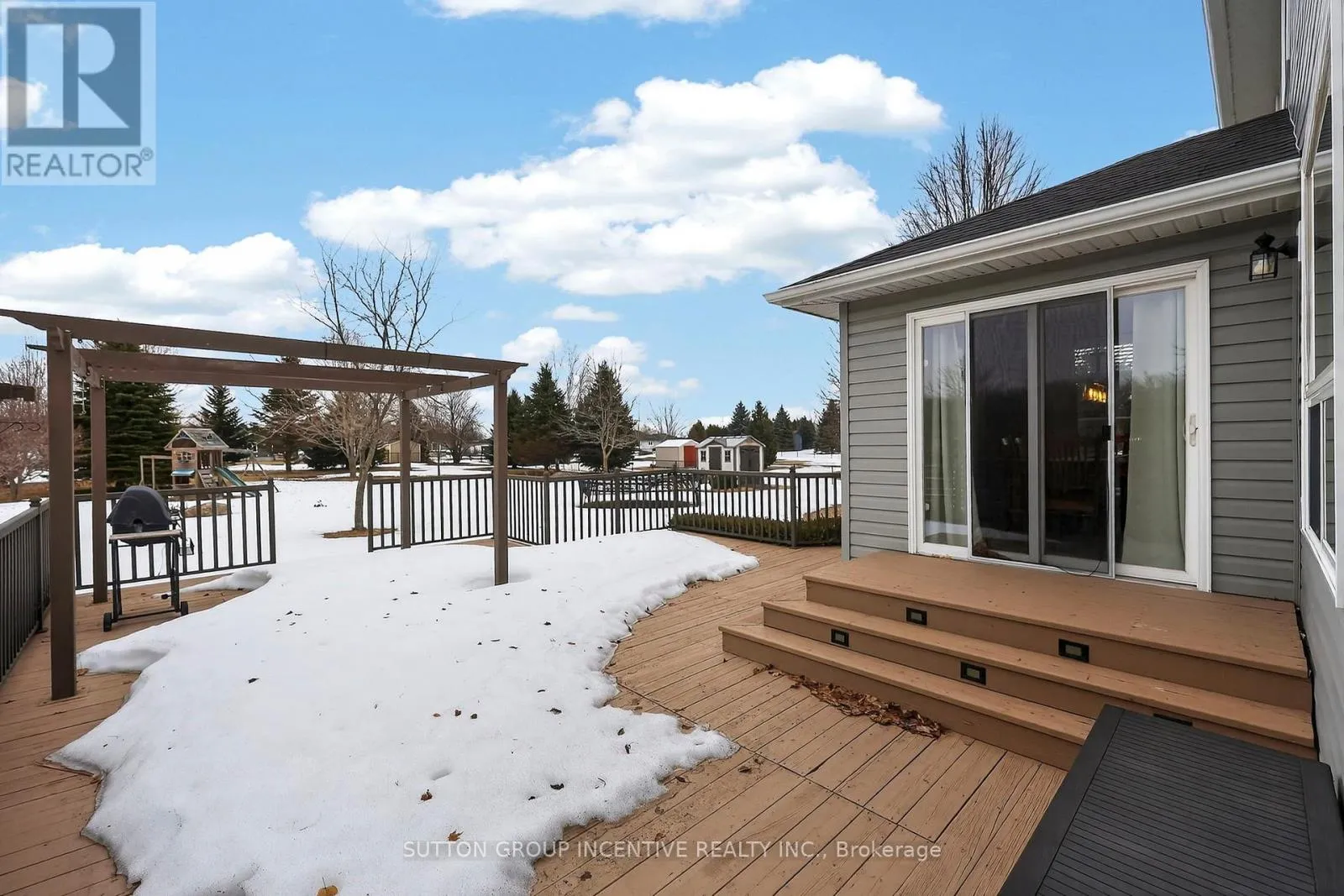 Cross Streets: O'NEILL/HALL. ** Directions: HWY 27 N TO W ON FLOS RD 4 TO LT ON LEO MARLEY WAY TO LT ON O'NEILL. This immaculate two-story home is ideally situated on a generous 108' x 268' landscaped lot in the highly desirable, family-friendly village of Phelpston. The Ashton model, originally sized at 1,975 sq ft, has been thoughtfully modified with an additional 2' extension at the back of the house. This enhancement provides more spacious rooms, resulting in a total living area of 2,020 sq ft. Meticulously maintained, the residence offers a spacious kitchen and breakfast room, complete with under-cabinet lighting, a tumbled marble backsplash, upgraded light fixture, potlights, four stainless steel appliances, and a convenient pocket door leading to the living and dining rooms. The primary bedroom includes a walk-in closet and a four-piece ensuite bathroom. The main floor features a family room with a gas fireplace and a laundry area with inside entry from the two-car garage. The expansive yard boasts a custom deck (with closed permit), a garden shed, landscaping with numerous trees, and a play structure-perfect for children. There is plenty of space to create your own backyard oasis. Phelpston offers a municipal recreation building featuring a covered skating rink and children's playground, a baseball diamond, a general store, Canada Post location, LCBO outlet, and a pizza place (coming soon!). The village is conveniently located just 20 minutes from Barrie and only 8 minutes from Elmvale. Residents of this charming country neighborhood can enjoy the convenience of Bell Fibre internet, ensuring reliable high-speed connectivity for work, streaming, and staying in touch with friends and family, all while embracing the tranquility of rural living. Just waiting for your family to make it their own! (id:27476)