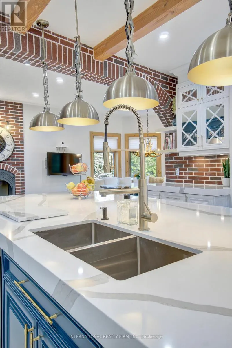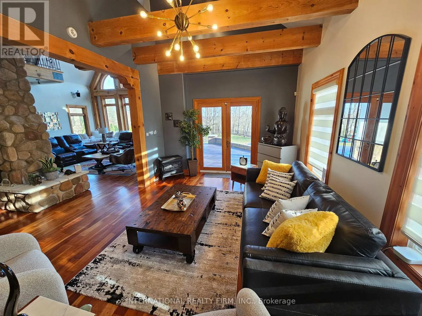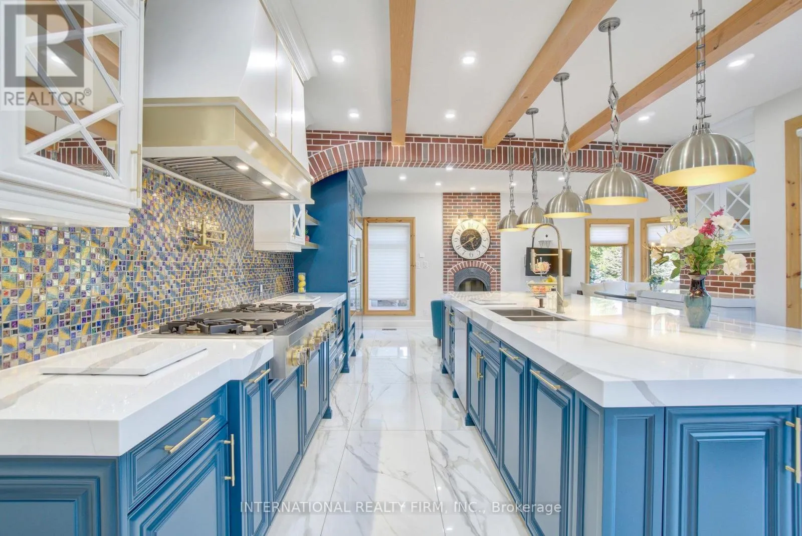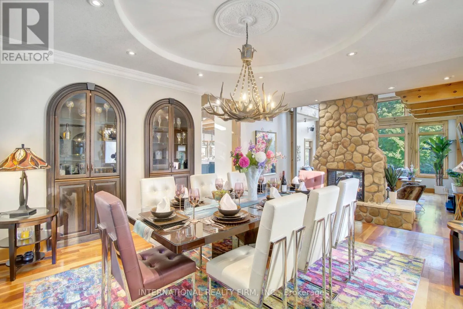 Cross Streets: Wilson Dr. & Pinehurst Lane. ** Directions: North on Bayfield St (Hwy 27) from Barrie. Turn left onto Hwy 26 W, then right onto Wilson Dr. Continue North on Wilson Dr. Turn left onto Pinehurst Lane. 6 Pinehurst Lane is located on your right in this private enclave. Experience the ultimate retreat in this stunning custom-built estate, perfectly positioned on a private 1.64-acre lot just minutes from Barrie. Designed for the move-up buyer seeking space and sophistication, this residence offers over 7,000 square ft of high-end living space that functions as both a grand entertaining venue and a private family sanctuary. Step into a breathtaking two-storey foyer, where polished porcelain floors meet a signature chandelier. The heart of the home is the massive Great Room, where 24-ft cathedral ceilings and a double-sided stone fireplace meet a wall of panoramic windows overlooking your private "Pool Paradise"-a spectacular backyard oasis featuring a saltwater pool, pool house, and lush professional landscaping. The chef's kitchen is a showstopper, anchored by a 14-ft quartz island and top-of-the-line stainless appliances. Detailed with brick arches, pine beams, and a dedicated butler's bar and baking station, it is a dream space for hosting. An elegant dining room awaits your next dinner party, paired with a "Zen-like" family room perfect for quiet evenings. The primary suite is a true luxury retreat, featuring its own fireplace, a private Juliette balcony, and a spa-style ensuite with heated floors and a deep-soaking Jacuzzi. The home's unique character continues to the second floor with an elevator lift, a built-in library, and a spectacular octagonal room featuring soaring cathedral ceilings. Designed for versatility, the property includes an ultra-convenient 2nd-floor laundry, a contemporary guest suite with its own kitchenette and ensuite, plus a massive lower level featuring a gym, dance studio, and billiards room. Outside, the 1.64-acre grounds are fully fenced for privacy, featuring a circular driveway with parking for 13 cars and a 3-car garage with 14-ft ceilings. Nestled on a quiet cul-de-sac only 10 minutes from Barrie and 25 minutes from Wasaga Beach, this is the definitive four-season estate for the discerning buy (id:27476)