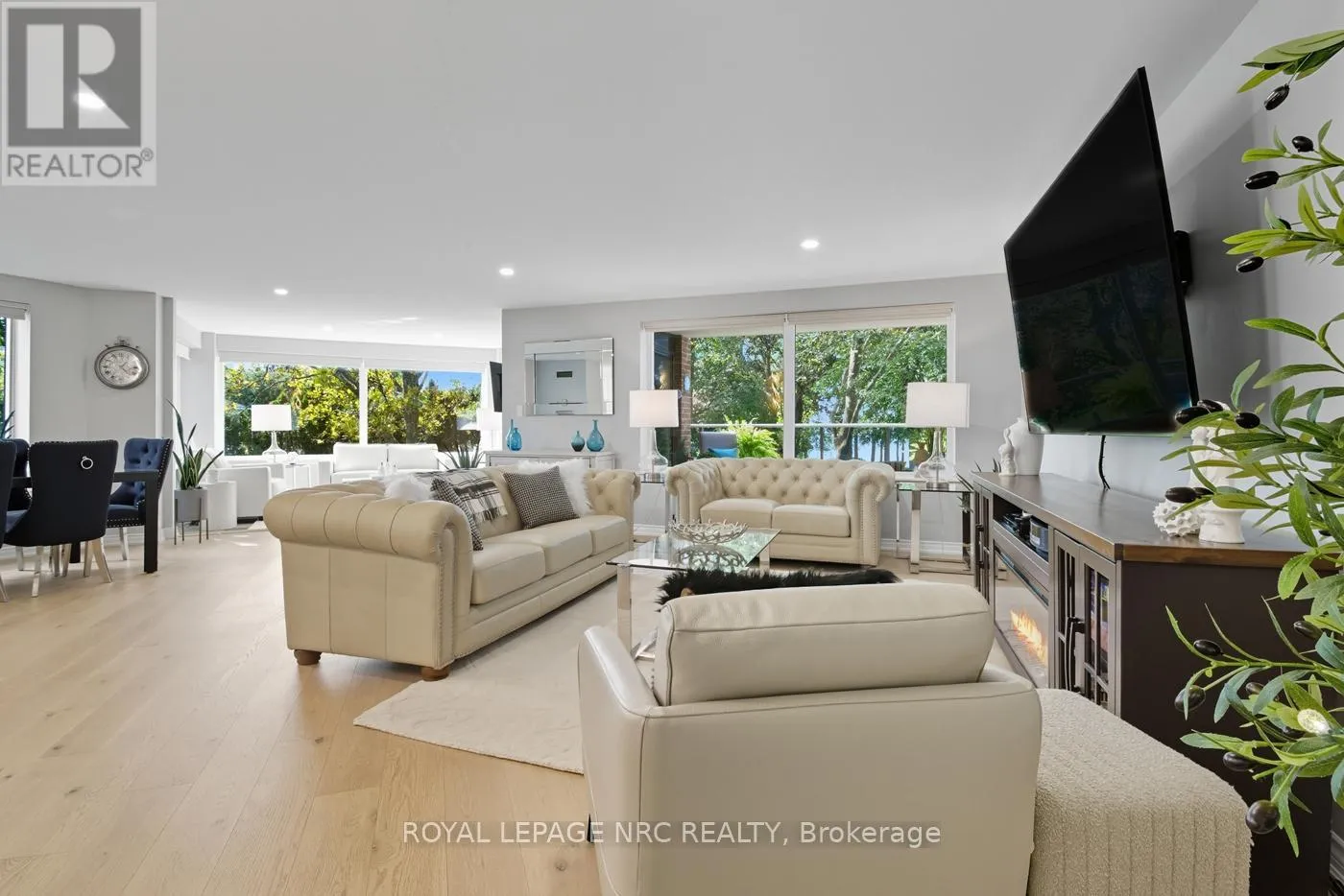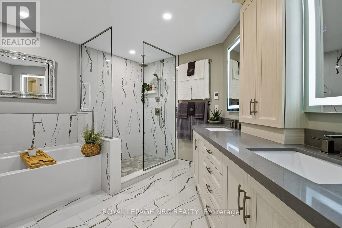 Cross Streets: Lakeshore Rd. ** Directions: North on Geneva St to the end. Buildings on left. Stunning Lakeside Living! Stunning views! Stunning Corner suite condo. and all found in this one of a kind complex in North St.Catharines known as Beachview Place. Beautiful water views from the moment you walk into the secure lobby, views that keep on going from every panoramic window plus the 800 sq ft terrace of this professionally renovated 2 bedroom , 2 bathroom apartment. Open concept design has a seamless flow encompassing the dining area , livingroom area and sunroom with heated floors. Some of the high end finishes include quartz countertops ,voice activated and dimmable lighting ,custom remote control window coverings and hardwood floors. Not only is the sparkling kitchen chef worthy, it was also designed to ensure the views continue. Optimized storage, coffee station, dual oven, cooktop range, easy drain double sink, dual pull out spice cupboards, pantry and breakfast bar. The primary bedroom includes custom built ins, a walk in closet and spa like 5 piece ensuite with heated floor and opens to the terrace that features a permanent dedicated shade area. Roomy second or guest bedroom/office has a 3 pc bath that features a custom underlay vanity top with waterfall faucet that is simply dazzling. Building amenities include an outdoor heated pool, sauna, meeting room, library , and fitness room where of course you can cycle overlooking the lake! Access to the Waterfront Trail for jogging or leisurely strolls on the grounds as well. Monthly fees include heat, hydro, Wifi, cable and water. This unit has exclusive use of one indoor parking space and one outdoor. All in all this is the perfect blend of beauty and a simplified lifestyle. (id:27476)