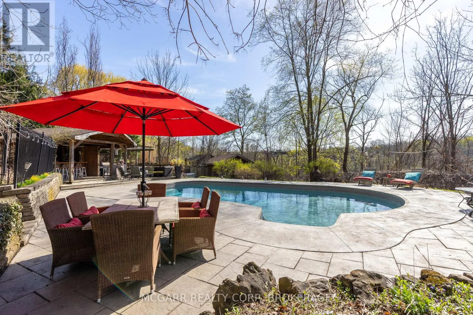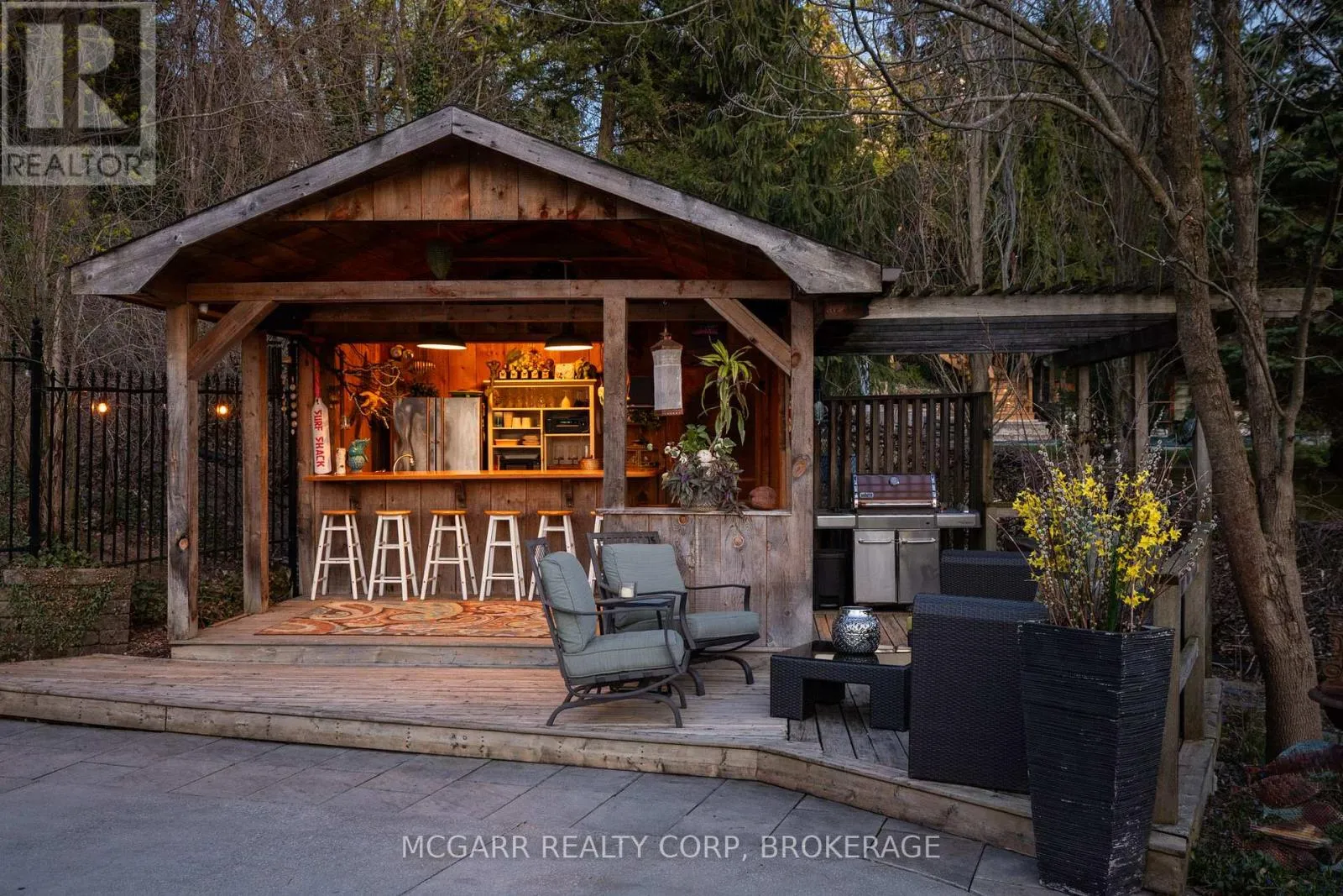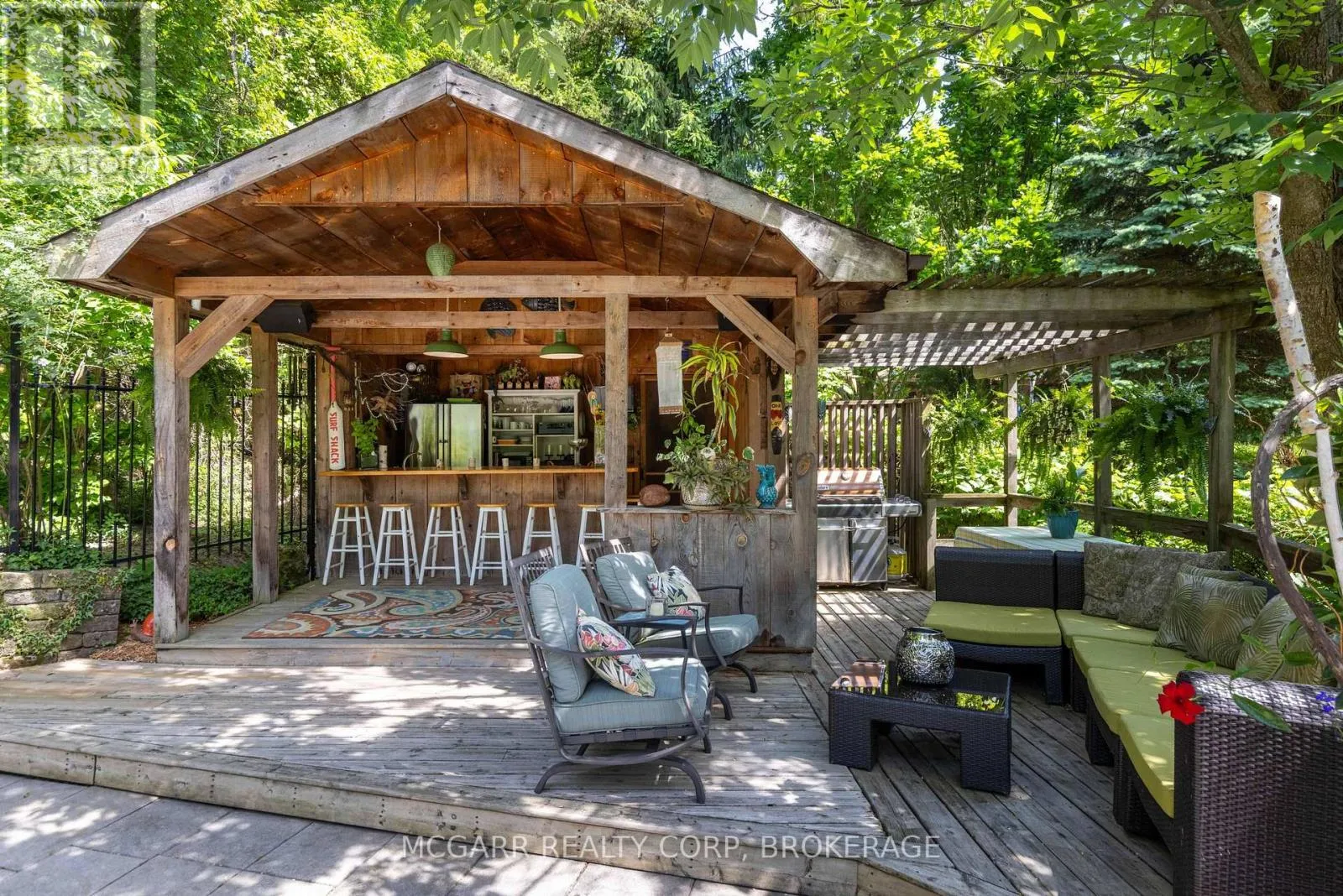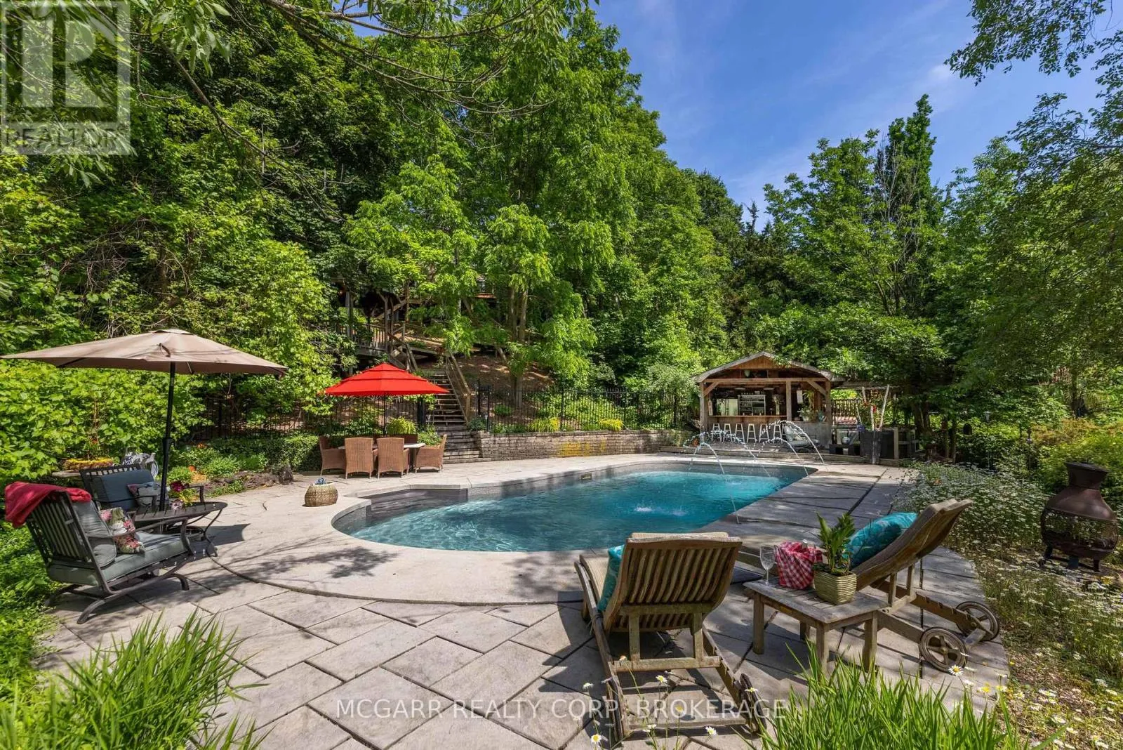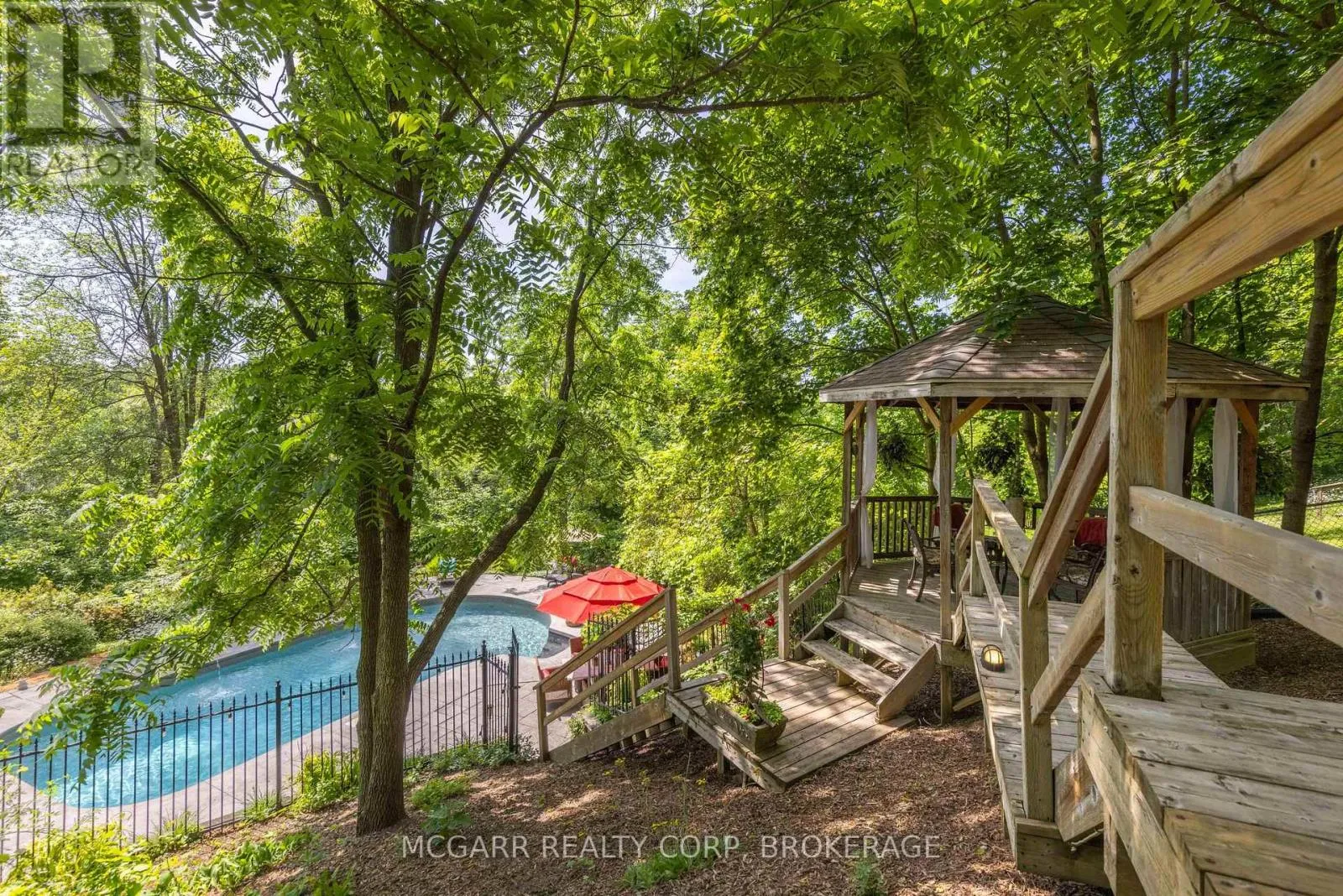 Rockcliffe/Glenridge This home has it all. Location, space, property, privacy and a true staycation feel. Entertaining bright living room with fireplace and leads to a light filled library. The formal dining room views the stunning backyard. Enjoy the warming fireplace in the family room or walk out to the two level deck with ground access. The updated kitchen with slate floor has a large island with sink plus there is a bar with a sink and wine fridge. The custom Birchview Cabinetry blends with the Bosch Dishwasher, Fisher Paykel fridge, and Wolf 4 burner gas stove. A mudroom, 2pc and a back stairway finishes the main level. The elegant front oak stairway leads to the upper level where you will find 5 bedrooms, 3 bathrooms and the laundry room. The primary suite has ravine views, gas fireplace, walk in closet and a sitting room. The 5 pc ensuite has 2 sinks, soaker tub and large glass shower. A 4pc and a 3pc services the other 4 bedrooms. The ground level has lots of storage space, 2 walkouts, rec room, and office with a fireplace. The very private terraced yard makes you feel like you are in Muskoka. Enjoy the soothing hot tub, decks, perennial gardens, in ground salt water and solar heated pool, fantastic fully equipped pool house bar with its own 2pc. A home to live in, play in and grow in. This home is perfect for a blended family who also want to have lots of space for privacy. Very spacious deck leading down to a 6 person hot tub and super private hidden alcove area for curling up. Party in the stunning pool level and gather around the fully equipped tiki bar. Come for a visit and stay for a lifetime. (id:27476)