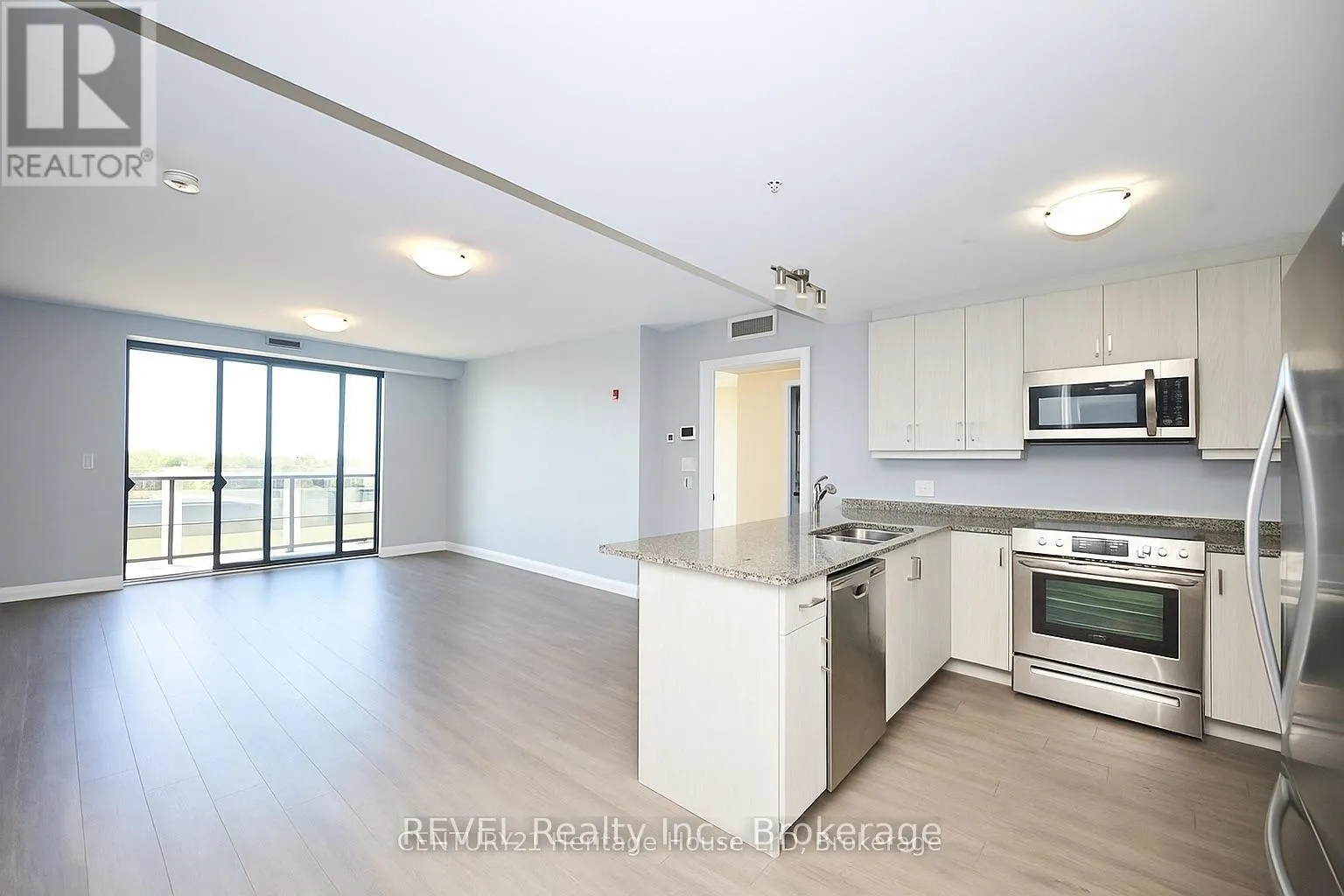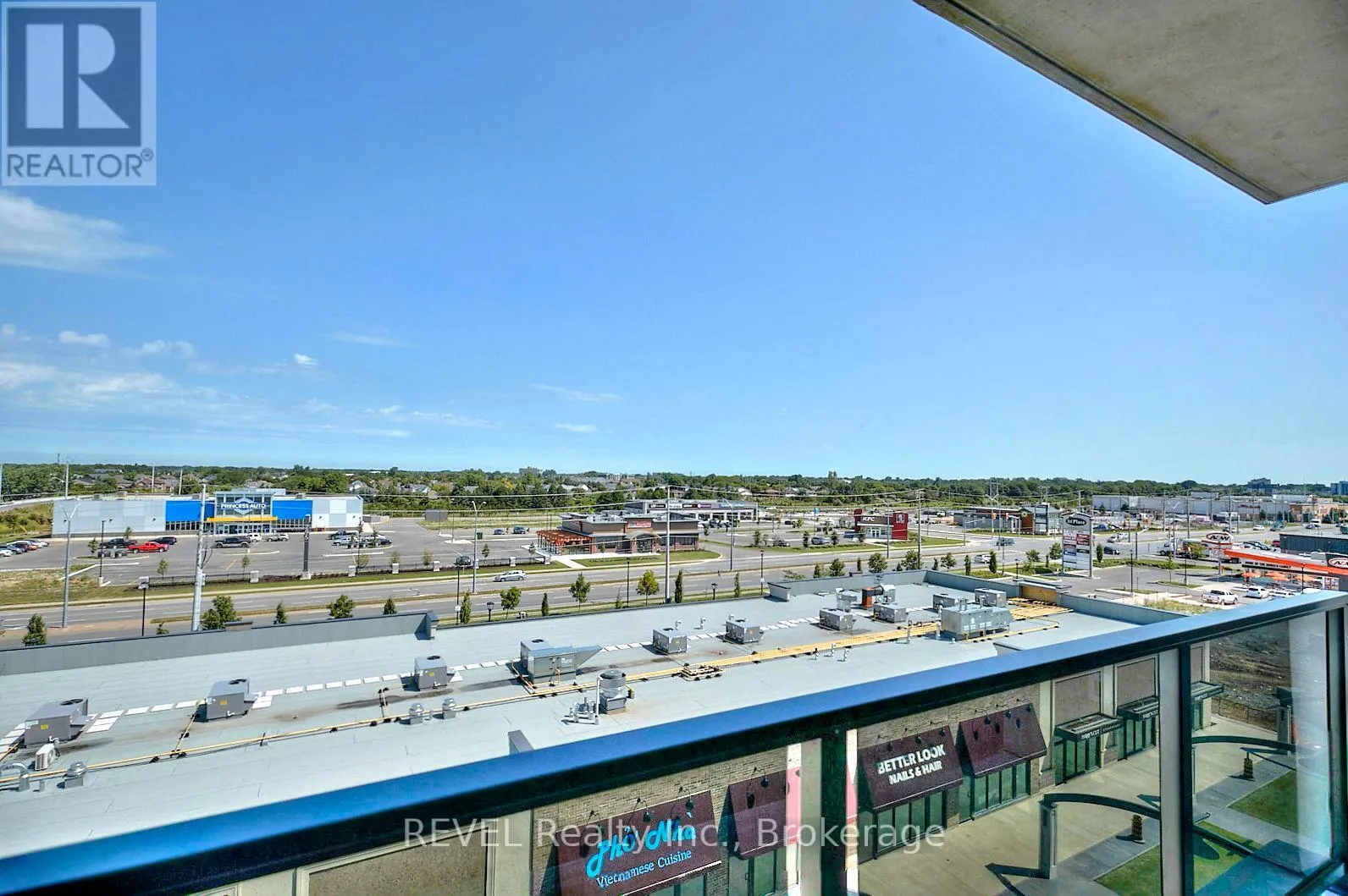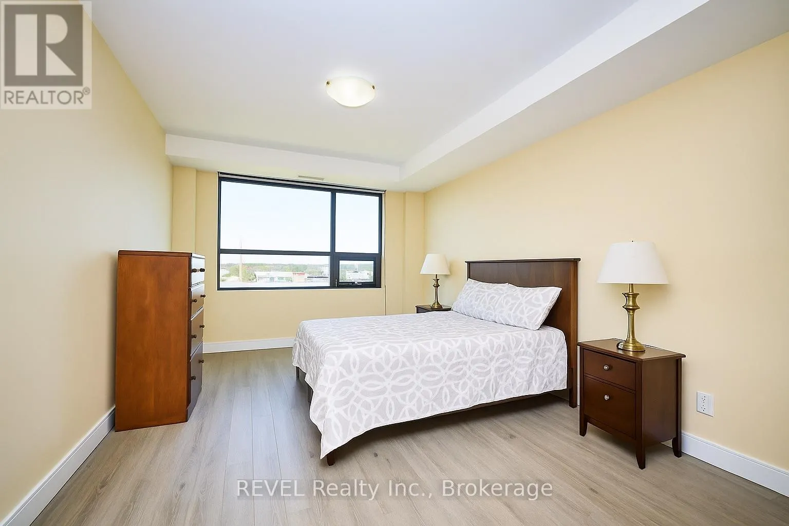 Cross Streets: Fourth Ave. & First St. Louth. ** Directions: Fourth Ave East to First St. Elevated living in this executive two-bedroom corner suite, in high desirable area of St.Catharines. Unit offers a desirable north-east exposure with abundant natural light throughout the day. Open-concept layout showcases a modern kitchen with high-end stainless steel appliances, granite countertops, and luxury plank flooring that extends through the principal living areas. Primary bedroom features a 3-piece ensuite with a walk-in glass shower, while the second bedroom provides flexibility for guests or a home office, complemented by a 4-piece main bath. Additional highlights include in-suite laundry, open balcony, ample storage, and sleek, contemporary finishes throughout. Residents of this sought-after building enjoy premium amenities such as a fitness room, secure entry, underground parking, and access to a shared rooftop patio and party room with the adjoining twin building. Steps from shopping, dining, and major highways, and directly across from the St.Catharines hospital, this corner condo combines convenience, comfort, and sophistication. (id:27476)
