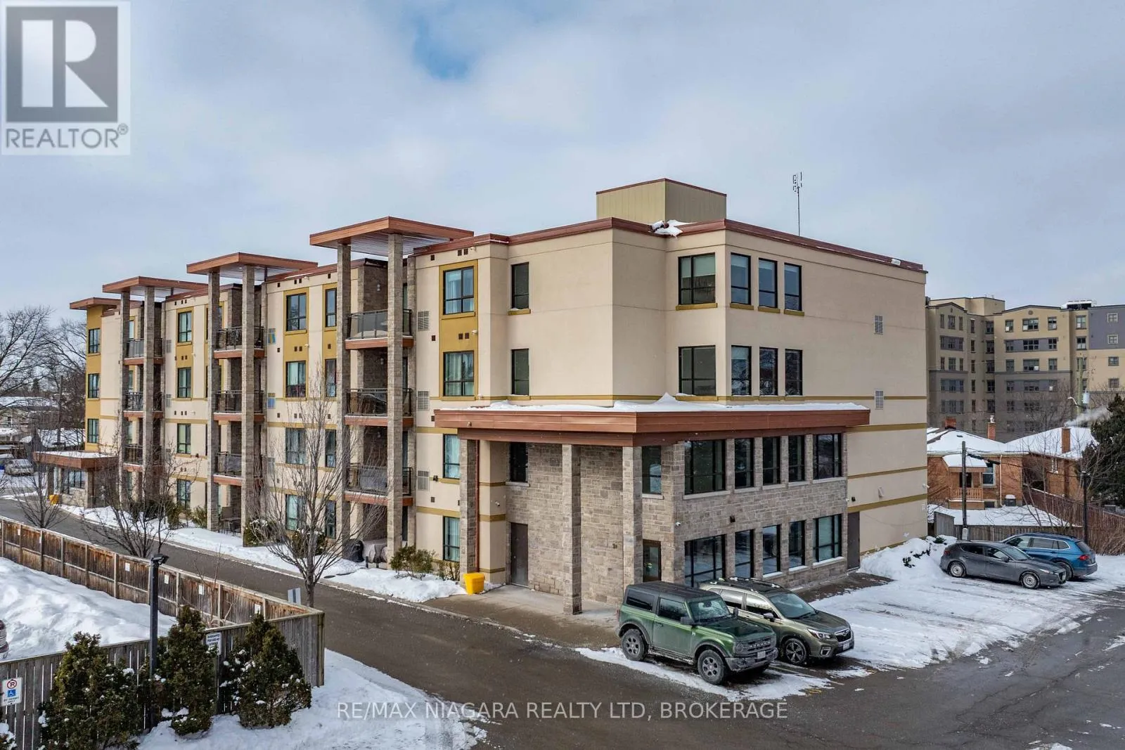 Lake St Penthouse-Style Living in the Heart of Downtown St. Catharines! Welcome to Wellington Residences, a stylish 28-unit boutique building designed for those who want to live at the centre of it all. Perched on the top (4th) floor, this bright and beautifully finished 2-bedroom, 2-bath condo delivers the perfect blend of comfort, design, and urban convenience. Step inside to an open-concept layout featuring engineered hardwood floors, soaring ceilings, and natural light throughout. The sleek, designer kitchen is a showstopper with quartz countertops, tile backsplash, and generous cabinetry-perfect for entertaining or everyday living. Enjoy your morning coffee or evening unwind on your private balcony above the city. The spacious primary suite offers a walk-in closet and a luxurious 5-piece ensuite with double vanity and linen storage. A second bedroom sits conveniently beside a modern 3-piece bath, ideal for guests, a home office, or both. In-suite laundry includes stacked washer/dryer, built-in cabinets, and bonus storage. Assigned parking and a locker are included. Residents enjoy premium amenities such as secure entry with intercom, a welcoming reception area, a second-floor lounge, third-floor gym, and a fourth-floor meeting room with lockers. The location? Unbeatable. Steps to shops, restaurants, Montebello Park, Market Square, Meridian Centre, the FirstOntario Performing Arts Centre, and transit. Minutes to Niagara Falls, Niagara-on-the-Lake, the U.S. border, with quick access to Hwy 406 and the QEW-and just one hour to Toronto. This is your opportunity to own in one of St. Catharines' most sought-after downtown residences and embrace a vibrant, connected lifestyle. Don't miss it. (id:27476)