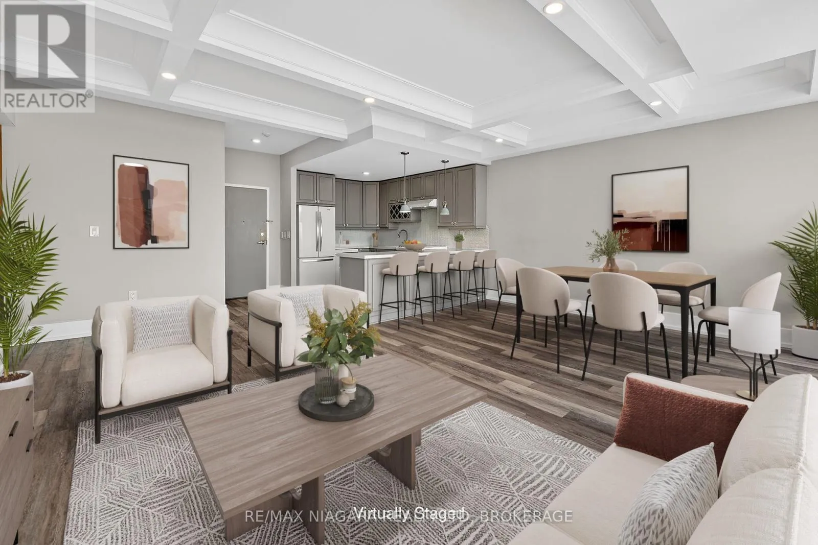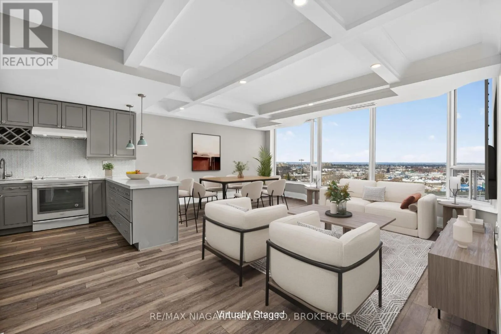 Cross Streets: Lake St. ** Directions: Off Scott St. Beautifully updated, modern luxury penthouse 1-bedroom + den condo with bright west exposure, offering stunning sunsets and panoramic city and lake views. Completely move-in ready-just bring your furniture and hang your clothes. Features include 9-foot coffered ceilings with pot lights in the living and dining areas, plank flooring throughout, and a spacious kitchen with quartz countertops and ample cupboard and drawer space. The updated bathroom offers a walk-in shower. The bedroom is generously sized, and the den provides extra living space with a bow-window sitting area. Includes in-suite laundry, central air, and remote-controlled roller blinds (except in the den).One underground parking space, a large in-suite storage room, and an additional storage locker are included. Extra parking is available. The building sits on approximately 3.3 acres of beautifully landscaped grounds and offers exceptional amenities: heated saltwater pool, BBQ areas, waterfall seating areas, car wash bay, guest suite, party room, billiards and exercise rooms, bicycle storage, ample visitor parking, and high-speed internet included in the condo fees. Walking distance to shops, transit, restaurants, and Fairview Mall, with easy access to the QEW. Ideal for retirees or busy professionals. Includes fridge, stove, dishwasher, washer, and dryer. Buy now at a great price and rent it out until you're ready to move in-an ideal opportunity for future planning. Please note: dogs and smoking are not permitted. (id:27476)
