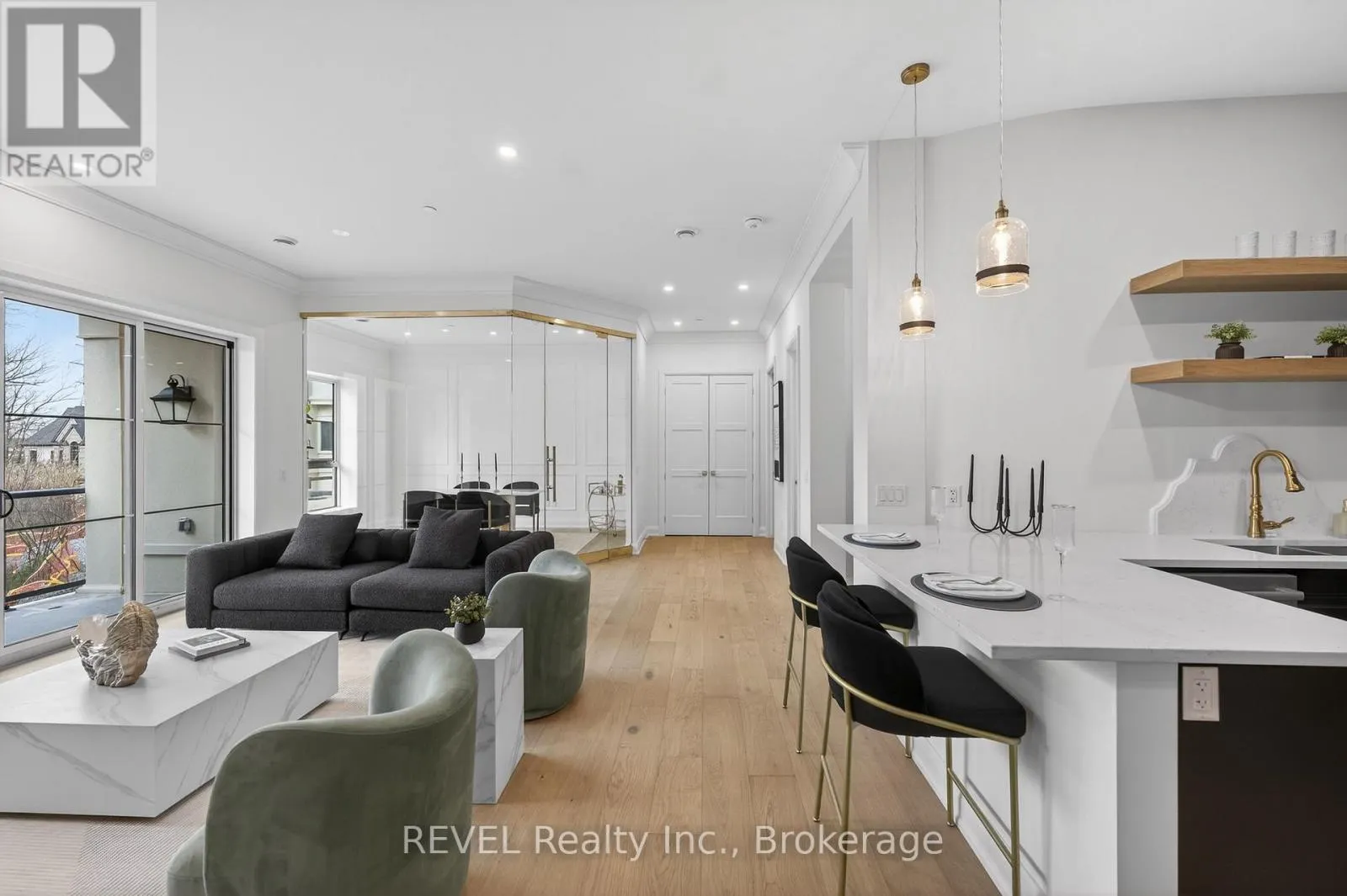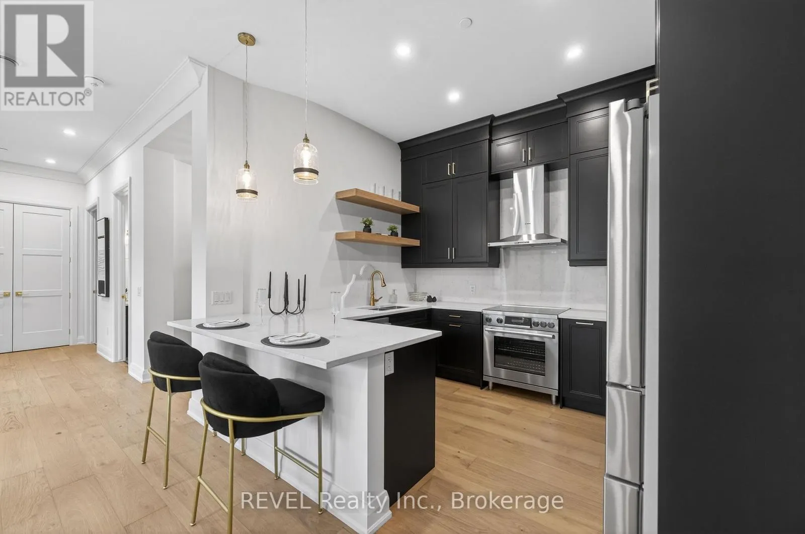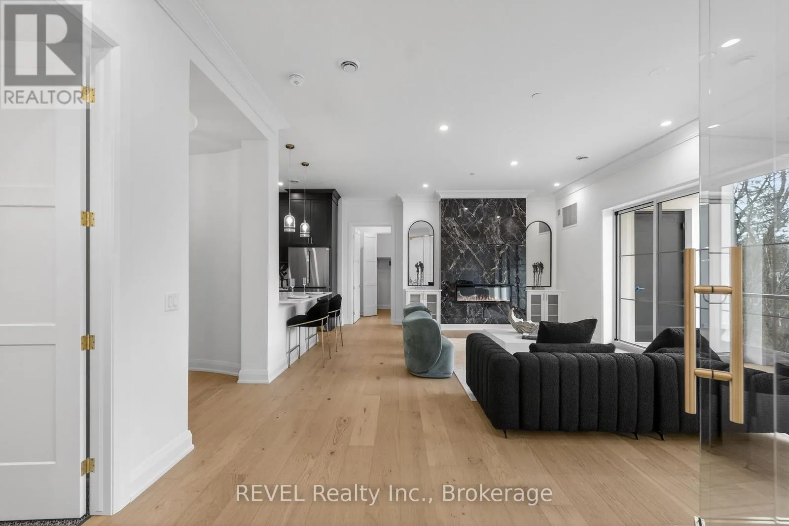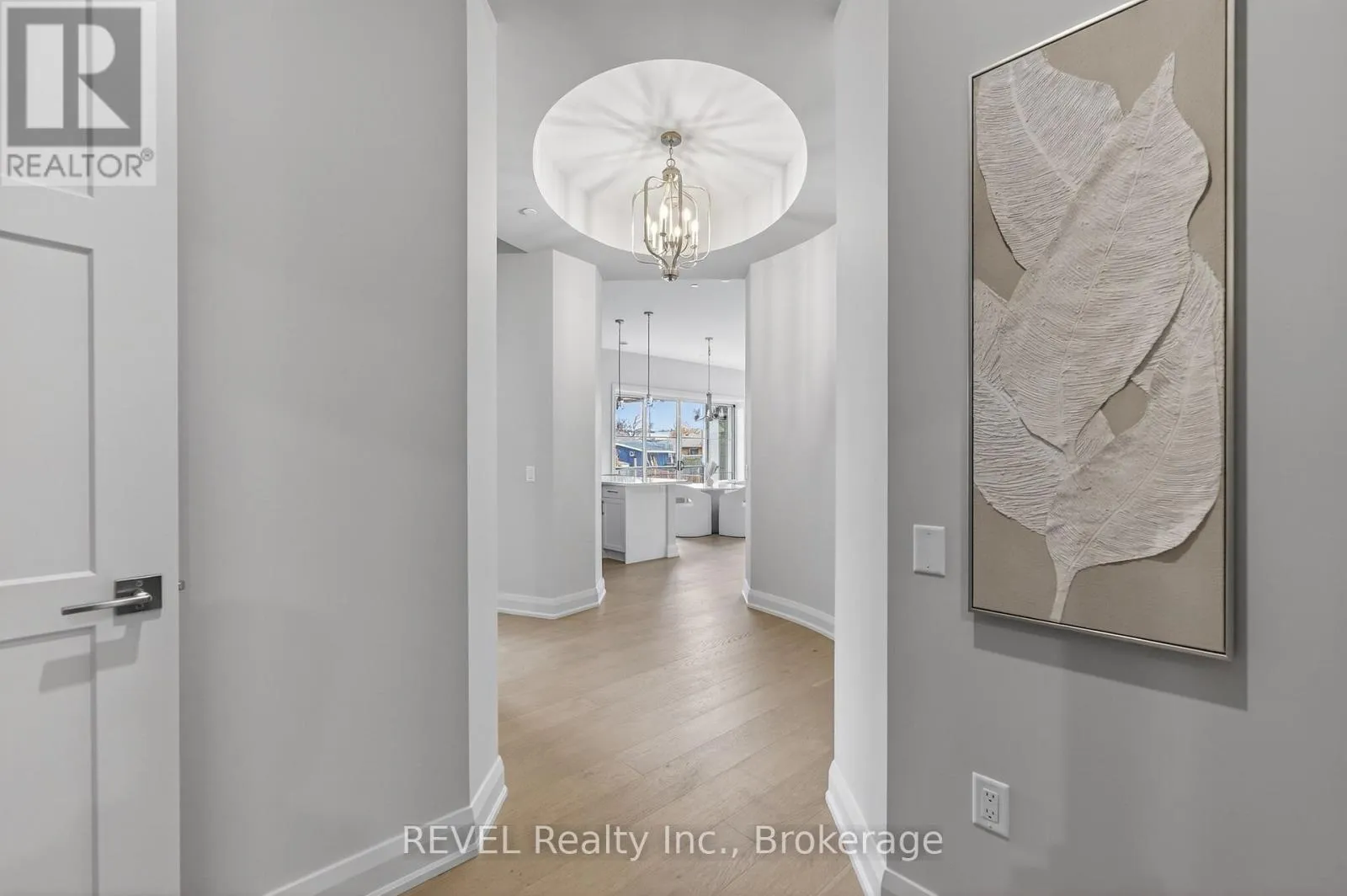 Glen Morris to Jacobson to Arbourvale Welcome to The Gaultier A2 at Coveteur, Niagara's newest address for luxury living. This stunning fourth-floor suite offers 1,457 sq. ft. of beautifully finished living space with 2 spacious bedrooms and captivating West-facing views of the surrounding natural scenery. Designed for modern elegance, this open-concept suite features 10-ft ceilings, 8-ft doors, and an architecturally distinctive circular foyer. Personalize your home with one of four curated designer decor stylesParisian, Scandinavian Chic, New York Loft, or European Traveller each crafted for timeless sophistication. The kitchen boasts designer cabinetry with crown moulding, quartz countertops, a tile backsplash, and an eat-in island perfect for entertaining. Enjoy year-round comfort with an Echobee smart thermostat and an individual high-efficiency MagicPak system with fresh air ventilation. Elegant three-pane sliding doors open to a private balcony offering serene views. Building amenities include a landscaped outdoor terrace, party room with kitchen, library and lounge with two-sided fireplace, and a fitness and yoga studio. One underground parking space and locker included. Built strong with Insulated Concrete Forms (ICF) for superior quality and energy efficiency. Construction is underway with occupancy expected Fall 2026. Visit www.coveteur.ca for floorplans and more details. (id:27476)