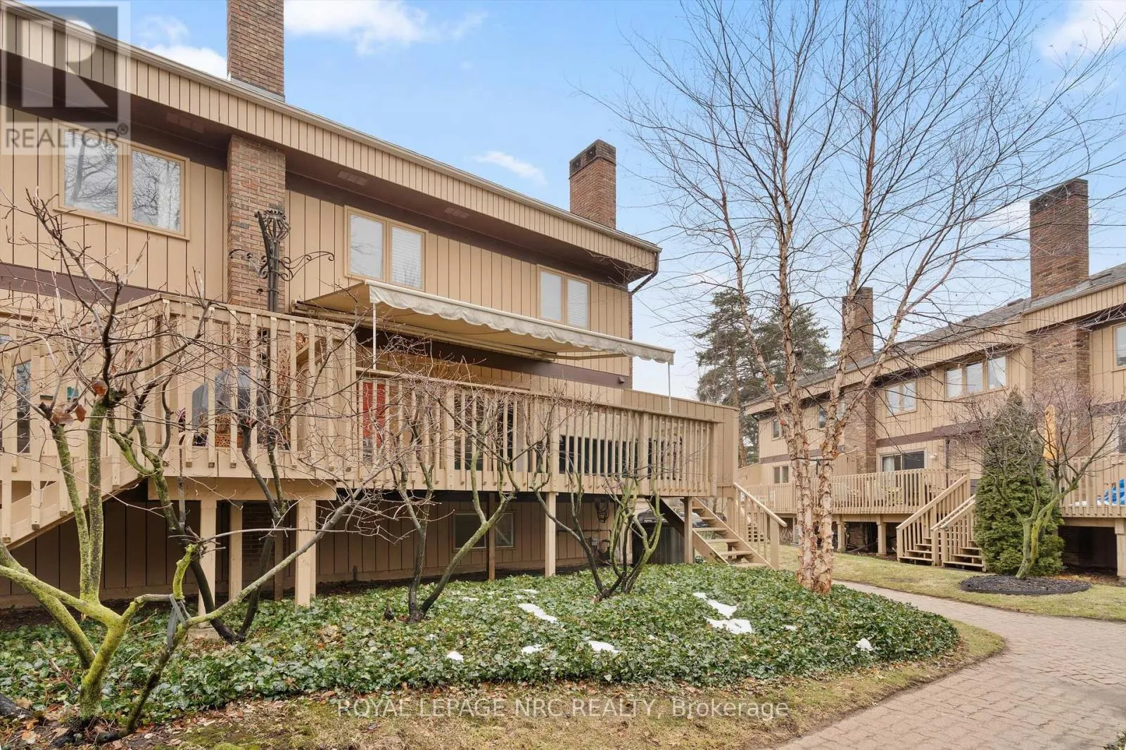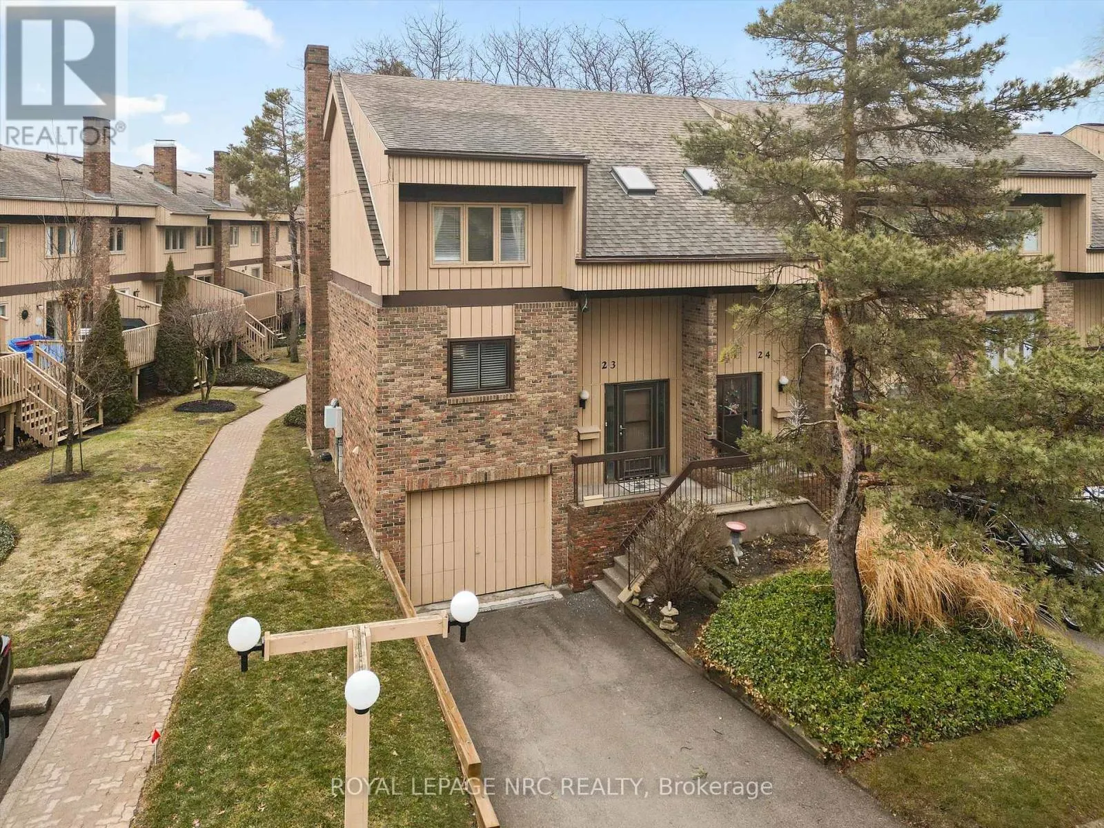 Cross Streets: SCOTT STREET. ** Directions: QEW south onto Lake St, east onto Scott St. Savour premium resort style living at "The Clusters", great for entertaining or just kicking back on your oversized rear deck with a huge power awning. The 22' x 10' deck features views of the park-like common area but remains secluded from the large inground pool. This 1410 square foot end unit features a fully renovated kitchen with 30" deep pantry cupboards, breakfast bar & stainless steel appliances, an open concept main floor with lots of natural light, gas fireplace (most units in the complex have the fireplace on the basement level) & 2 piece bathroom. The upper floor includes the large primary bedroom with vaulted ceiling & mirrored wall to wall closets, 2nd bedroom & spacious 5 piece bathroom with air tub & separate shower. The lower level includes a walk-thru den with laundry closet plus the recroom with direct access to the oversized garage. Conveniently located near local eateries, retail shopping & QEW commuter access. Port Dalhousie is less than ten minutes away offering sunset views, waterfront trails, sandy beach, dining, marina, yacht club & the recently renovated piers. (id:27476)