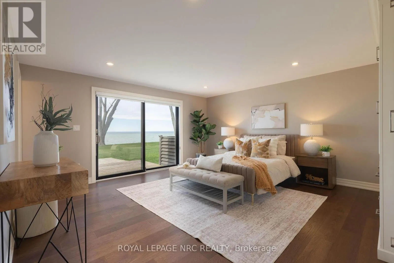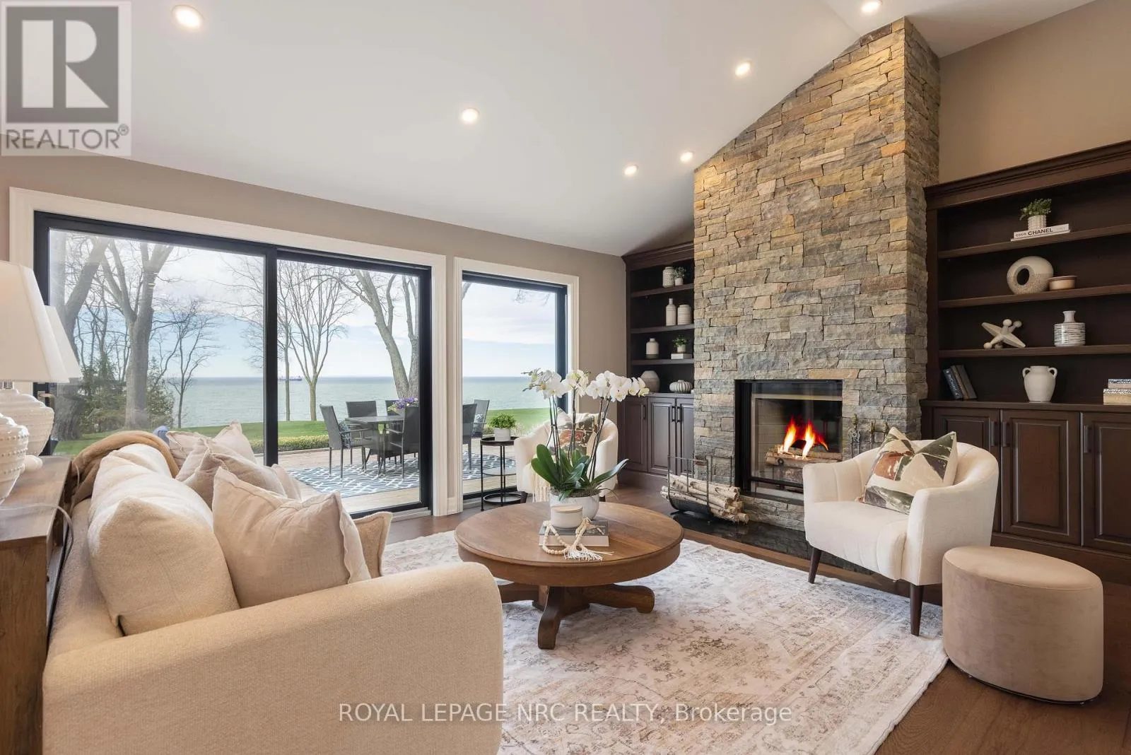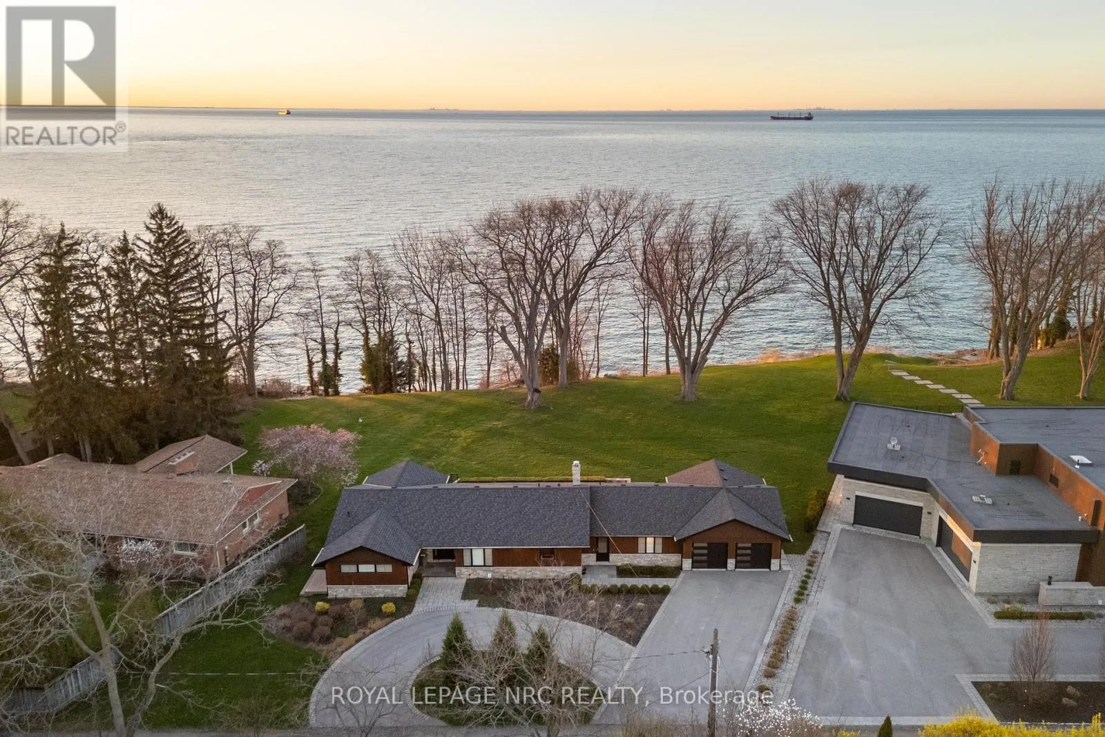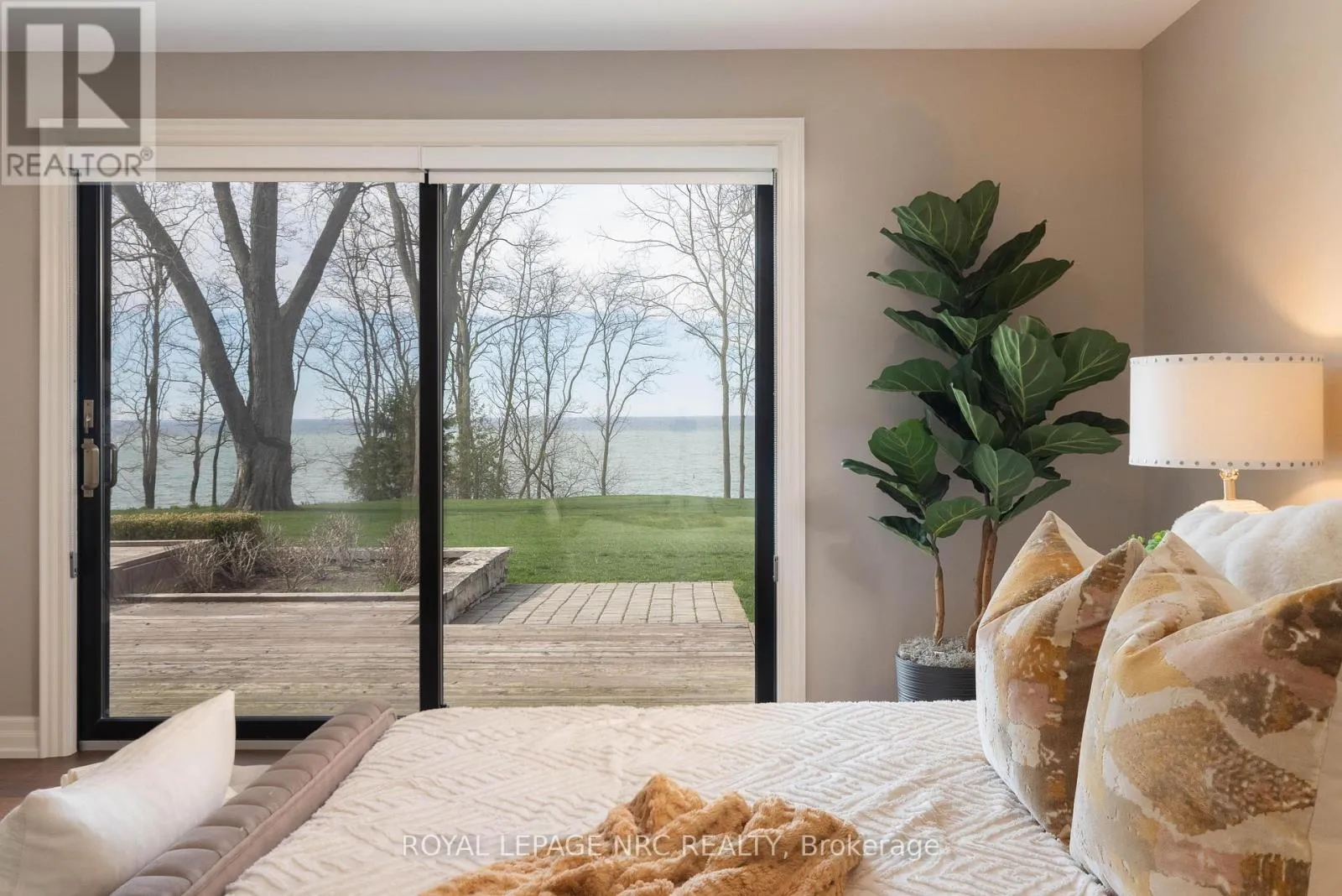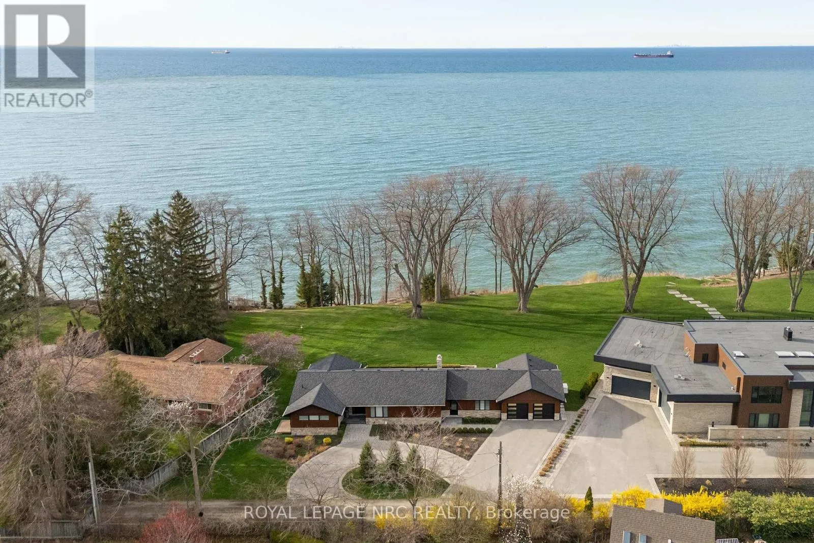Cross Streets: Peach Tree Common. ** Directions: Lakeshore Road, north on Simpson Road. WELCOME TO YOUR BEAUTIFUL CUSTOM LAKEFRONT DREAM HOME IN NIAGARA! Stunning waterfront residence on a rare 1 acre private lot with 140 ft. shoreline frontage, on exclusive Simpson Road, offering breathtaking views from every room of Lake Ontario and the Toronto skyline. Enjoy dramatic sunsets, direct water access in this 2300 sq. ft. custom bungalow, fully renovated from top to bottom. Floor to ceiling windows in the Great room frame the view, anchored by 14 foot vaulted ceiling, a dramatic full-height stone fireplace, rich hardwood throughout. Gourmet kitchen with s/s appliances, perfect for entertaining. 3 spacious bedrooms on the main floor, each with wall to wall custom built in cupboards, and walkouts to patio including Primary bedroom with ensuite. Main floor laundry, interior access to double garage with rear overhead door. Generac generator. Lower level with 2 bedrooms (one currently in use as a home office), full bathroom, cantina and a huge unfinished room, perfect to create a fabulous Recreation room. Professionally landscaped with irrigation system, circular drive. Enjoy your own piece of waterfront paradise! See video for full views and tour. (id:27476)