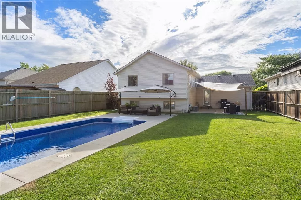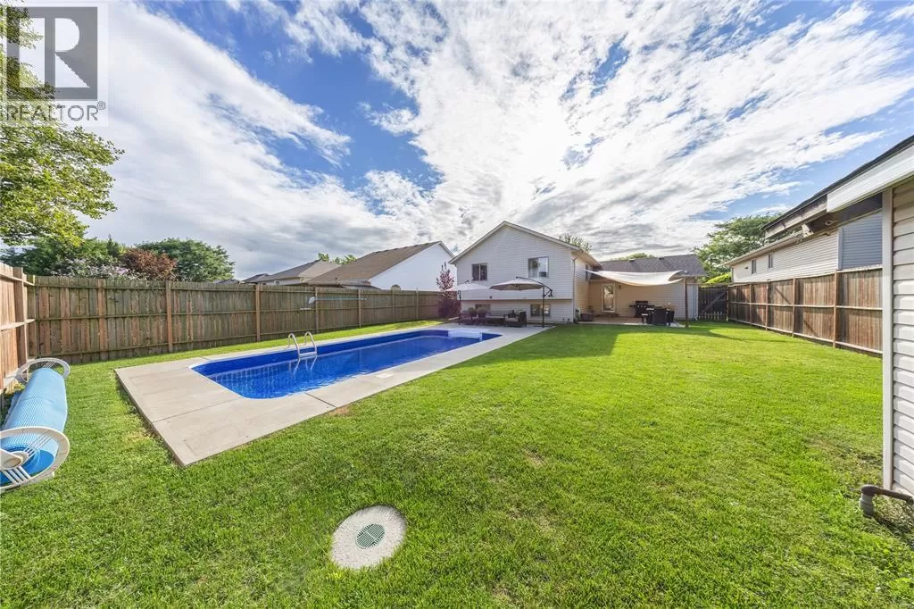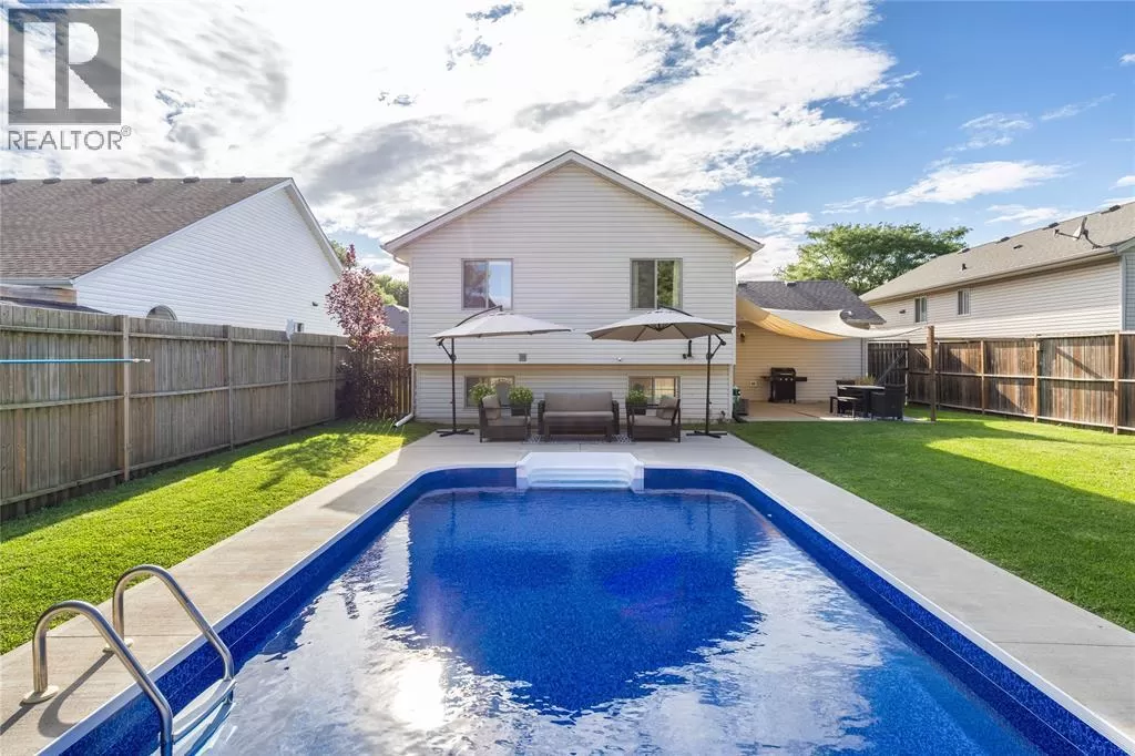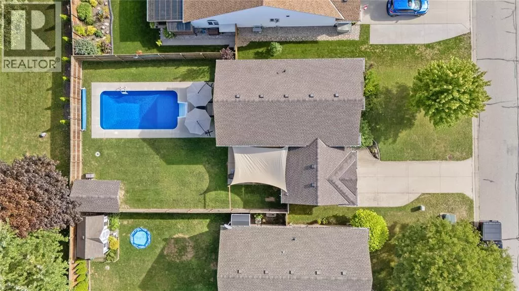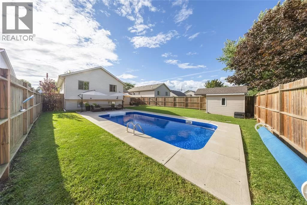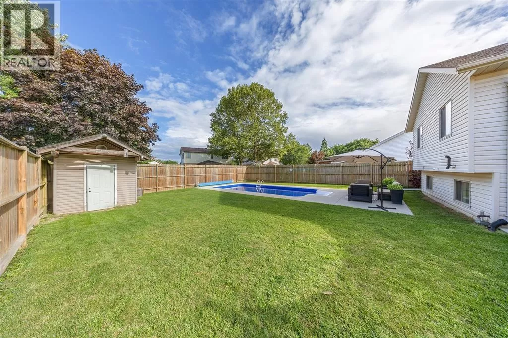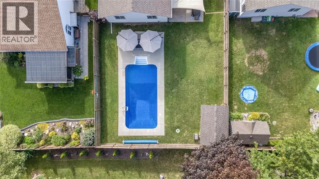Welcome to this beautiful and well-maintained 3+1 bedroom, 2 bathroom home! Greet friends and family in the inviting front foyer, then head upstairs to the gleaming hardwood floors that carry through the living room, dinette, hallway, and main floor bedrooms. The open-concept design showcases cathedral ceilings, a spacious kitchen island, and abundant cabinetry, all highlighted by modern decor. The lower level offers a generous recreation room with a cozy comer gas fireplace, a 3-piece bathroom, laundry room, utility room, and a large unfinished area-ideal for extra bedrooms, a teen retreat, or plenty of storage. Step outside to a fully fenced backyard featuring an inground pool, the pool is 25â x 15' , with a gas Heater, sand Filter, new liner in 2024, a vinyl-sided garden shed with new shingles, and a shaded patio-perfect for relaxing or entertainment .Additional highlights include a single attached garage with automatic door opener and direct access into the home, Central Vac and all Appliances. This home shows beautifully and is ready for quick possession! (id:27476)
