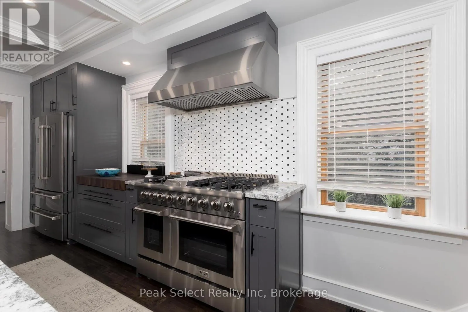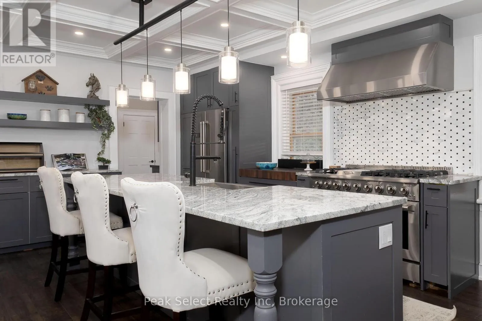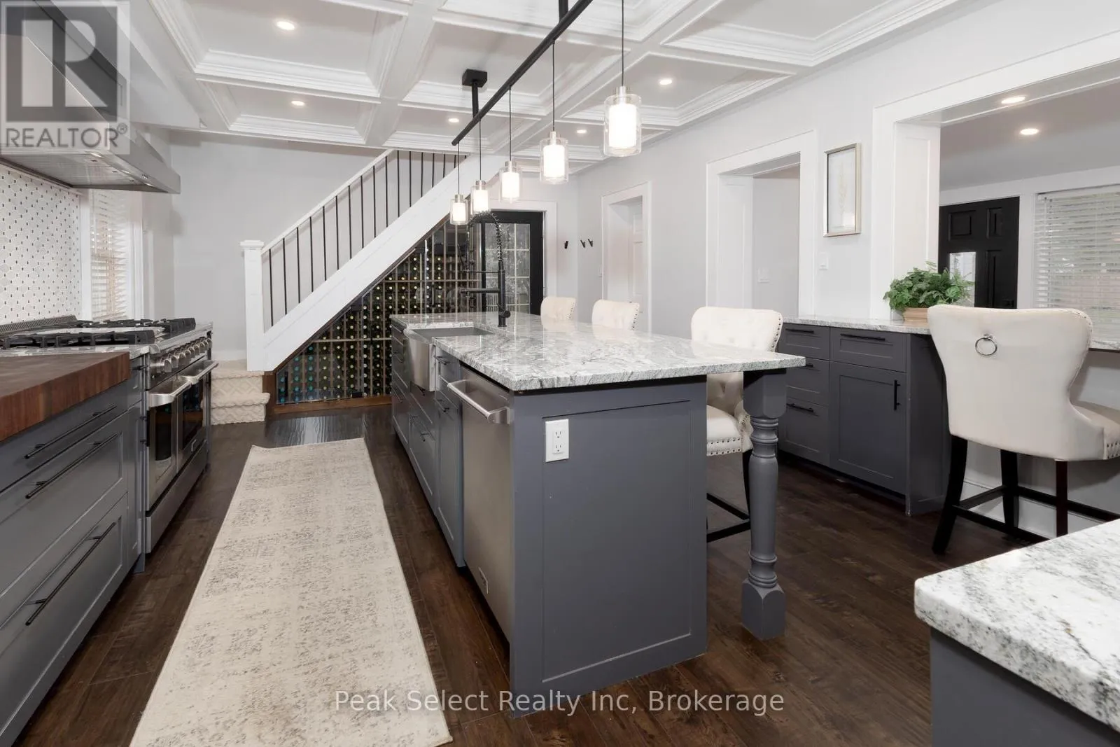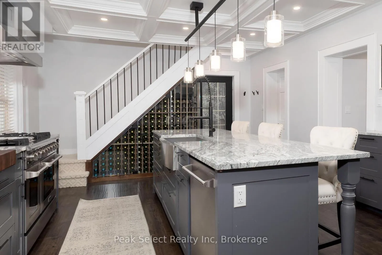 Cross Streets: Queen St E. and St. Andrew St. ** Directions: House is located on the southeast corner of Queen St E. and St. Andrew St. Driveway is off of St. Andrew. Welcome to 382 Queen St. E., in the picturesque town of St. Marys, ON. This 1890 solid-brick beauty has been extensively modernized and is ready for a new family to call her own. Renovated in 2023 for those who love to entertain or host family gatherings, key features include a large dining room directly off of the kitchen, a separate bar area ideal for preparing cocktails or for use as a coffee bar, and a separate living room with bay window. The kitchen stands as the hallmark trait of the home, with modern cabinetry, a large centre island with breakfast bar, a 48" gas range, an apron farmhouse sink, and a built-in, beautifully-crafted walnut cutting board counter. The focal point, however, is the magnificent wine refrigeration cabinet built in under a staircase, which could be repurposed to house fruits, cheeses, or other beverages if wine isn't your thing. The magnificent coffered ceiling that flows from kitchen, dining to living room levels up the elegance. Travel up the curved staircase to an upstairs that hosts 3 bedrooms, including a large Primary suite with natural gas fireplace, a 4-piece bath with glassed-in shower, a claw-foot tub and spacious vanity. A back "servant's staircase" leads from this bedroom to the kitchen for those urgent early-morning coffee runs. Outside you will find a large raised wood deck and private, fenced-in backyard. Take a short walk to the downtown core to enjoy the fabulous shops, cafes and restaurants. (id:27476)