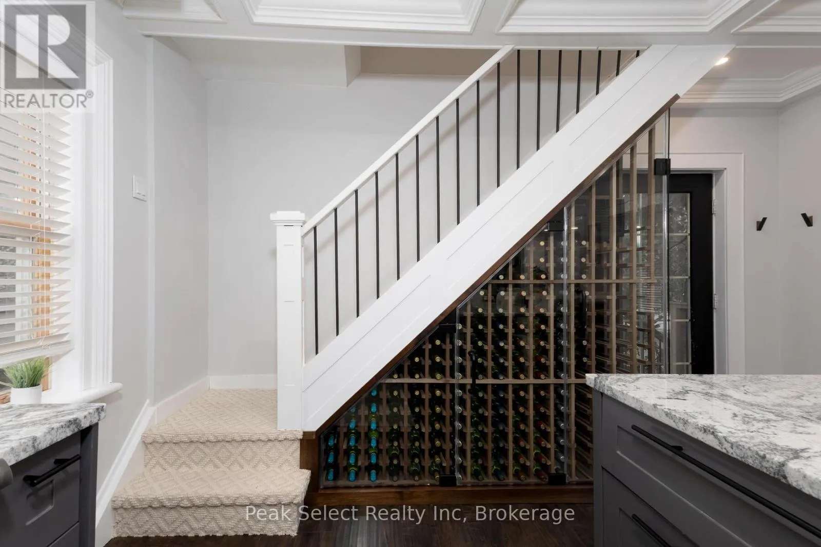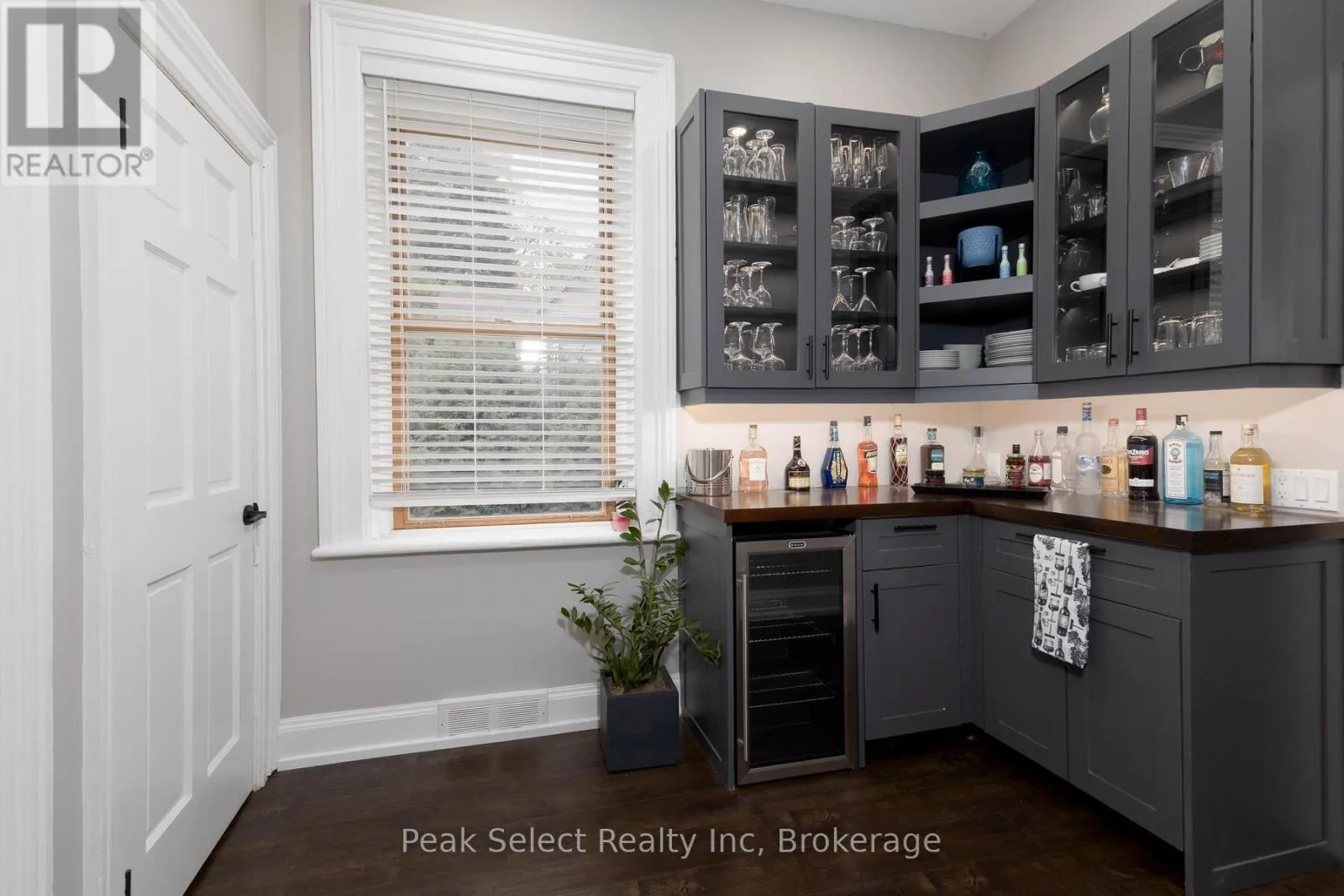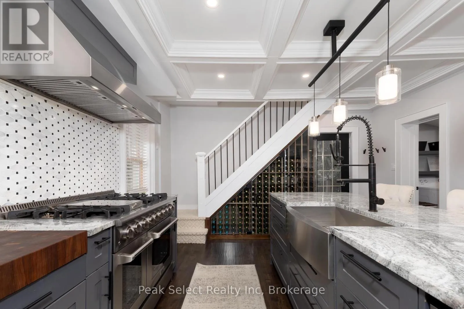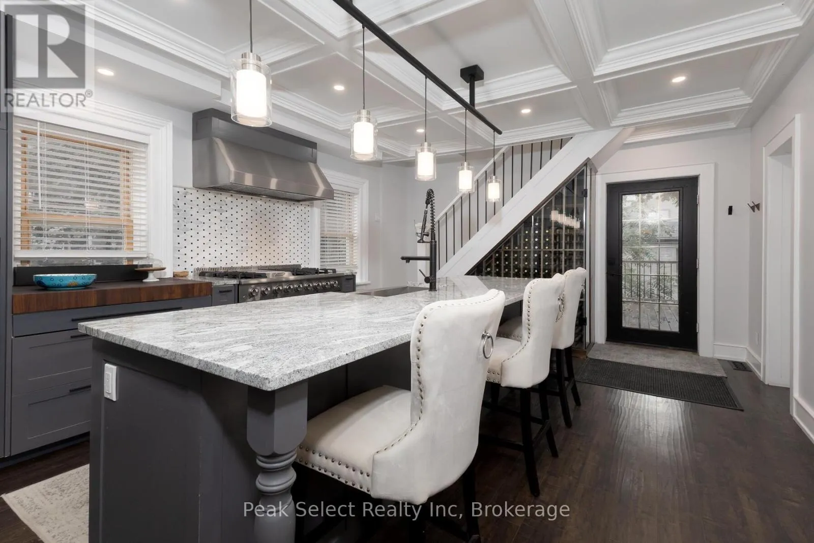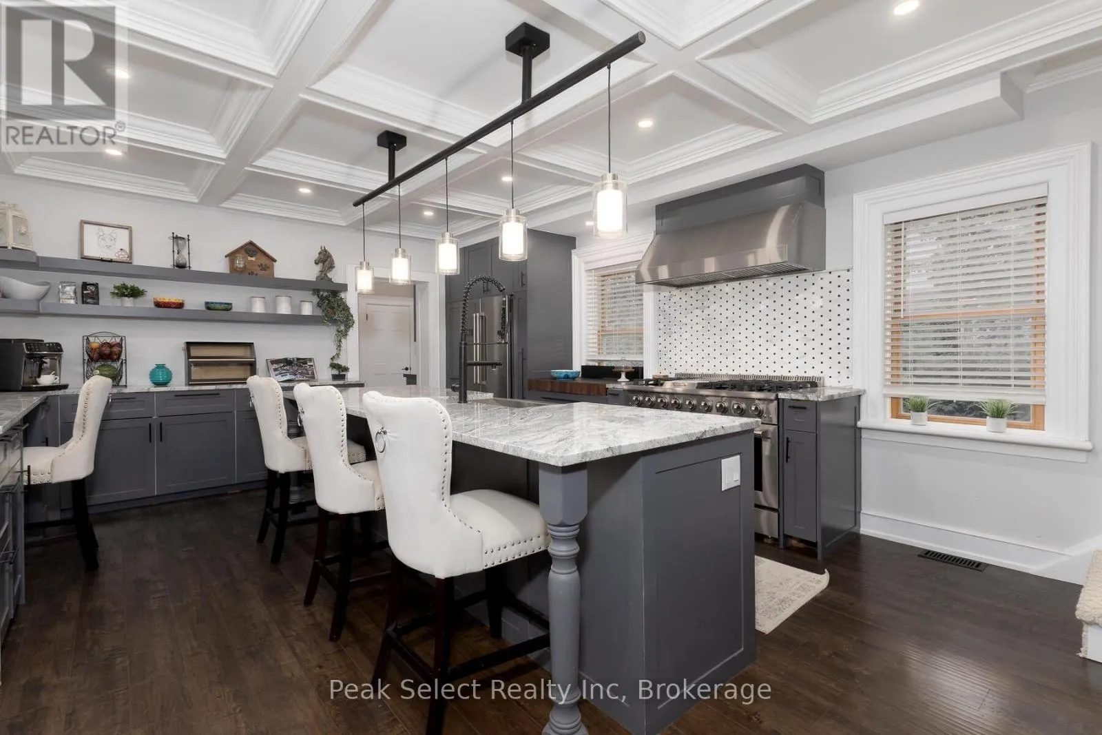 Cross Streets: Queen St E. and St. Andrew St. ** Directions: House is located on the southeast corner of Queen St E. and St. Andrew St. Driveway is off of St. Andrew. Welcome to 382 Queen St. E., in the picturesque town of St. Marys, ON. This 1890 solid-brick beauty has been extensively modernized and is ready for a new family to call her own. Renovated in 2023 for those who love to entertain or host family gatherings, key features include a large dining room directly off of the kitchen, a separate bar area ideal for preparing cocktails or for use as a coffee bar, and a separate living room with bay window. The kitchen stands as the hallmark trait of the home, with modern cabinetry, a large centre island with breakfast bar, a 48" gas range, an apron farmhouse sink, and a built-in, beautifully-crafted walnut cutting board counter. The focal point, however, is the magnificent wine refrigeration cabinet built in under a staircase, which could be repurposed to house fruits, cheeses, or other beverages if wine isn't your thing. The magnificent coffered ceiling that flows from kitchen, dining to living room levels up the elegance. Travel up the curved staircase to an upstairs that hosts 3 bedrooms, including a large Primary suite with natural gas fireplace, a 4-piece bath with glassed-in shower, a claw-foot tub and spacious vanity. A back "servant's staircase" leads from this bedroom to the kitchen for those urgent early-morning coffee runs. Outside you will find a large raised wood deck and private, fenced-in backyard. Take a short walk to the downtown core to enjoy the fabulous shops, cafes and restaurants. (id:27476)