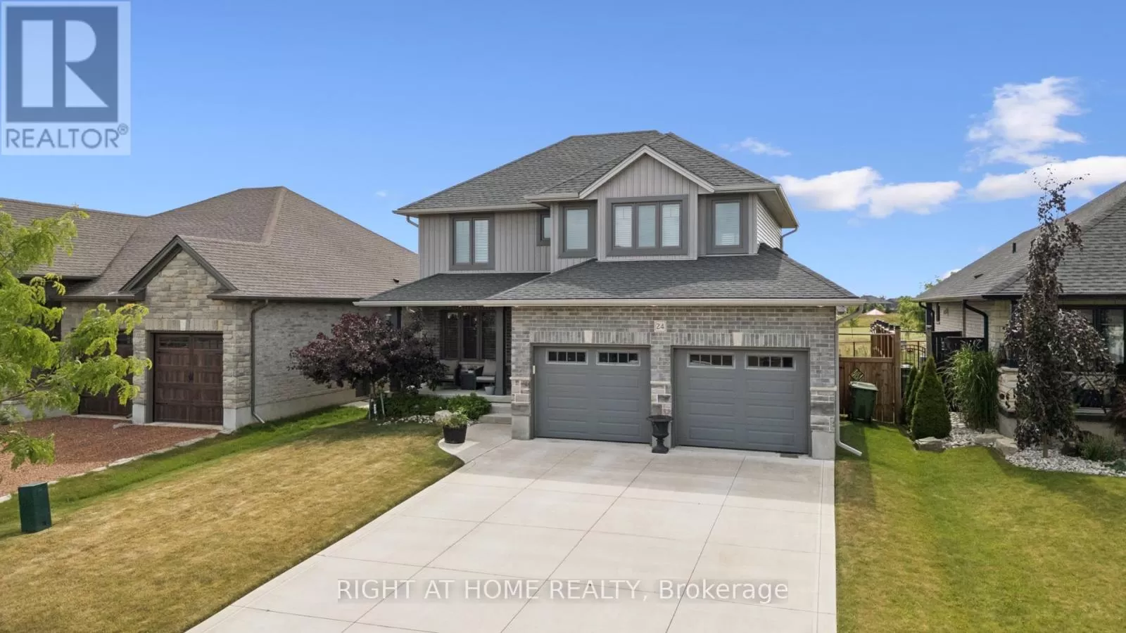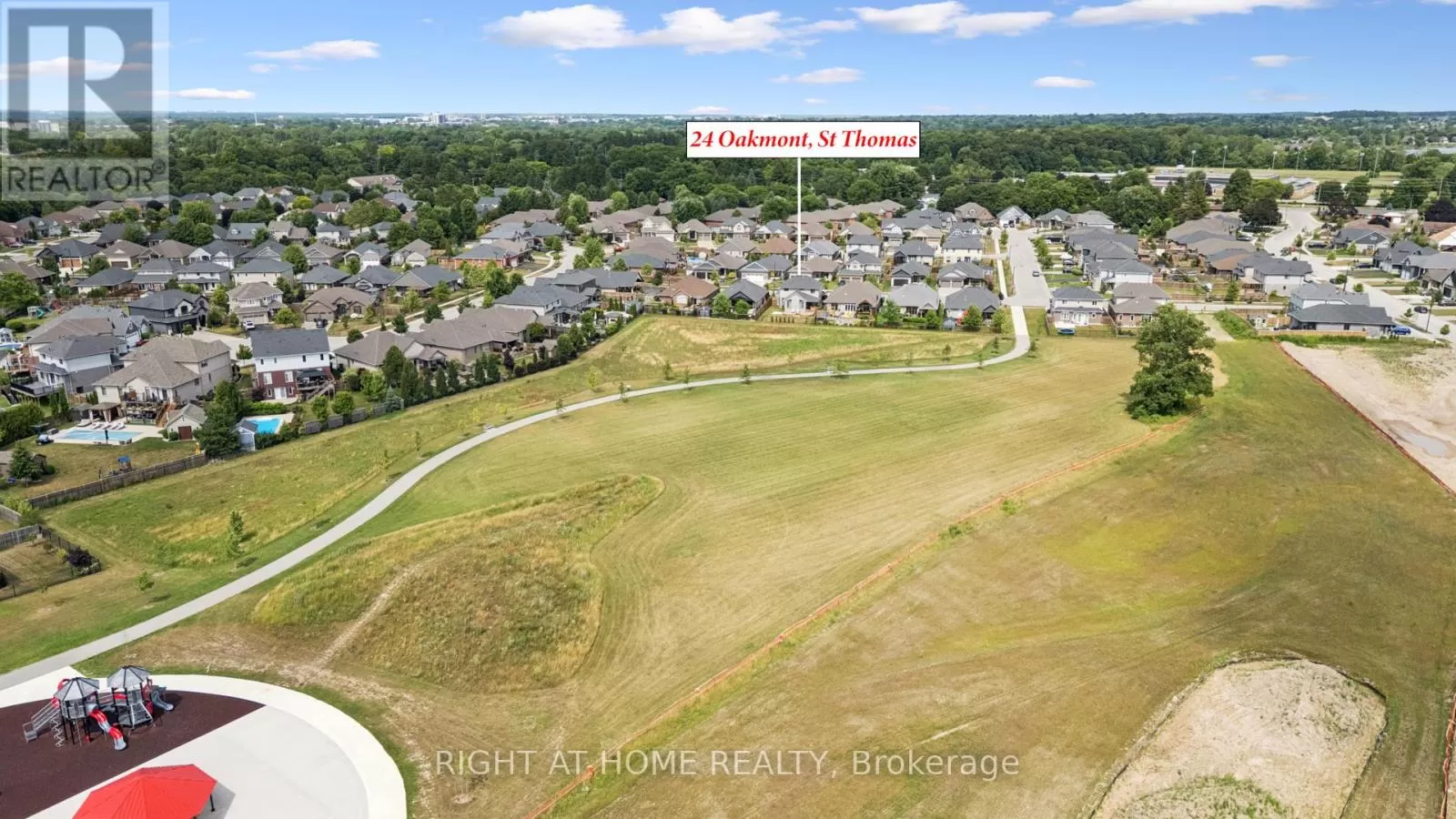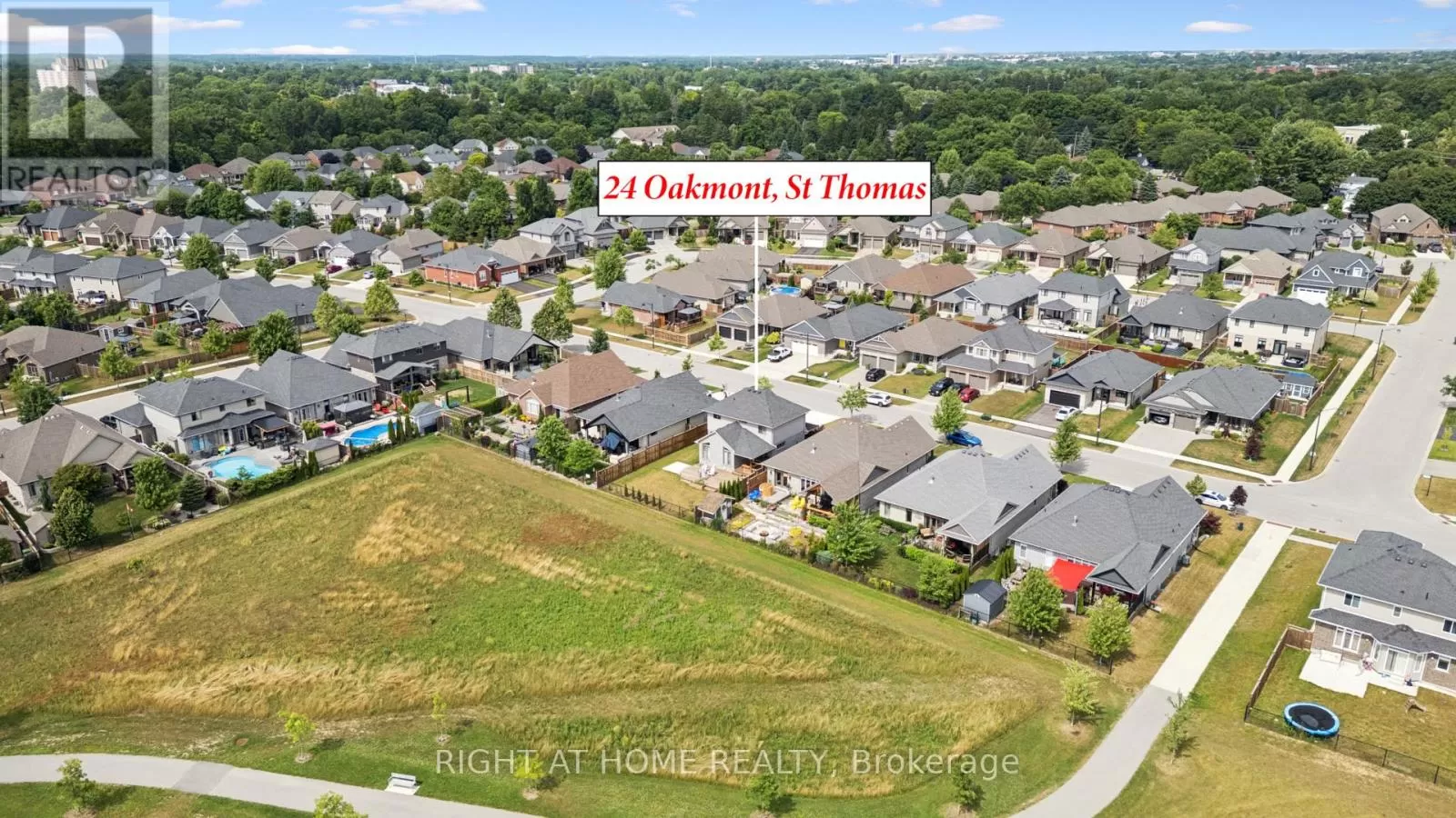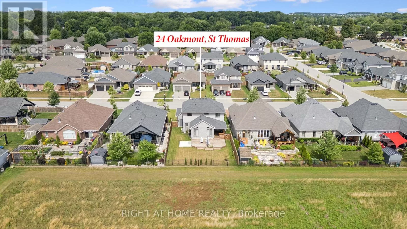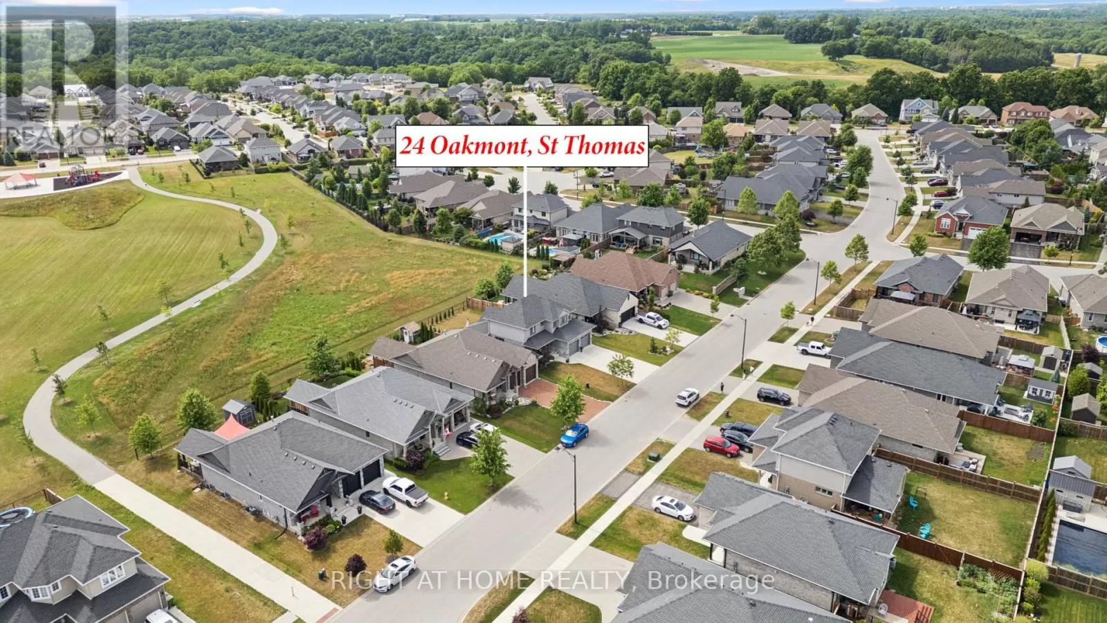 Shaw Valley Dr. and Oakmont St. Welcome to 24 Oakmont - a stylish and spacious 4+1 Bed, 2.5 Bath home on a premium lot in the sought after Shaw Valley Community. Backing onto peaceful city-owned greenspace and a proposed park, this MP Custom Home blends function and flair with a concrete driveway, covered front porch, and beautifully landscaped yard. The entertainer's backyard features a two-tier deck with ambient lighting, a live-edge bar, and gas BBQ hookup. Inside, enjoy an open concept main floor with soaring vaulted ceilings, a bright GCW kitchen with quartz counters, island, backsplash, pantry and a cozy living room with electric fireplace. A main floor office/bedroom and stylish 2 pc bath complete the level. Upstairs offers a laundry room, two spacious bedrooms, a 4pc bath, and a serene primary bedroom with walk-in closet and spa-like ensuite with glass shower and freestanding tub. The finished basement includes a rec room with 8'2" ceilings, an extra bedroom, rough-in bath, and storage. Steps to Daycare, close to Port Stanley Beach, close to 401, Amazon Fulfillment and just minutes from London! (id:27476)