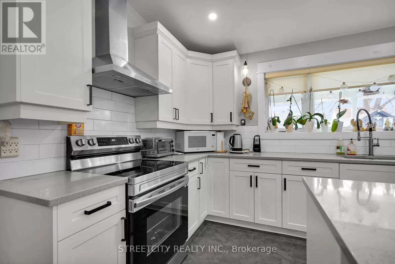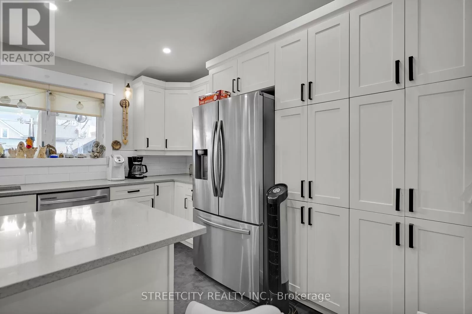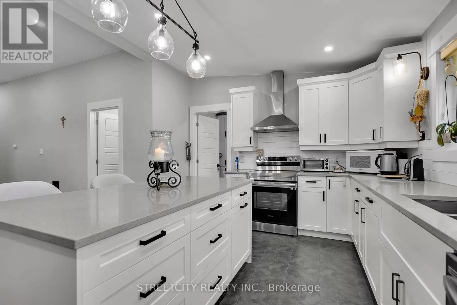 Cross Streets: Roos st. ** Directions: Wellington st. To Myrtle St. Move in Ready, To this solid brick and carpet free house. Offer 4 bedrooms, 2 bathrooms, single detached garage, plus one more carport garage, single long driveway for almost 4 cars. This property being fully renovated with numerous upgrades, including floors, bathrooms, doors, windows, furnace, A/C and gorgeous kitchen with plenty of cabinets, breakfast island, quarts countertops, open to dining room, and 3 bedroom, 3 pc. Bathroom, laundry room, and door leads to a covered patio. Second floor feature a good size recreation room and one bedroom with walk-in closet, 3 pc. Bathroom. Lower level offer an extra storage and space for futures uses. The house has an electric generator connected for ensuring peace of mind during power outages. Should see this spacious, bright and high ceiling property, everything in this house like brand new. Located in desirable area close to downtown, parks and schools, easy access to the highway and Port Stanley Beach. ALL appliances and hot water heater are included. (id:27476)