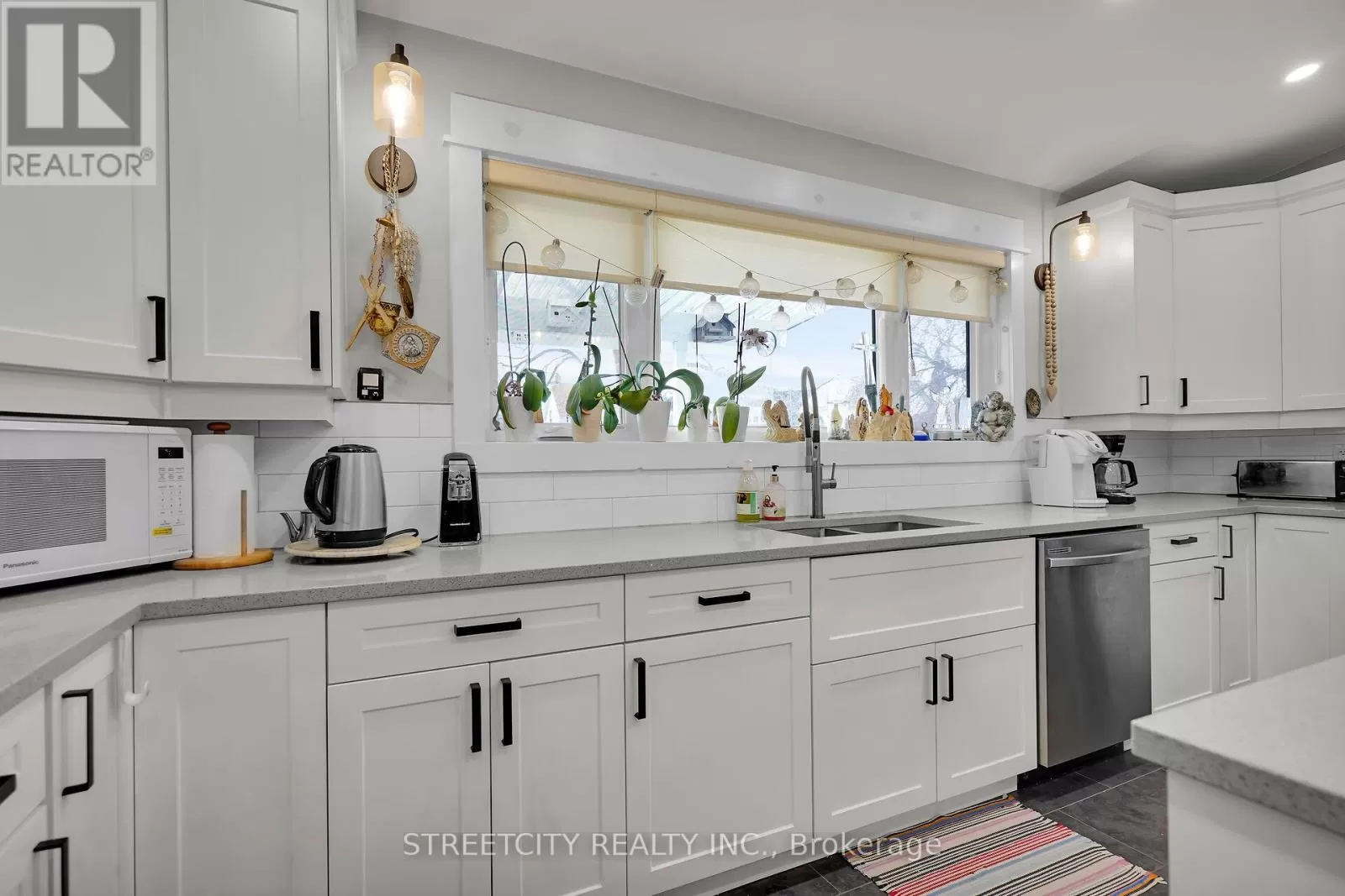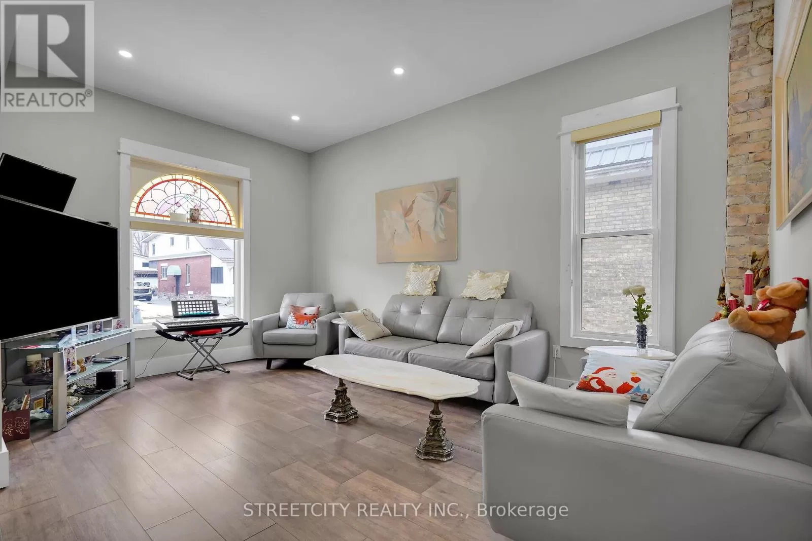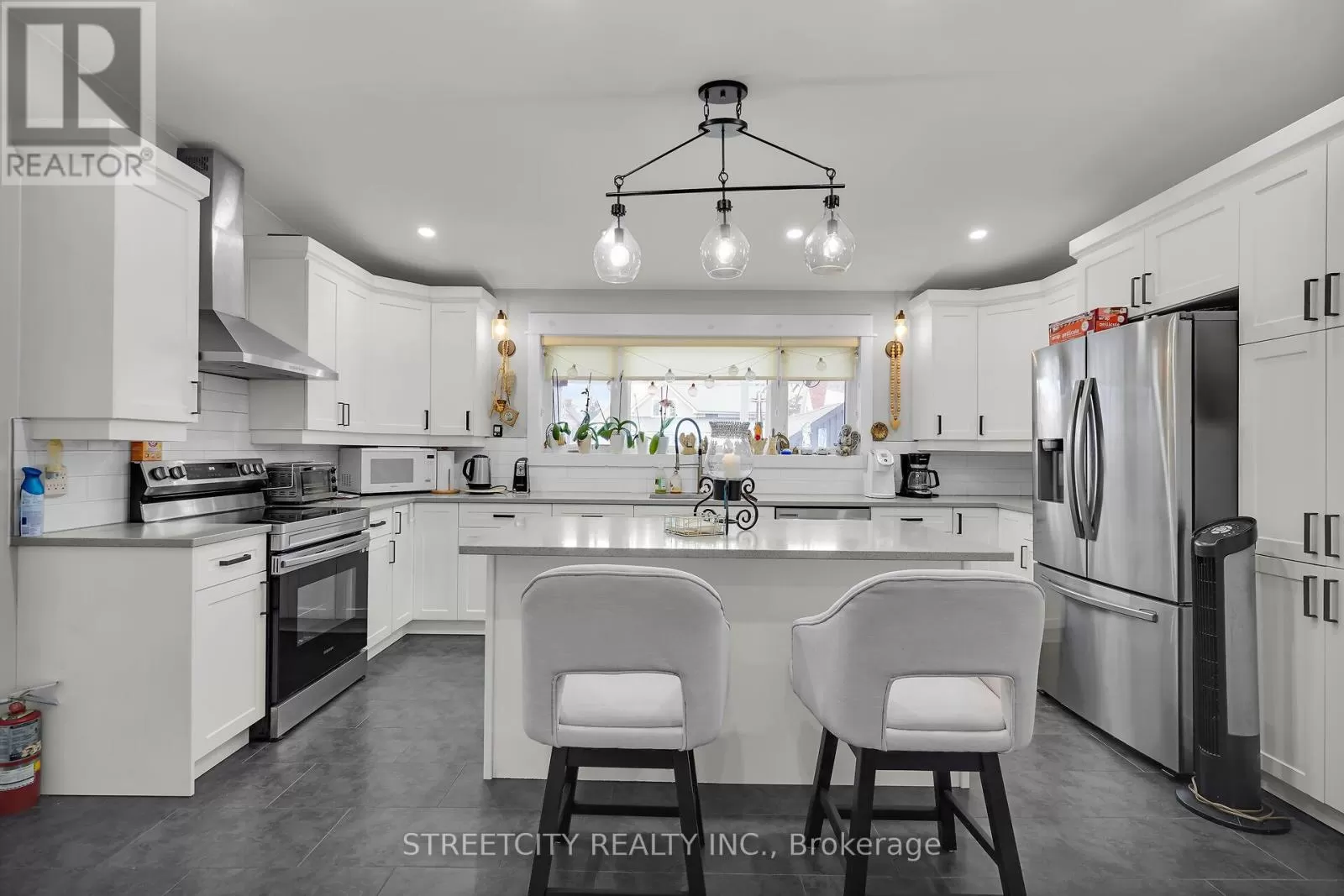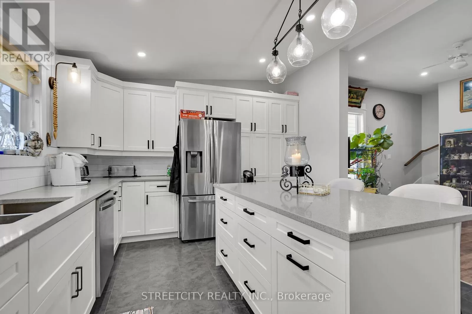 Cross Streets: Roos st. ** Directions: Wellington st. To Myrtle St. Move in Ready, To this solid brick and carpet free house. Offer 4 bedrooms, 2 bathrooms, single detached garage, plus one more carport garage, single long driveway for almost 4 cars. This property being fully renovated with numerous upgrades, including floors, bathrooms, doors, windows, furnace, A/C and gorgeous kitchen with plenty of cabinets, breakfast island, quarts countertops, open to dining room, and 3 bedroom, 3 pc. Bathroom, laundry room, and door leads to a covered patio. Second floor feature a good size recreation room and one bedroom with walk-in closet, 3 pc. Bathroom. Lower level offer an extra storage and space for futures uses. The house has an electric generator connected for ensuring peace of mind during power outages. Should see this spacious, bright and high ceiling property, everything in this house like brand new. Located in desirable area close to downtown, parks and schools, easy access to the highway and Port Stanley Beach. ALL appliances and hot water heater are included. (id:27476)
