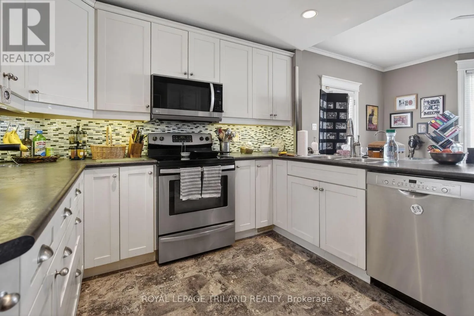 Cross Streets: East Street. ** Directions: Between East Street and East Pearl Street. Discover this inviting detached two storey home offering a wonderful blend of character and modern updates, ideal for families or first time buyers! The beautiful covered front porch creates a warm and inviting first impression and the perfect place to enjoy your morning coffee. Inside, the main floor welcomes you with a bright living room, a dedicated dining area, and a well designed kitchen, along with the convenience of main floor laundry. Upstairs, you will find a generous primary bedroom, two additional bedrooms, and a four piece bathroom, providing comfortable and functional living space. The unfinished basement offers excellent potential for storage, a workshop, or future customization to suit your needs. Step outside to a fully fenced yard and enjoy summer evenings on the covered deck, ideal for relaxing or entertaining. Ideally located close to parks, downtown amenities, and offering an easy commute to London and Port Stanley, this charming property perfectly balances tranquility with everyday convenience. (id:27476)