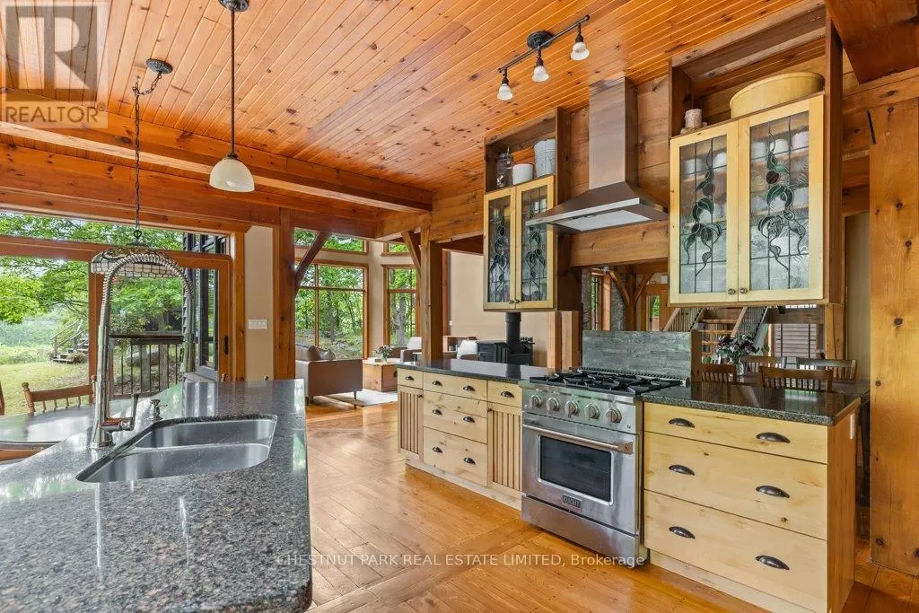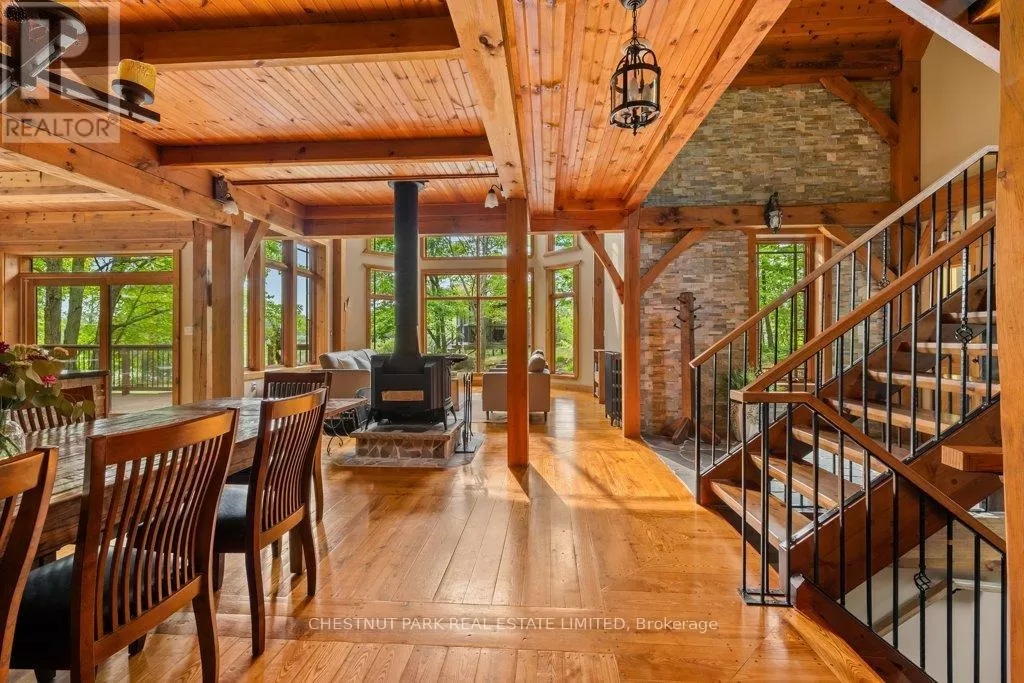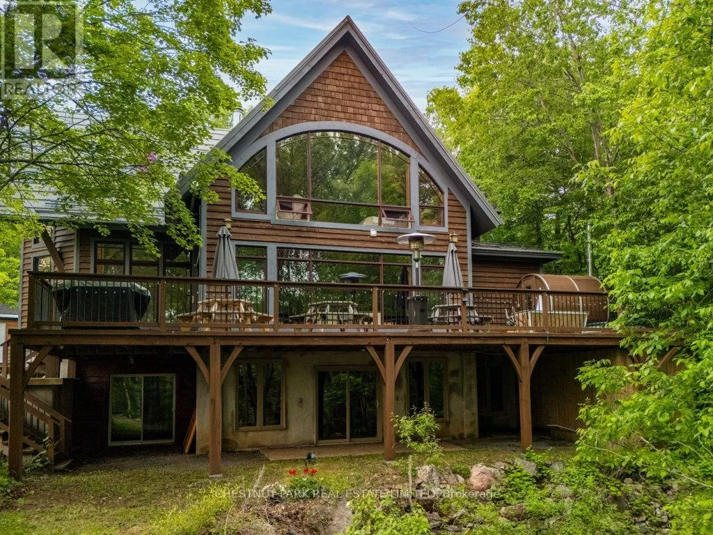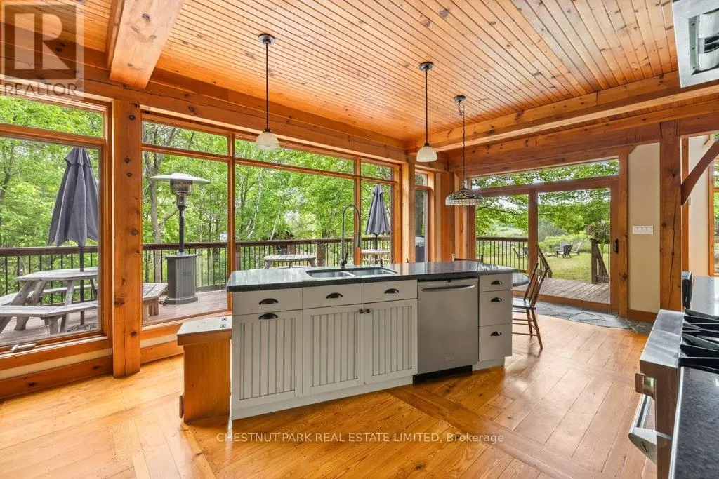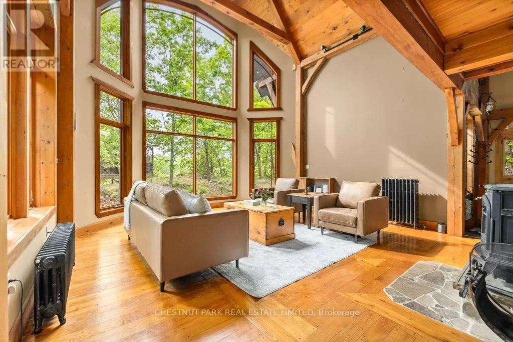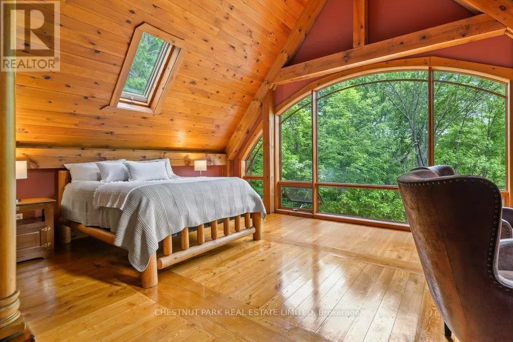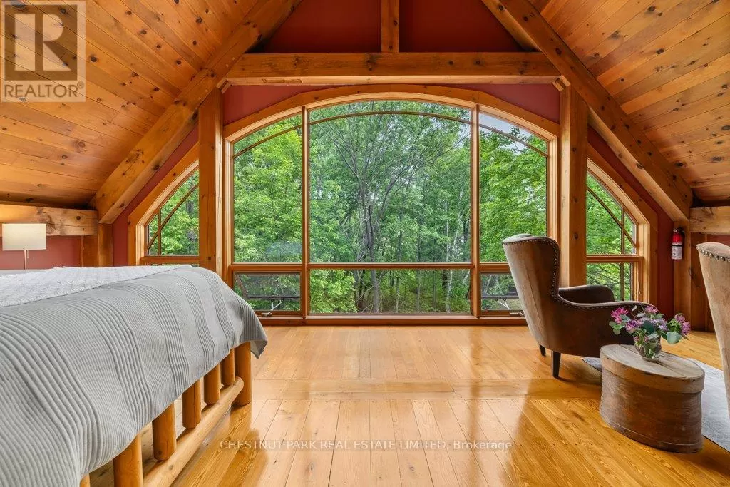 Cross Streets: Highway 15 and Highway 4. ** Directions: County Rd 4 to Highway 15. Go north on Highway 15 to Gull Creek Ln, turn left and go 2km to 488. Welcome home to 488 Gull Creek Lane! A stunning timber frame home that features over 4,000 sq ft of living space, 5 bedrooms, 3 bathrooms on the crystal-clear waters of Sheffield Long Lake, just north of Tamworth. Expertly crafted with true timber joinery and no nails, this one-of-a-kind architectural gem features soaring cathedral ceilings, massive floor-to-ceiling windows, beautiful hardwood floors, and an open-concept layout filled with natural light. The chef's kitchen offers granite countertops, stainless steel appliances, and abundant workspace, flowing seamlessly to a wrap-around deck complete with sauna, hot tub, cold plunge, BBQ, and plenty of seating. The walkout basement includes a large rec room, two additional bedrooms, and a flex space ideal for a gym or studio. Enjoy two acres of property with over 350 feet of pristine private waterfront with a large dock and swim platform, plus a charming bunkie/art studio and a screened, covered patio perfect for entertaining. Completely off-grid, this property boasts a $100K solar and battery system, radiant in-floor heating, a drilled well, and a metal roof for year-round comfort. Located just 2h 45m from Toronto, 2h from Ottawa, and 45 minutes from Kingston, this is lakeside living at its finest! (id:27476)