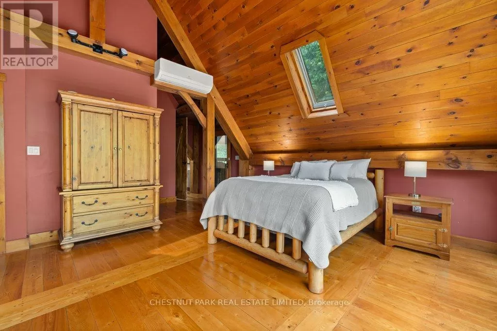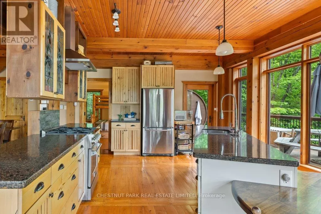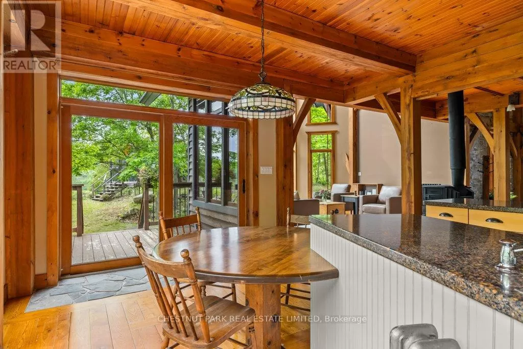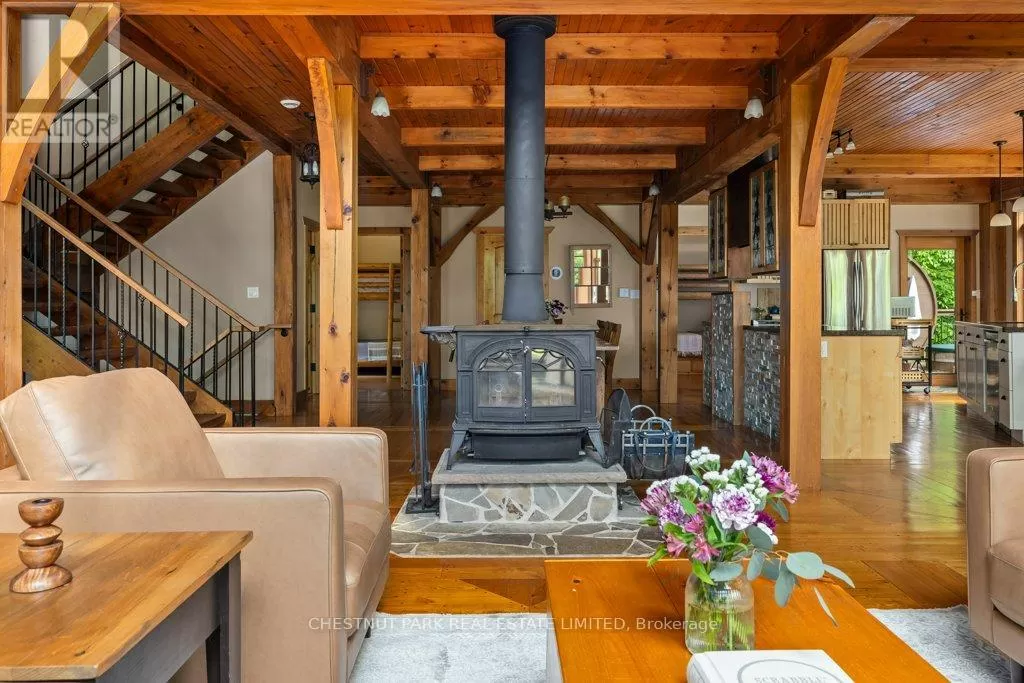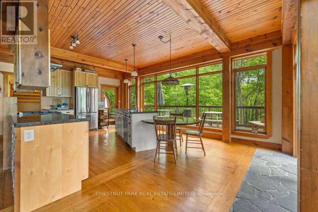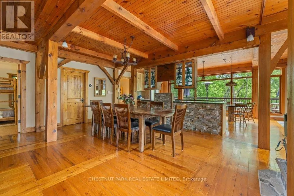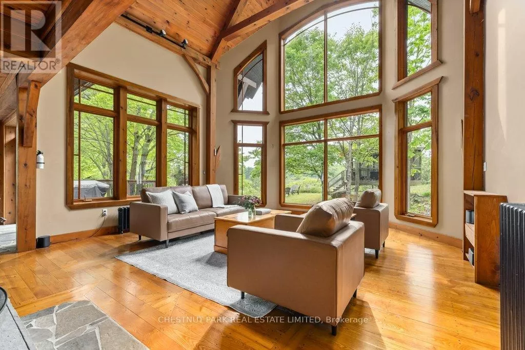 Cross Streets: Highway 15 and Highway 4. ** Directions: County Rd 4 to Highway 15. Go north on Highway 15 to Gull Creek Ln, turn left and go 2km to 488. Welcome home to 488 Gull Creek Lane! A stunning timber frame home that features over 4,000 sq ft of living space, 5 bedrooms, 3 bathrooms on the crystal-clear waters of Sheffield Long Lake, just north of Tamworth. Expertly crafted with true timber joinery and no nails, this one-of-a-kind architectural gem features soaring cathedral ceilings, massive floor-to-ceiling windows, beautiful hardwood floors, and an open-concept layout filled with natural light. The chef's kitchen offers granite countertops, stainless steel appliances, and abundant workspace, flowing seamlessly to a wrap-around deck complete with sauna, hot tub, cold plunge, BBQ, and plenty of seating. The walkout basement includes a large rec room, two additional bedrooms, and a flex space ideal for a gym or studio. Enjoy two acres of property with over 350 feet of pristine private waterfront with a large dock and swim platform, plus a charming bunkie/art studio and a screened, covered patio perfect for entertaining. Completely off-grid, this property boasts a $100K solar and battery system, radiant in-floor heating, a drilled well, and a metal roof for year-round comfort. Located just 2h 45m from Toronto, 2h from Ottawa, and 45 minutes from Kingston, this is lakeside living at its finest! (id:27476)