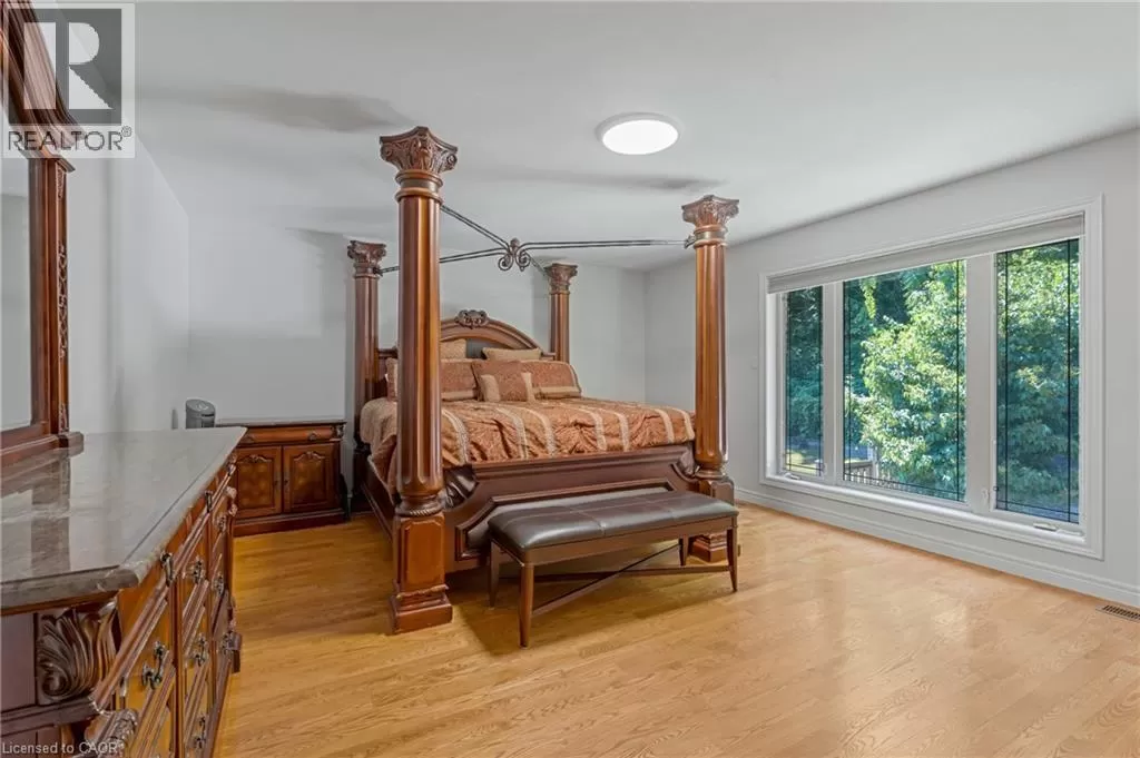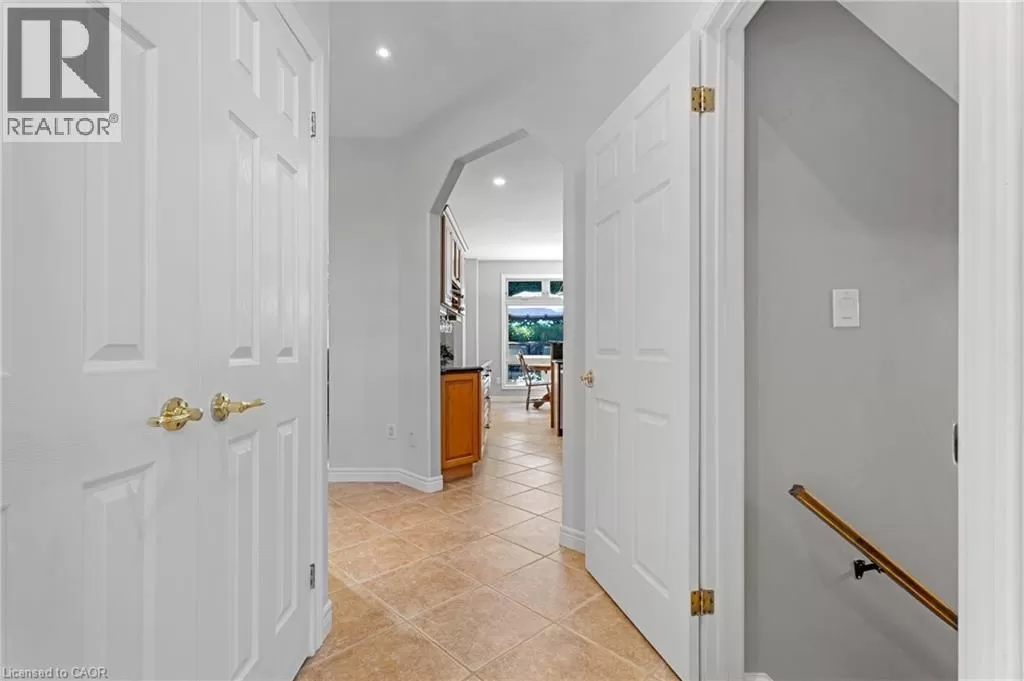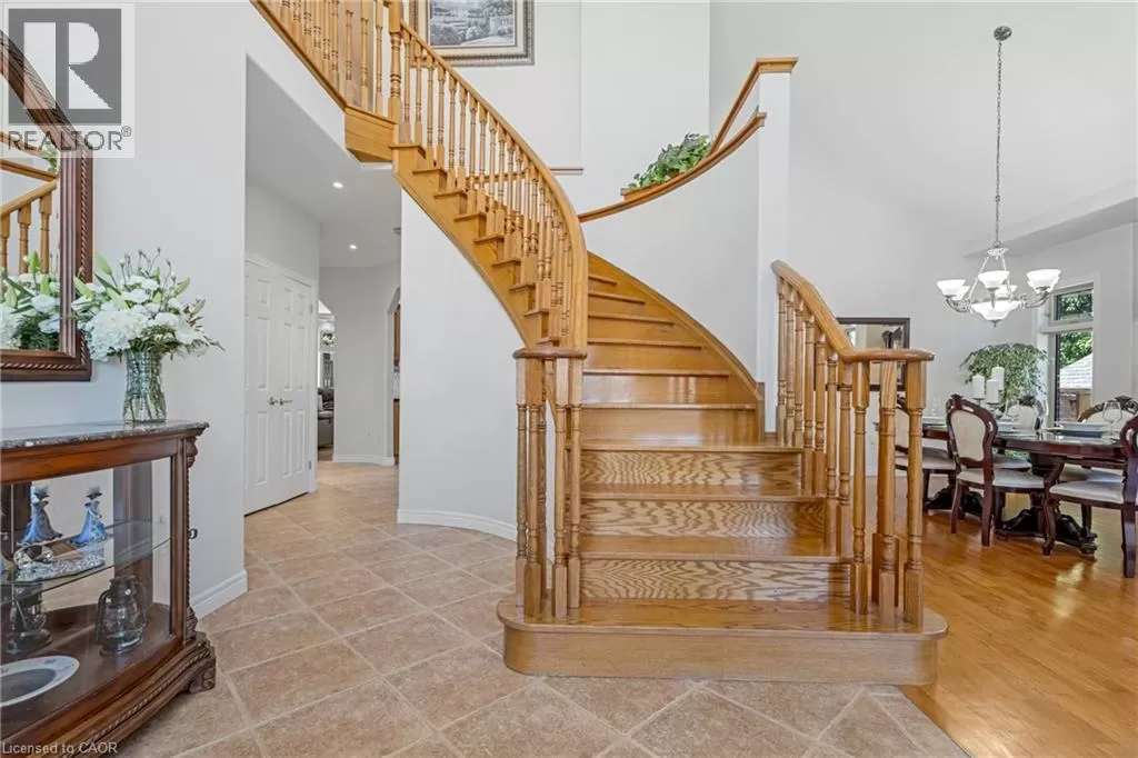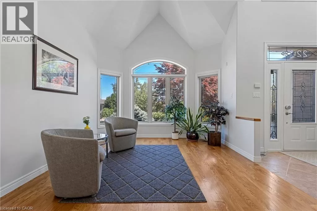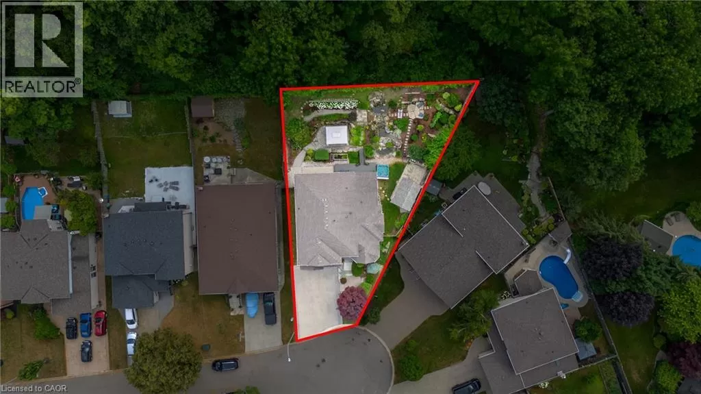 Hwy 8 to Regal view to Shadeland Custom built in 2003 and nestled beneath the Niagara Escarpment on a quiet crescent, this meticulously maintained 4+1 bedroom home offers breathtaking views and a tranquil, cottage-like setting. Soaring ceilings, oversized windows, and rounded corners add elegance and natural light throughout. The freshly painted interior features new kitchen appliances with gas cooktop option, all under a 5-year warranty. The spacious primary bedroom features a two-sided gas fireplace shared with the spa like ensuite creating the ultimate retreat. Walk-in closets in every bedroom, central vac, RO water at all sinks, and two fruit cellars enhance everyday living. The finished basement with 9ft ceilings, separate entrance, and roughed-in kitchen offers in-law or income potential. Step outside to a pie-shaped private lot backing onto lush green space with a multi-tiered waterfall and hot tubâa true backyard oasis. The oversized exposed aggregate driveway fits 6 cars. Move-in ready and surrounded by nature, this home combines comfort, luxury, and lifestyle in one exceptional package. (id:27476)