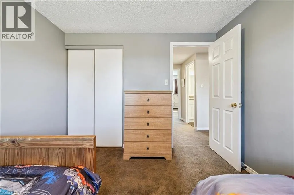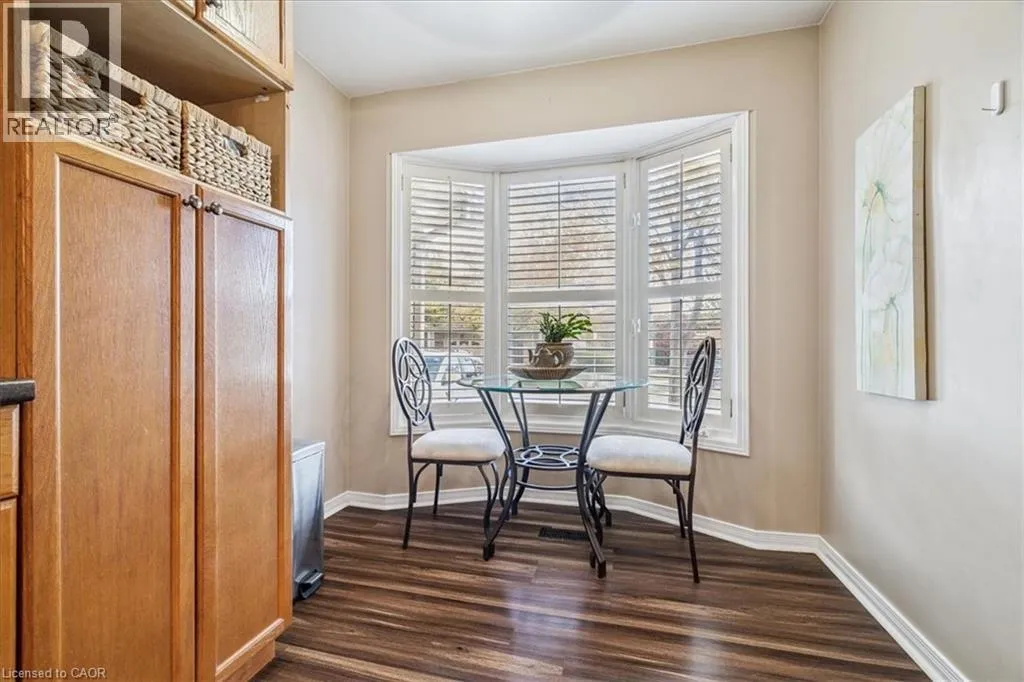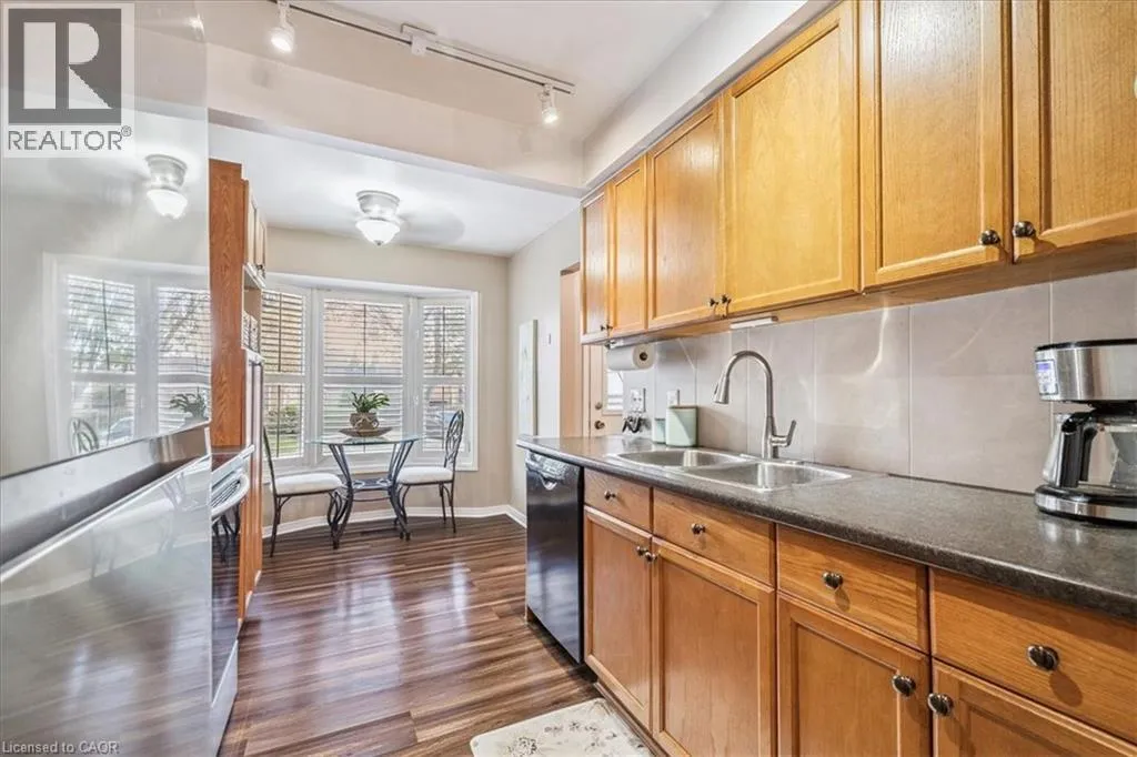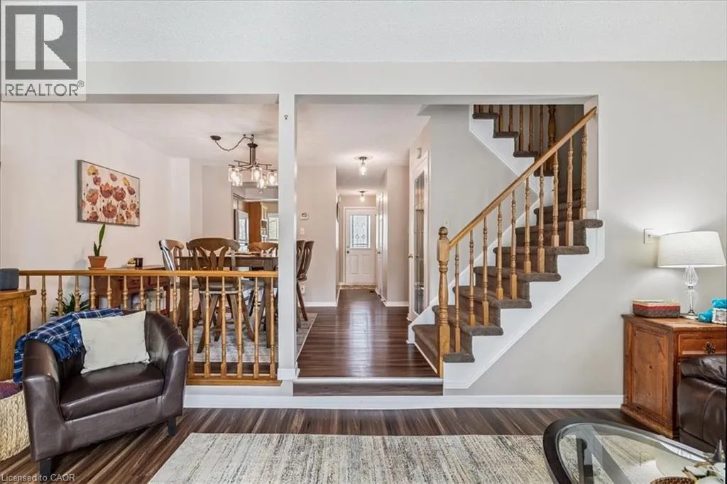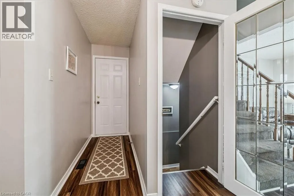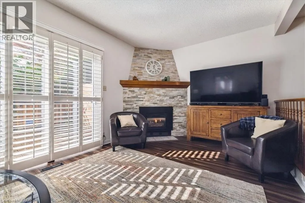 Highway #8 to Ellington Ave, left before Darrow Dr Beautiful turn-key end-unit townhouse in a sought-after Stoney Creek location! This quiet, well-maintained complex is conveniently close to the QEW, schools, and public transit. Start your mornings with coffee by the large front window of your bright eat-in kitchen, featuring ample counter and storage space plus stainless steel appliances. The open-concept living and dining area is perfect for entertaining, highlighted by a stunning gas fireplace with a floor-to-ceiling stone surround and wood mantle. Open the California shutters to fill the space with natural light from your private, landscaped backyard with exterior access. Step out onto the deck to BBQ and relax under the automatic retractable awning. Upstairs, youâll find three spacious bedrooms and a renovated main bathroom with a skylight and makeup counter. The finished basement offers a large rec room, laundry area, and plenty of storage. The single-car garage includes inside entry and direct access to the back deck. Condo fees cover exterior property maintenance, insurance, parking, and water! (id:27476)