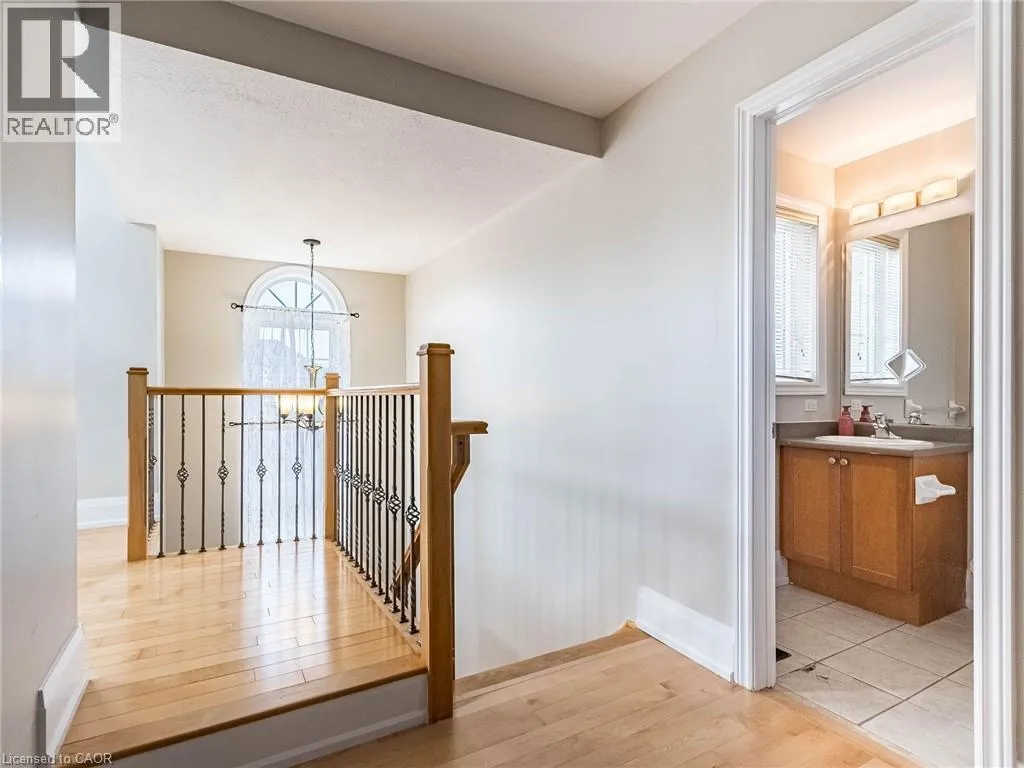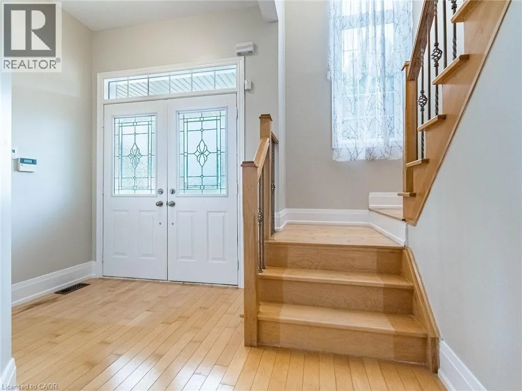 Fifty Road north of QEW Immaculate 4-Bedroom Detached Home in Desirable Lake Point Community. Welcome to this stunning 4-bedroom detached family home nestled in the quiet and highly sought-after Lake Point community. This impressive stone, stucco, and brick residence sits on beautifully landscaped corner lot, offering exceptional curb appeal and approximately 2,500 s ft. of elegant living space. Step up to the charming front porch and through the double-door entry into an open-concept foyer with soaring 9 ft. ceilings on the main floor. The home features hardwood floors, smoot ceilings, and has been freshly painted in neutral tones, creating a warm and inviting atmosphere throughout. The main floor boasts a spacious formal living and dining area filled with natural light from the many extra windows. The family room features a cozy gas fireplace, perfect for relaxing evenings. The modern kitchen offers convenient access to the backyard and an entrance from the double-car garage enhances everyday functionality. Upstairs, the elegant oak staircase with metal railings leads to four generous bedrooms, including a huge primary suite complete with a 5-piece ensuite and walk-in closet. The second floor also includes a bright den and a convenient laundry room. Located just steps away from Lake Point Park, The Yacht Club, 50 Point Marina, scenic walking trails, and the breathtaking shores of Lake Ontario, this home combines tranquility with convenience. Enjoy easy access to parks, shopping, schools, and the QEW. Highlights: 4 Spacious bedrooms + Bright Den, 2.5 bathrooms including a luxurious 5-piece ensuite, Double-Car garage with inside entry. Hardwood floors and smooth ceilings throughout, Fresh neutral paint, modern finishes, and abundant natural light, prime corner lot in a quiet, family-friendly neighborhood. (id:27476)
