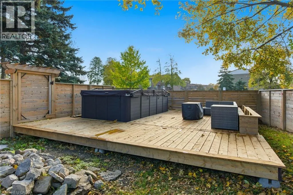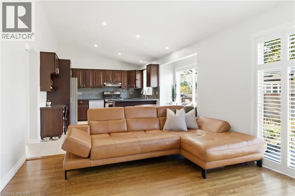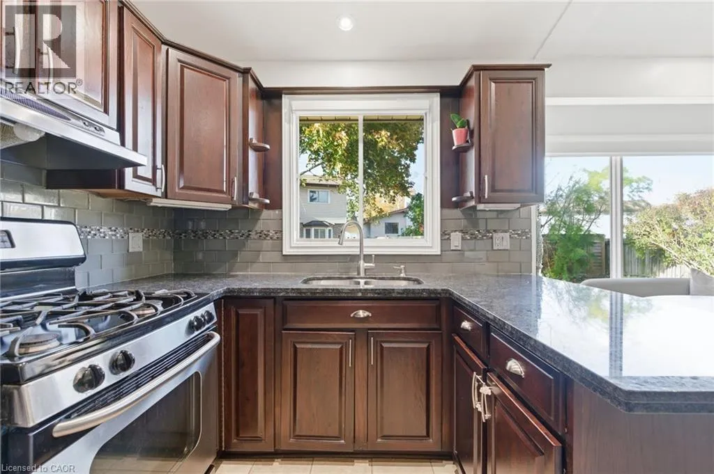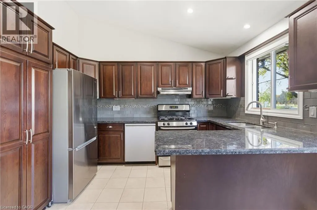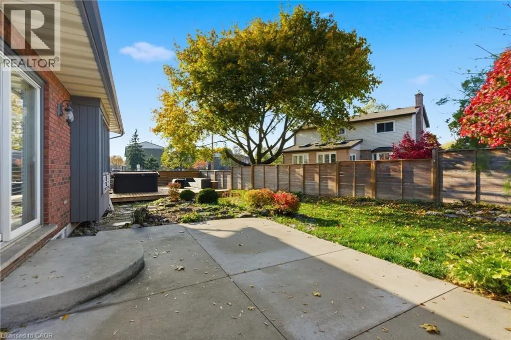 From Mud St. W. go north on Paramount Dr. right on Auckland. Great family home steps to schools/parks, Felker's Falls, close to shopping, rec centre, library, arena and great Hwy access. Numerous updates Inc. Windows, bathrooms (24') etc. Open concept kitchen/family room with granite counter tops, refurbished wood burning fireplace leading to stunning fenced backyard private gardens & concrete patio. Separate formal dining room & main floor Laundry. HW thru-out. 3 good size bedrooms with updated Master bedroom ensuite. Swim Spa and all accessories. Stunning new 5pce. Roof (14'), Furnace (21'), some windows (24'). R/I C/V, laundry in basement. (id:27476)