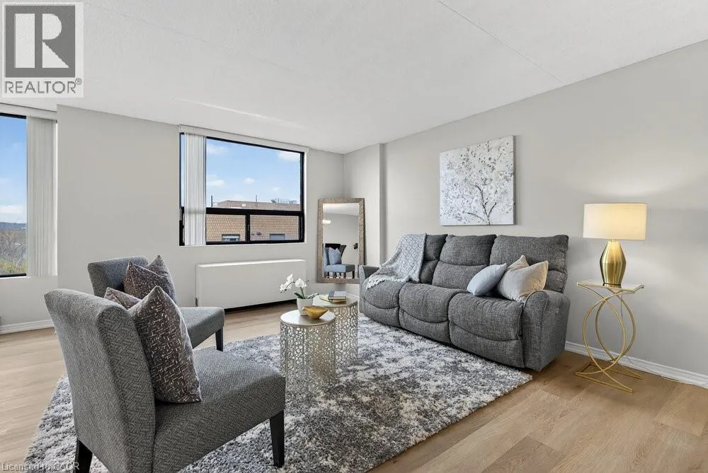 west on Highway #8 - left onto Donn Ave Highly sought-after Florentine building just steps from public transit, Confederation GO Station, shopping, dining, pharmacies, and countless everyday conveniences. This bright and spacious west-facing unit offers beautiful sunsets, featuring 2 bedrooms, 2 bathrooms, a massive living area, huge kitchen, and more. Enjoy open-concept living and dining areas with stylish hardwood-look vinyl flooring, and an eat-in kitchen with ample cabinetry and counter space. The generously sized primary bedroom easily fits a king-size suite and includes a 3-piece ensuite with a step-in shower and an extra linen closet. The second bedroom is also spacious, and the main bath features a relaxing tub to soak in. In-suite laundry adds everyday convenience. The building offers excellent amenities including a fitness room, party room, games room, rooftop patio & underground parking. A prime location with everything at your doorstep-this is one you won't want to miss! (id:27476)