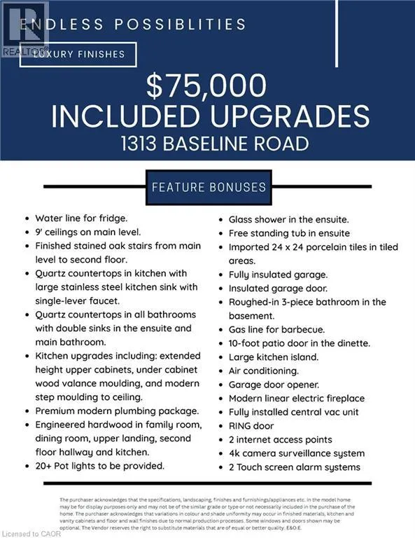 BASELINE & WINONA ROAD This stunning brand-new, 2,694 sq. ft. home offers the perfect combination of modern design, spacious living, and an unbeatable location. Situated on a generous lot within walking distance to Lake Ontario and nearby parks, this home provides a serene setting while offering convenient access to highways for easy commuting. With 4 bedrooms and 2.5 bathrooms, this thoughtfully designed layout is perfect for families, entertaining, and everyday comfort. Inside, the open-concept floor plan features a gourmet kitchen with premium appliances, a large island, and quartz countertops that flow seamlessly into the bright and inviting living space. The luxurious primary suite boasts a spa-like ensuite with a soaker tub and glass shower, while the additional bedrooms offer ample space and natural light. Large windows throughout the home create an airy atmosphere, enhancing the modern aesthetic. This property also comes equipped with a range of upgraded features for your comfort and peace of mind, including a built-in security system with 4 exterior cameras, upgraded Wi-Fi pods installed throughout the entire home for optimal connectivity, and energy-efficient finishes. A spacious double-car garage, upgraded flooring, and designer fixtures throughout add even more value to this move-in-ready home. From its prime location to its luxury upgrades and customizable finishes, this home is a rare opportunity to create a space that truly feels like your own. Donât miss your chance to own a beautiful new construction home in a sought-after neighbourhoodâcontact us today for more details! (id:27476)